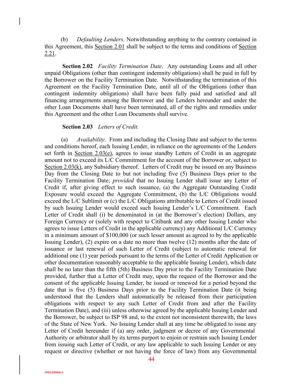 (b) Defaulting Lenders. Notwithstanding anything to the contrary contained in this Agreement, this Section 2.01 shall be subject to the terms and conditions of Section 2.21. Section 2.02 Facility Termination Date. Any outstanding Loans and all other unpaid Obligations (other than contingent indemnity obligations) shall be paid in full by the Borrower on the Facility Termination Date. Notwithstanding the termination of this Agreement on the Facility Termination Date, until all of the Obligations (other than contingent indemnity obligations) shall have been fully paid and satisfied and all financing arrangements among the Borrower and the Lenders hereunder and under the other Loan Documents shall have been terminated, all of the rights and remedies under this Agreement and the other Loan Documents shall survive. Section 2.03 Letters of Credit. (a) Availability. From and including the Closing Date and subject to the terms and conditions hereof, each Issuing Lender, in reliance on the agreements of the Lenders set forth in Section 2.03(e), agrees to issue standby Letters of Credit in an aggregate amount not to exceed its L/C Commitment for the account of the Borrower or, subject to Section 2.03(k), any Subsidiary thereof. Letters of Credit may be issued on any Business Day from the Closing Date to but not including five (5) Business Days prior to the Facility Termination Date; provided that no Issuing Lender shall issue any Letter of Credit if, after giving effect to such issuance, (a) the Aggregate Outstanding Credit Exposure would exceed the Aggregate Commitment, (b) the L/C Obligations would exceed the L/C Sublimit or (c) the L/C Obligations attributable to Letters of Credit issued by such Issuing Lender would exceed such Issuing Lender’s L/C Commitment. Each Letter of Credit shall (i) be denominated in (at the Borrower’s election) Dollars, any Foreign Currency or (solely with respect to Citibank and any other Issuing Lender who agrees to issue Letters of Credit in the applicable currency) any Additional L/C Currency in a minimum amount of $100,000 (or such lesser amount as agreed to by the applicable Issuing Lender), (2) expire on a date no more than twelve (12) months after the date of issuance or last renewal of such Letter of Credit (subject to automatic renewal for additional one (1) year periods pursuant to the terms of the Letter of Credit Application or other documentation reasonably acceptable to the applicable Issuing Lender), which date shall be no later than the fifth (5th) Business Day prior to the Facility Termination Date provided, further that a Letter of Credit may, upon the request of the Borrower and the consent of the applicable Issuing Lender, be issued or renewed for a period beyond the date that is five (5) Business Days prior to the Facility Termination Date (it being understood that the Lenders shall automatically be released from their participation obligations with respect to any such Letter of Credit from and after the Facility Termination Date), and (iii) unless otherwise agreed by the applicable Issuing Lender and the Borrower, be subject to ISP 98 and, to the extent not inconsistent therewith, the laws of the State of New York. No Issuing Lender shall at any time be obligated to issue any Letter of Credit hereunder if (a) any order, judgment or decree of any Governmental Authority or arbitrator shall by its terms purport to enjoin or restrain such Issuing Lender from issuing such Letter of Credit, or any law applicable to such Issuing Lender or any request or directive (whether or not having the force of law) from any Governmental 44 #98230960v1