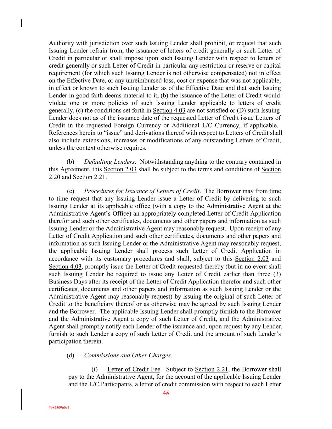 Authority with jurisdiction over such Issuing Lender shall prohibit, or request that such Issuing Lender refrain from, the issuance of letters of credit generally or such Letter of Credit in particular or shall impose upon such Issuing Lender with respect to letters of credit generally or such Letter of Credit in particular any restriction or reserve or capital requirement (for which such Issuing Lender is not otherwise compensated) not in effect on the Effective Date, or any unreimbursed loss, cost or expense that was not applicable, in effect or known to such Issuing Lender as of the Effective Date and that such Issuing Lender in good faith deems material to it, (b) the issuance of the Letter of Credit would violate one or more policies of such Issuing Lender applicable to letters of credit generally, (c) the conditions set forth in Section 4.03 are not satisfied or (D) such Issuing Lender does not as of the issuance date of the requested Letter of Credit issue Letters of Credit in the requested Foreign Currency or Additional L/C Currency, if applicable. References herein to “issue” and derivations thereof with respect to Letters of Credit shall also include extensions, increases or modifications of any outstanding Letters of Credit, unless the context otherwise requires. (b) Defaulting Lenders. Notwithstanding anything to the contrary contained in this Agreement, this Section 2.03 shall be subject to the terms and conditions of Section 2.20 and Section 2.21. (c) Procedures for Issuance of Letters of Credit. The Borrower may from time to time request that any Issuing Lender issue a Letter of Credit by delivering to such Issuing Lender at its applicable office (with a copy to the Administrative Agent at the Administrative Agent’s Office) an appropriately completed Letter of Credit Application therefor and such other certificates, documents and other papers and information as such Issuing Lender or the Administrative Agent may reasonably request. Upon receipt of any Letter of Credit Application and such other certificates, documents and other papers and information as such Issuing Lender or the Administrative Agent may reasonably request, the applicable Issuing Lender shall process such Letter of Credit Application in accordance with its customary procedures and shall, subject to this Section 2.03 and Section 4.03, promptly issue the Letter of Credit requested thereby (but in no event shall such Issuing Lender be required to issue any Letter of Credit earlier than three (3) Business Days after its receipt of the Letter of Credit Application therefor and such other certificates, documents and other papers and information as such Issuing Lender or the Administrative Agent may reasonably request) by issuing the original of such Letter of Credit to the beneficiary thereof or as otherwise may be agreed by such Issuing Lender and the Borrower. The applicable Issuing Lender shall promptly furnish to the Borrower and the Administrative Agent a copy of such Letter of Credit, and the Administrative Agent shall promptly notify each Lender of the issuance and, upon request by any Lender, furnish to such Lender a copy of such Letter of Credit and the amount of such Lender’s participation therein. (d) Commissions and Other Charges. (i) Letter of Credit Fee. Subject to Section 2.21, the Borrower shall pay to the Administrative Agent, for the account of the applicable Issuing Lender and the L/C Participants, a letter of credit commission with respect to each Letter 45 #98230960v1
