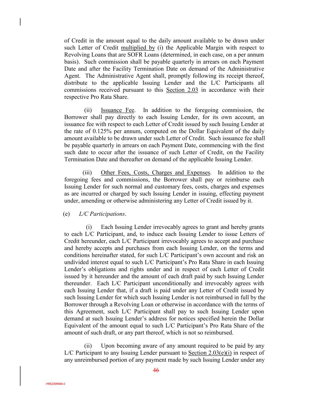 of Credit in the amount equal to the daily amount available to be drawn under such Letter of Credit multiplied by (i) the Applicable Margin with respect to Revolving Loans that are SOFR Loans (determined, in each case, on a per annum basis). Such commission shall be payable quarterly in arrears on each Payment Date and after the Facility Termination Date on demand of the Administrative Agent. The Administrative Agent shall, promptly following its receipt thereof, distribute to the applicable Issuing Lender and the L/C Participants all commissions received pursuant to this Section 2.03 in accordance with their respective Pro Rata Share. (ii) Issuance Fee. In addition to the foregoing commission, the Borrower shall pay directly to each Issuing Lender, for its own account, an issuance fee with respect to each Letter of Credit issued by such Issuing Lender at the rate of 0.125% per annum, computed on the Dollar Equivalent of the daily amount available to be drawn under such Letter of Credit. Such issuance fee shall be payable quarterly in arrears on each Payment Date, commencing with the first such date to occur after the issuance of such Letter of Credit, on the Facility Termination Date and thereafter on demand of the applicable Issuing Lender. (iii) Other Fees, Costs, Charges and Expenses. In addition to the foregoing fees and commissions, the Borrower shall pay or reimburse each Issuing Lender for such normal and customary fees, costs, charges and expenses as are incurred or charged by such Issuing Lender in issuing, effecting payment under, amending or otherwise administering any Letter of Credit issued by it. (e) L/C Participations. (i) Each Issuing Lender irrevocably agrees to grant and hereby grants to each L/C Participant, and, to induce each Issuing Lender to issue Letters of Credit hereunder, each L/C Participant irrevocably agrees to accept and purchase and hereby accepts and purchases from each Issuing Lender, on the terms and conditions hereinafter stated, for such L/C Participant’s own account and risk an undivided interest equal to such L/C Participant’s Pro Rata Share in each Issuing Lender’s obligations and rights under and in respect of each Letter of Credit issued by it hereunder and the amount of each draft paid by such Issuing Lender thereunder. Each L/C Participant unconditionally and irrevocably agrees with each Issuing Lender that, if a draft is paid under any Letter of Credit issued by such Issuing Lender for which such Issuing Lender is not reimbursed in full by the Borrower through a Revolving Loan or otherwise in accordance with the terms of this Agreement, such L/C Participant shall pay to such Issuing Lender upon demand at such Issuing Lender’s address for notices specified herein the Dollar Equivalent of the amount equal to such L/C Participant’s Pro Rata Share of the amount of such draft, or any part thereof, which is not so reimbursed. (ii) Upon becoming aware of any amount required to be paid by any L/C Participant to any Issuing Lender pursuant to Section 2.03(e)(i) in respect of any unreimbursed portion of any payment made by such Issuing Lender under any 46 #98230960v1