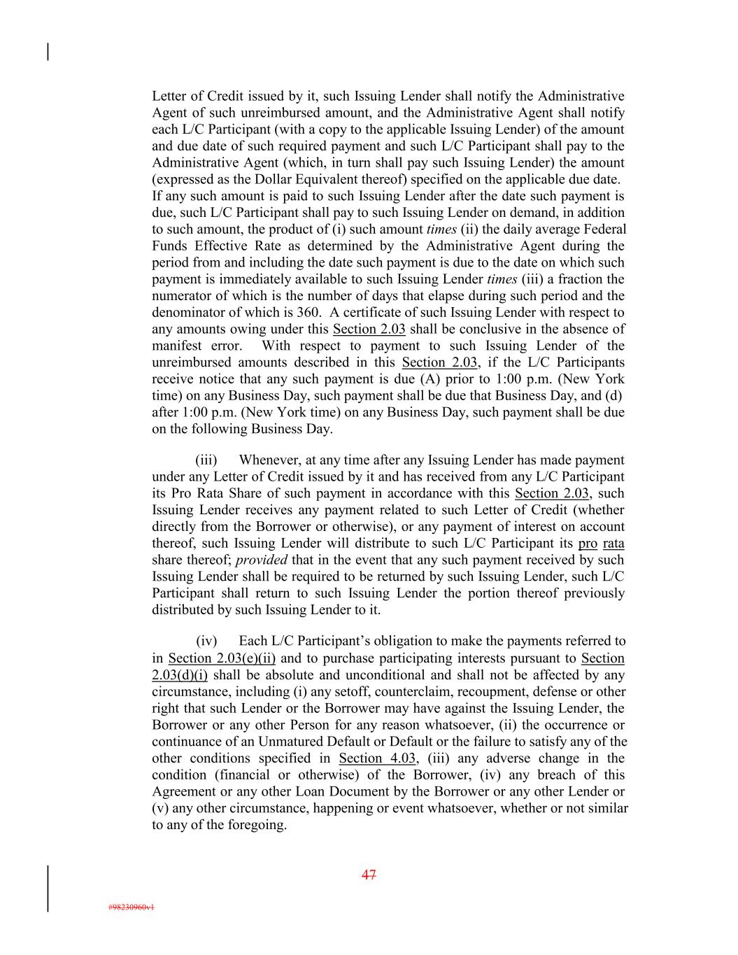 Letter of Credit issued by it, such Issuing Lender shall notify the Administrative Agent of such unreimbursed amount, and the Administrative Agent shall notify each L/C Participant (with a copy to the applicable Issuing Lender) of the amount and due date of such required payment and such L/C Participant shall pay to the Administrative Agent (which, in turn shall pay such Issuing Lender) the amount (expressed as the Dollar Equivalent thereof) specified on the applicable due date. If any such amount is paid to such Issuing Lender after the date such payment is due, such L/C Participant shall pay to such Issuing Lender on demand, in addition to such amount, the product of (i) such amount times (ii) the daily average Federal Funds Effective Rate as determined by the Administrative Agent during the period from and including the date such payment is due to the date on which such payment is immediately available to such Issuing Lender times (iii) a fraction the numerator of which is the number of days that elapse during such period and the denominator of which is 360. A certificate of such Issuing Lender with respect to any amounts owing under this Section 2.03 shall be conclusive in the absence of manifest error. With respect to payment to such Issuing Lender of the unreimbursed amounts described in this Section 2.03, if the L/C Participants receive notice that any such payment is due (A) prior to 1:00 p.m. (New York time) on any Business Day, such payment shall be due that Business Day, and (d) after 1:00 p.m. (New York time) on any Business Day, such payment shall be due on the following Business Day. (iii) Whenever, at any time after any Issuing Lender has made payment under any Letter of Credit issued by it and has received from any L/C Participant its Pro Rata Share of such payment in accordance with this Section 2.03, such Issuing Lender receives any payment related to such Letter of Credit (whether directly from the Borrower or otherwise), or any payment of interest on account thereof, such Issuing Lender will distribute to such L/C Participant its pro rata share thereof; provided that in the event that any such payment received by such Issuing Lender shall be required to be returned by such Issuing Lender, such L/C Participant shall return to such Issuing Lender the portion thereof previously distributed by such Issuing Lender to it. (iv) Each L/C Participant’s obligation to make the payments referred to in Section 2.03(e)(ii) and to purchase participating interests pursuant to Section 2.03(d)(i) shall be absolute and unconditional and shall not be affected by any circumstance, including (i) any setoff, counterclaim, recoupment, defense or other right that such Lender or the Borrower may have against the Issuing Lender, the Borrower or any other Person for any reason whatsoever, (ii) the occurrence or continuance of an Unmatured Default or Default or the failure to satisfy any of the other conditions specified in Section 4.03, (iii) any adverse change in the condition (financial or otherwise) of the Borrower, (iv) any breach of this Agreement or any other Loan Document by the Borrower or any other Lender or (v) any other circumstance, happening or event whatsoever, whether or not similar to any of the foregoing. 47 #98230960v1