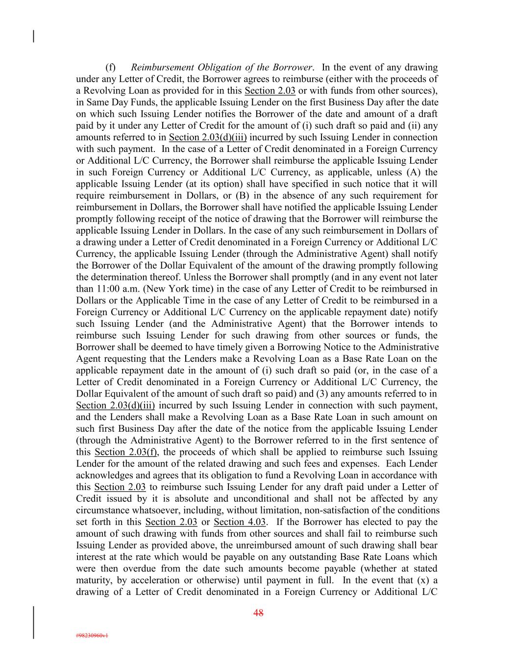(f) Reimbursement Obligation of the Borrower. In the event of any drawing under any Letter of Credit, the Borrower agrees to reimburse (either with the proceeds of a Revolving Loan as provided for in this Section 2.03 or with funds from other sources), in Same Day Funds, the applicable Issuing Lender on the first Business Day after the date on which such Issuing Lender notifies the Borrower of the date and amount of a draft paid by it under any Letter of Credit for the amount of (i) such draft so paid and (ii) any amounts referred to in Section 2.03(d)(iii) incurred by such Issuing Lender in connection with such payment. In the case of a Letter of Credit denominated in a Foreign Currency or Additional L/C Currency, the Borrower shall reimburse the applicable Issuing Lender in such Foreign Currency or Additional L/C Currency, as applicable, unless (A) the applicable Issuing Lender (at its option) shall have specified in such notice that it will require reimbursement in Dollars, or (B) in the absence of any such requirement for reimbursement in Dollars, the Borrower shall have notified the applicable Issuing Lender promptly following receipt of the notice of drawing that the Borrower will reimburse the applicable Issuing Lender in Dollars. In the case of any such reimbursement in Dollars of a drawing under a Letter of Credit denominated in a Foreign Currency or Additional L/C Currency, the applicable Issuing Lender (through the Administrative Agent) shall notify the Borrower of the Dollar Equivalent of the amount of the drawing promptly following the determination thereof. Unless the Borrower shall promptly (and in any event not later than 11:00 a.m. (New York time) in the case of any Letter of Credit to be reimbursed in Dollars or the Applicable Time in the case of any Letter of Credit to be reimbursed in a Foreign Currency or Additional L/C Currency on the applicable repayment date) notify such Issuing Lender (and the Administrative Agent) that the Borrower intends to reimburse such Issuing Lender for such drawing from other sources or funds, the Borrower shall be deemed to have timely given a Borrowing Notice to the Administrative Agent requesting that the Lenders make a Revolving Loan as a Base Rate Loan on the applicable repayment date in the amount of (i) such draft so paid (or, in the case of a Letter of Credit denominated in a Foreign Currency or Additional L/C Currency, the Dollar Equivalent of the amount of such draft so paid) and (3) any amounts referred to in Section 2.03(d)(iii) incurred by such Issuing Lender in connection with such payment, and the Lenders shall make a Revolving Loan as a Base Rate Loan in such amount on such first Business Day after the date of the notice from the applicable Issuing Lender (through the Administrative Agent) to the Borrower referred to in the first sentence of this Section 2.03(f), the proceeds of which shall be applied to reimburse such Issuing Lender for the amount of the related drawing and such fees and expenses. Each Lender acknowledges and agrees that its obligation to fund a Revolving Loan in accordance with this Section 2.03 to reimburse such Issuing Lender for any draft paid under a Letter of Credit issued by it is absolute and unconditional and shall not be affected by any circumstance whatsoever, including, without limitation, non-satisfaction of the conditions set forth in this Section 2.03 or Section 4.03. If the Borrower has elected to pay the amount of such drawing with funds from other sources and shall fail to reimburse such Issuing Lender as provided above, the unreimbursed amount of such drawing shall bear interest at the rate which would be payable on any outstanding Base Rate Loans which were then overdue from the date such amounts become payable (whether at stated maturity, by acceleration or otherwise) until payment in full. In the event that (x) a drawing of a Letter of Credit denominated in a Foreign Currency or Additional L/C 48 #98230960v1