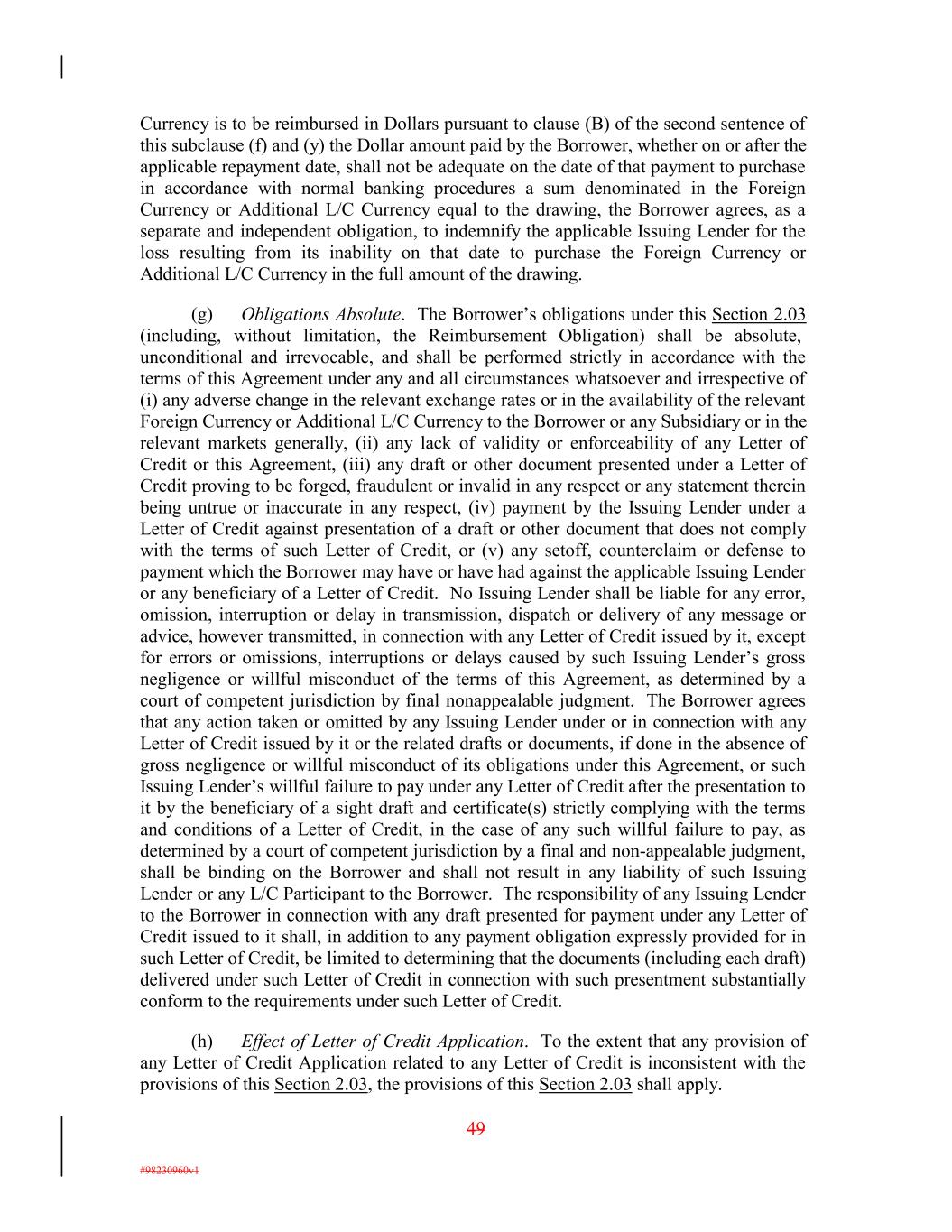 Currency is to be reimbursed in Dollars pursuant to clause (B) of the second sentence of this subclause (f) and (y) the Dollar amount paid by the Borrower, whether on or after the applicable repayment date, shall not be adequate on the date of that payment to purchase in accordance with normal banking procedures a sum denominated in the Foreign Currency or Additional L/C Currency equal to the drawing, the Borrower agrees, as a separate and independent obligation, to indemnify the applicable Issuing Lender for the loss resulting from its inability on that date to purchase the Foreign Currency or Additional L/C Currency in the full amount of the drawing. (g) Obligations Absolute. The Borrower’s obligations under this Section 2.03 (including, without limitation, the Reimbursement Obligation) shall be absolute, unconditional and irrevocable, and shall be performed strictly in accordance with the terms of this Agreement under any and all circumstances whatsoever and irrespective of (i) any adverse change in the relevant exchange rates or in the availability of the relevant Foreign Currency or Additional L/C Currency to the Borrower or any Subsidiary or in the relevant markets generally, (ii) any lack of validity or enforceability of any Letter of Credit or this Agreement, (iii) any draft or other document presented under a Letter of Credit proving to be forged, fraudulent or invalid in any respect or any statement therein being untrue or inaccurate in any respect, (iv) payment by the Issuing Lender under a Letter of Credit against presentation of a draft or other document that does not comply with the terms of such Letter of Credit, or (v) any setoff, counterclaim or defense to payment which the Borrower may have or have had against the applicable Issuing Lender or any beneficiary of a Letter of Credit. No Issuing Lender shall be liable for any error, omission, interruption or delay in transmission, dispatch or delivery of any message or advice, however transmitted, in connection with any Letter of Credit issued by it, except for errors or omissions, interruptions or delays caused by such Issuing Lender’s gross negligence or willful misconduct of the terms of this Agreement, as determined by a court of competent jurisdiction by final nonappealable judgment. The Borrower agrees that any action taken or omitted by any Issuing Lender under or in connection with any Letter of Credit issued by it or the related drafts or documents, if done in the absence of gross negligence or willful misconduct of its obligations under this Agreement, or such Issuing Lender’s willful failure to pay under any Letter of Credit after the presentation to it by the beneficiary of a sight draft and certificate(s) strictly complying with the terms and conditions of a Letter of Credit, in the case of any such willful failure to pay, as determined by a court of competent jurisdiction by a final and non-appealable judgment, shall be binding on the Borrower and shall not result in any liability of such Issuing Lender or any L/C Participant to the Borrower. The responsibility of any Issuing Lender to the Borrower in connection with any draft presented for payment under any Letter of Credit issued to it shall, in addition to any payment obligation expressly provided for in such Letter of Credit, be limited to determining that the documents (including each draft) delivered under such Letter of Credit in connection with such presentment substantially conform to the requirements under such Letter of Credit. (h) Effect of Letter of Credit Application. To the extent that any provision of any Letter of Credit Application related to any Letter of Credit is inconsistent with the provisions of this Section 2.03, the provisions of this Section 2.03 shall apply. 49 #98230960v1