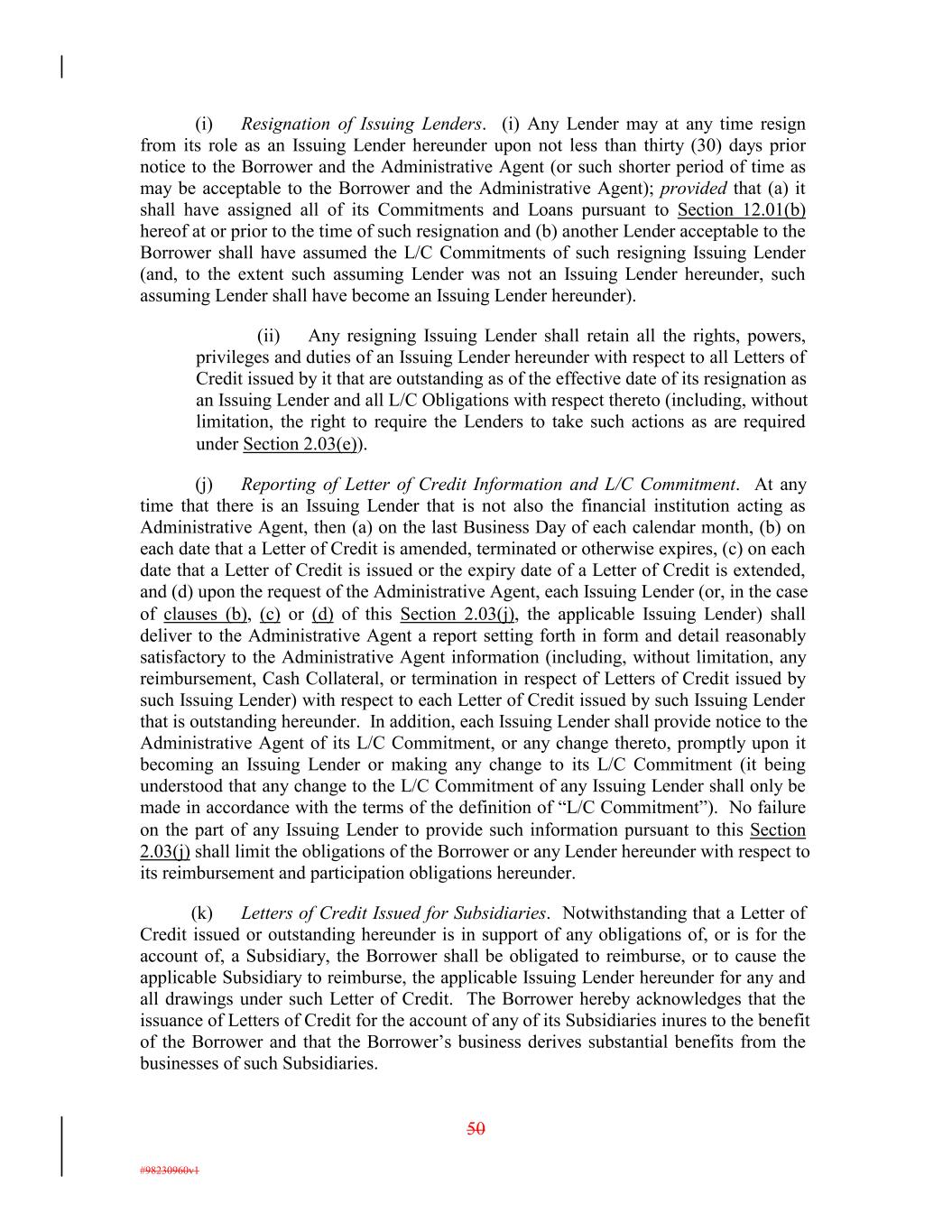 (i) Resignation of Issuing Lenders. (i) Any Lender may at any time resign from its role as an Issuing Lender hereunder upon not less than thirty (30) days prior notice to the Borrower and the Administrative Agent (or such shorter period of time as may be acceptable to the Borrower and the Administrative Agent); provided that (a) it shall have assigned all of its Commitments and Loans pursuant to Section 12.01(b) hereof at or prior to the time of such resignation and (b) another Lender acceptable to the Borrower shall have assumed the L/C Commitments of such resigning Issuing Lender (and, to the extent such assuming Lender was not an Issuing Lender hereunder, such assuming Lender shall have become an Issuing Lender hereunder). (ii) Any resigning Issuing Lender shall retain all the rights, powers, privileges and duties of an Issuing Lender hereunder with respect to all Letters of Credit issued by it that are outstanding as of the effective date of its resignation as an Issuing Lender and all L/C Obligations with respect thereto (including, without limitation, the right to require the Lenders to take such actions as are required under Section 2.03(e)). (j) Reporting of Letter of Credit Information and L/C Commitment. At any time that there is an Issuing Lender that is not also the financial institution acting as Administrative Agent, then (a) on the last Business Day of each calendar month, (b) on each date that a Letter of Credit is amended, terminated or otherwise expires, (c) on each date that a Letter of Credit is issued or the expiry date of a Letter of Credit is extended, and (d) upon the request of the Administrative Agent, each Issuing Lender (or, in the case of clauses (b), (c) or (d) of this Section 2.03(j), the applicable Issuing Lender) shall deliver to the Administrative Agent a report setting forth in form and detail reasonably satisfactory to the Administrative Agent information (including, without limitation, any reimbursement, Cash Collateral, or termination in respect of Letters of Credit issued by such Issuing Lender) with respect to each Letter of Credit issued by such Issuing Lender that is outstanding hereunder. In addition, each Issuing Lender shall provide notice to the Administrative Agent of its L/C Commitment, or any change thereto, promptly upon it becoming an Issuing Lender or making any change to its L/C Commitment (it being understood that any change to the L/C Commitment of any Issuing Lender shall only be made in accordance with the terms of the definition of “L/C Commitment”). No failure on the part of any Issuing Lender to provide such information pursuant to this Section 2.03(j) shall limit the obligations of the Borrower or any Lender hereunder with respect to its reimbursement and participation obligations hereunder. (k) Letters of Credit Issued for Subsidiaries. Notwithstanding that a Letter of Credit issued or outstanding hereunder is in support of any obligations of, or is for the account of, a Subsidiary, the Borrower shall be obligated to reimburse, or to cause the applicable Subsidiary to reimburse, the applicable Issuing Lender hereunder for any and all drawings under such Letter of Credit. The Borrower hereby acknowledges that the issuance of Letters of Credit for the account of any of its Subsidiaries inures to the benefit of the Borrower and that the Borrower’s business derives substantial benefits from the businesses of such Subsidiaries. 50 #98230960v1