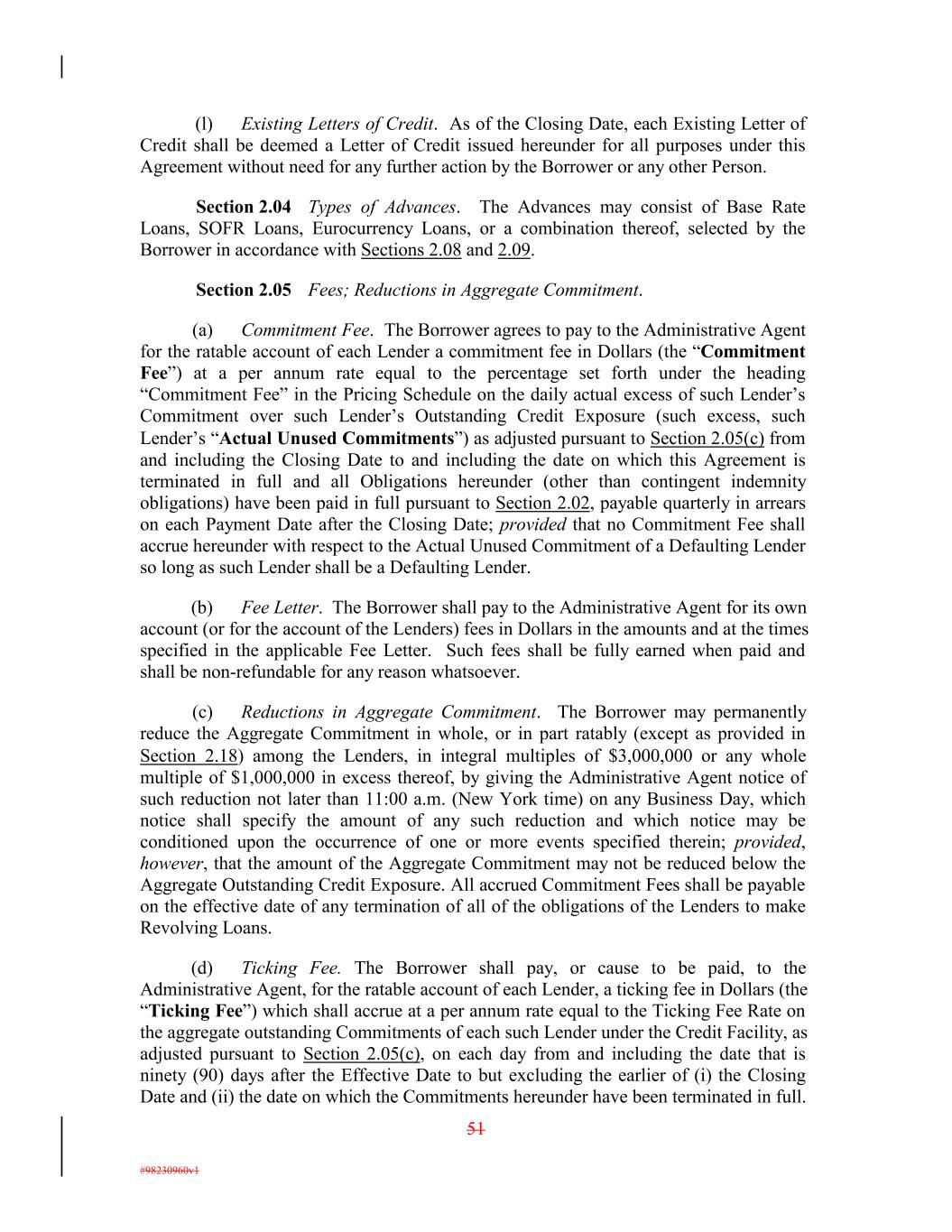 (l) Existing Letters of Credit. As of the Closing Date, each Existing Letter of Credit shall be deemed a Letter of Credit issued hereunder for all purposes under this Agreement without need for any further action by the Borrower or any other Person. Section 2.04 Types of Advances. The Advances may consist of Base Rate Loans, SOFR Loans, Eurocurrency Loans, or a combination thereof, selected by the Borrower in accordance with Sections 2.08 and 2.09. Section 2.05 Fees; Reductions in Aggregate Commitment. (a) Commitment Fee. The Borrower agrees to pay to the Administrative Agent for the ratable account of each Lender a commitment fee in Dollars (the “Commitment Fee”) at a per annum rate equal to the percentage set forth under the heading “Commitment Fee” in the Pricing Schedule on the daily actual excess of such Lender’s Commitment over such Lender’s Outstanding Credit Exposure (such excess, such Lender’s “Actual Unused Commitments”) as adjusted pursuant to Section 2.05(c) from and including the Closing Date to and including the date on which this Agreement is terminated in full and all Obligations hereunder (other than contingent indemnity obligations) have been paid in full pursuant to Section 2.02, payable quarterly in arrears on each Payment Date after the Closing Date; provided that no Commitment Fee shall accrue hereunder with respect to the Actual Unused Commitment of a Defaulting Lender so long as such Lender shall be a Defaulting Lender. (b) Fee Letter. The Borrower shall pay to the Administrative Agent for its own account (or for the account of the Lenders) fees in Dollars in the amounts and at the times specified in the applicable Fee Letter. Such fees shall be fully earned when paid and shall be non-refundable for any reason whatsoever. (c) Reductions in Aggregate Commitment. The Borrower may permanently reduce the Aggregate Commitment in whole, or in part ratably (except as provided in Section 2.18) among the Lenders, in integral multiples of $3,000,000 or any whole multiple of $1,000,000 in excess thereof, by giving the Administrative Agent notice of such reduction not later than 11:00 a.m. (New York time) on any Business Day, which notice shall specify the amount of any such reduction and which notice may be conditioned upon the occurrence of one or more events specified therein; provided, however, that the amount of the Aggregate Commitment may not be reduced below the Aggregate Outstanding Credit Exposure. All accrued Commitment Fees shall be payable on the effective date of any termination of all of the obligations of the Lenders to make Revolving Loans. (d) Ticking Fee. The Borrower shall pay, or cause to be paid, to the Administrative Agent, for the ratable account of each Lender, a ticking fee in Dollars (the “Ticking Fee”) which shall accrue at a per annum rate equal to the Ticking Fee Rate on the aggregate outstanding Commitments of each such Lender under the Credit Facility, as adjusted pursuant to Section 2.05(c), on each day from and including the date that is ninety (90) days after the Effective Date to but excluding the earlier of (i) the Closing Date and (ii) the date on which the Commitments hereunder have been terminated in full. 51 #98230960v1