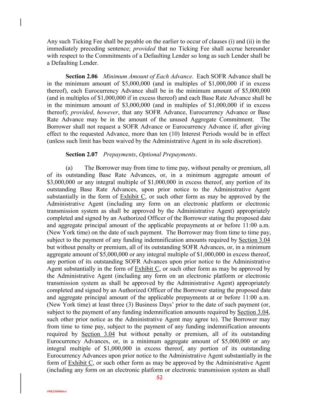 Any such Ticking Fee shall be payable on the earlier to occur of clauses (i) and (ii) in the immediately preceding sentence; provided that no Ticking Fee shall accrue hereunder with respect to the Commitments of a Defaulting Lender so long as such Lender shall be a Defaulting Lender. Section 2.06 Minimum Amount of Each Advance. Each SOFR Advance shall be in the minimum amount of $5,000,000 (and in multiples of $1,000,000 if in excess thereof), each Eurocurrency Advance shall be in the minimum amount of $5,000,000 (and in multiples of $1,000,000 if in excess thereof) and each Base Rate Advance shall be in the minimum amount of $3,000,000 (and in multiples of $1,000,000 if in excess thereof); provided, however, that any SOFR Advance, Eurocurrency Advance or Base Rate Advance may be in the amount of the unused Aggregate Commitment. The Borrower shall not request a SOFR Advance or Eurocurrency Advance if, after giving effect to the requested Advance, more than ten (10) Interest Periods would be in effect (unless such limit has been waived by the Administrative Agent in its sole discretion). Section 2.07 Prepayments, Optional Prepayments. (a) The Borrower may from time to time pay, without penalty or premium, all of its outstanding Base Rate Advances, or, in a minimum aggregate amount of $3,000,000 or any integral multiple of $1,000,000 in excess thereof, any portion of its outstanding Base Rate Advances, upon prior notice to the Administrative Agent substantially in the form of Exhibit C, or such other form as may be approved by the Administrative Agent (including any form on an electronic platform or electronic transmission system as shall be approved by the Administrative Agent) appropriately completed and signed by an Authorized Officer of the Borrower stating the proposed date and aggregate principal amount of the applicable prepayments at or before 11:00 a.m. (New York time) on the date of such payment. The Borrower may from time to time pay, subject to the payment of any funding indemnification amounts required by Section 3.04 but without penalty or premium, all of its outstanding SOFR Advances, or, in a minimum aggregate amount of $5,000,000 or any integral multiple of $1,000,000 in excess thereof, any portion of its outstanding SOFR Advances upon prior notice to the Administrative Agent substantially in the form of Exhibit C, or such other form as may be approved by the Administrative Agent (including any form on an electronic platform or electronic transmission system as shall be approved by the Administrative Agent) appropriately completed and signed by an Authorized Officer of the Borrower stating the proposed date and aggregate principal amount of the applicable prepayments at or before 11:00 a.m. (New York time) at least three (3) Business Days’ prior to the date of such payment (or, subject to the payment of any funding indemnification amounts required by Section 3.04, such other prior notice as the Administrative Agent may agree to). The Borrower may from time to time pay, subject to the payment of any funding indemnification amounts required by Section 3.04 but without penalty or premium, all of its outstanding Eurocurrency Advances, or, in a minimum aggregate amount of $5,000,000 or any integral multiple of $1,000,000 in excess thereof, any portion of its outstanding Eurocurrency Advances upon prior notice to the Administrative Agent substantially in the form of Exhibit C, or such other form as may be approved by the Administrative Agent (including any form on an electronic platform or electronic transmission system as shall 52 #98230960v1