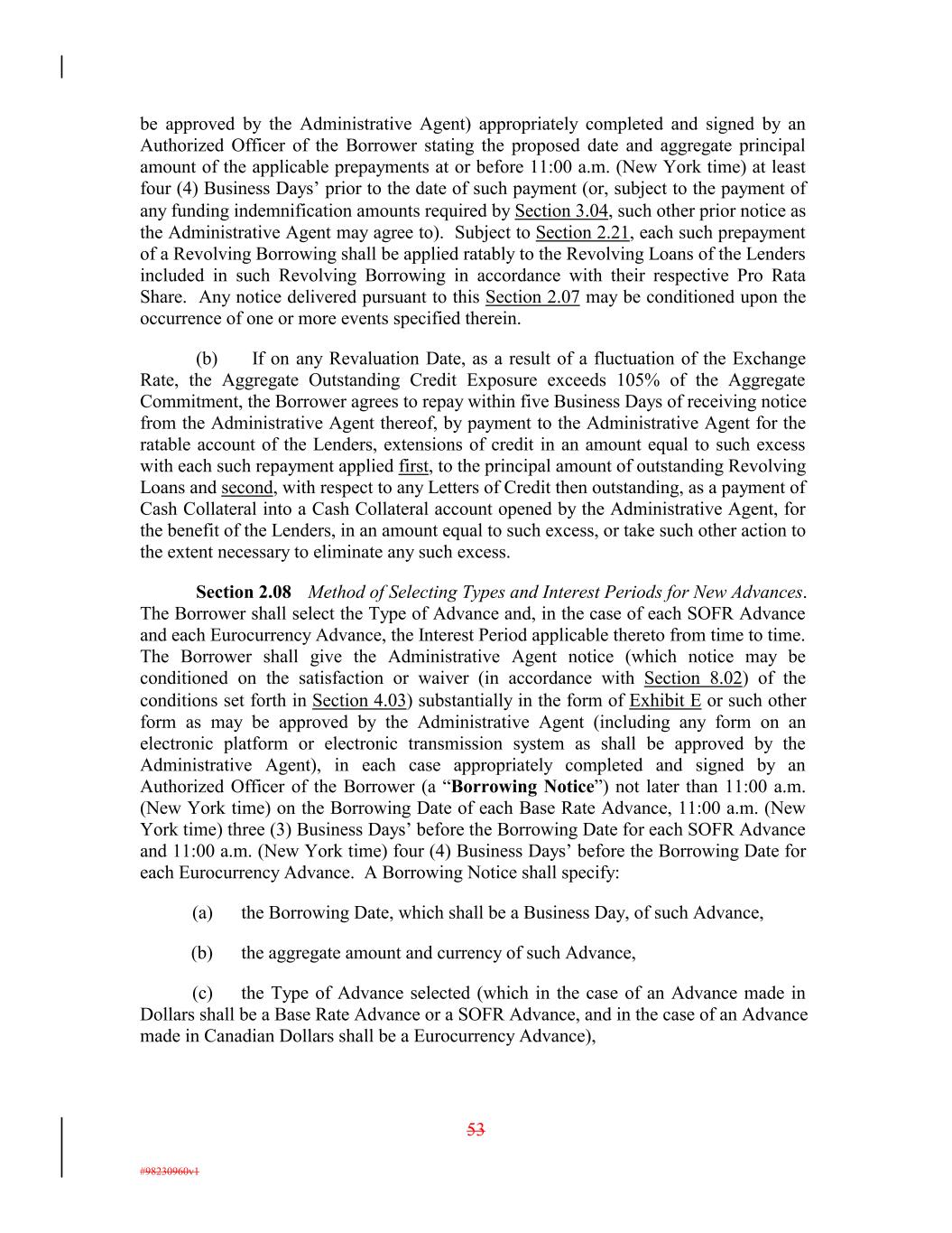 be approved by the Administrative Agent) appropriately completed and signed by an Authorized Officer of the Borrower stating the proposed date and aggregate principal amount of the applicable prepayments at or before 11:00 a.m. (New York time) at least four (4) Business Days’ prior to the date of such payment (or, subject to the payment of any funding indemnification amounts required by Section 3.04, such other prior notice as the Administrative Agent may agree to). Subject to Section 2.21, each such prepayment of a Revolving Borrowing shall be applied ratably to the Revolving Loans of the Lenders included in such Revolving Borrowing in accordance with their respective Pro Rata Share. Any notice delivered pursuant to this Section 2.07 may be conditioned upon the occurrence of one or more events specified therein. (b) If on any Revaluation Date, as a result of a fluctuation of the Exchange Rate, the Aggregate Outstanding Credit Exposure exceeds 105% of the Aggregate Commitment, the Borrower agrees to repay within five Business Days of receiving notice from the Administrative Agent thereof, by payment to the Administrative Agent for the ratable account of the Lenders, extensions of credit in an amount equal to such excess with each such repayment applied first, to the principal amount of outstanding Revolving Loans and second, with respect to any Letters of Credit then outstanding, as a payment of Cash Collateral into a Cash Collateral account opened by the Administrative Agent, for the benefit of the Lenders, in an amount equal to such excess, or take such other action to the extent necessary to eliminate any such excess. Section 2.08 Method of Selecting Types and Interest Periods for New Advances. The Borrower shall select the Type of Advance and, in the case of each SOFR Advance and each Eurocurrency Advance, the Interest Period applicable thereto from time to time. The Borrower shall give the Administrative Agent notice (which notice may be conditioned on the satisfaction or waiver (in accordance with Section 8.02) of the conditions set forth in Section 4.03) substantially in the form of Exhibit E or such other form as may be approved by the Administrative Agent (including any form on an electronic platform or electronic transmission system as shall be approved by the Administrative Agent), in each case appropriately completed and signed by an Authorized Officer of the Borrower (a “Borrowing Notice”) not later than 11:00 a.m. (New York time) on the Borrowing Date of each Base Rate Advance, 11:00 a.m. (New York time) three (3) Business Days’ before the Borrowing Date for each SOFR Advance and 11:00 a.m. (New York time) four (4) Business Days’ before the Borrowing Date for each Eurocurrency Advance. A Borrowing Notice shall specify: (a) the Borrowing Date, which shall be a Business Day, of such Advance, (b) the aggregate amount and currency of such Advance, (c) the Type of Advance selected (which in the case of an Advance made in Dollars shall be a Base Rate Advance or a SOFR Advance, and in the case of an Advance made in Canadian Dollars shall be a Eurocurrency Advance), 53 #98230960v1