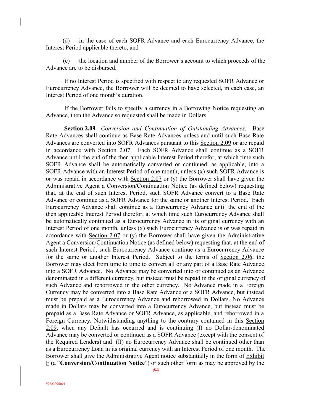 (d) in the case of each SOFR Advance and each Eurocurrency Advance, the Interest Period applicable thereto, and (e) the location and number of the Borrower’s account to which proceeds of the Advance are to be disbursed. If no Interest Period is specified with respect to any requested SOFR Advance or Eurocurrency Advance, the Borrower will be deemed to have selected, in each case, an Interest Period of one month’s duration. If the Borrower fails to specify a currency in a Borrowing Notice requesting an Advance, then the Advance so requested shall be made in Dollars. Section 2.09 Conversion and Continuation of Outstanding Advances. Base Rate Advances shall continue as Base Rate Advances unless and until such Base Rate Advances are converted into SOFR Advances pursuant to this Section 2.09 or are repaid in accordance with Section 2.07. Each SOFR Advance shall continue as a SOFR Advance until the end of the then applicable Interest Period therefor, at which time such SOFR Advance shall be automatically converted or continued, as applicable, into a SOFR Advance with an Interest Period of one month, unless (x) such SOFR Advance is or was repaid in accordance with Section 2.07 or (y) the Borrower shall have given the Administrative Agent a Conversion/Continuation Notice (as defined below) requesting that, at the end of such Interest Period, such SOFR Advance convert to a Base Rate Advance or continue as a SOFR Advance for the same or another Interest Period. Each Eurocurrency Advance shall continue as a Eurocurrency Advance until the end of the then applicable Interest Period therefor, at which time such Eurocurrency Advance shall be automatically continued as a Eurocurrency Advance in its original currency with an Interest Period of one month, unless (x) such Eurocurrency Advance is or was repaid in accordance with Section 2.07 or (y) the Borrower shall have given the Administrative Agent a Conversion/Continuation Notice (as defined below) requesting that, at the end of such Interest Period, such Eurocurrency Advance continue as a Eurocurrency Advance for the same or another Interest Period. Subject to the terms of Section 2.06, the Borrower may elect from time to time to convert all or any part of a Base Rate Advance into a SOFR Advance. No Advance may be converted into or continued as an Advance denominated in a different currency, but instead must be repaid in the original currency of such Advance and reborrowed in the other currency. No Advance made in a Foreign Currency may be converted into a Base Rate Advance or a SOFR Advance, but instead must be prepaid as a Eurocurrency Advance and reborrowed in Dollars. No Advance made in Dollars may be converted into a Eurocurrency Advance, but instead must be prepaid as a Base Rate Advance or SOFR Advance, as applicable, and reborrowed in a Foreign Currency. Notwithstanding anything to the contrary contained in this Section 2.09, when any Default has occurred and is continuing (I) no Dollar-denominated Advance may be converted or continued as a SOFR Advance (except with the consent of the Required Lenders) and (II) no Eurocurrency Advance shall be continued other than as a Eurocurrency Loan in its original currency with an Interest Period of one month. The Borrower shall give the Administrative Agent notice substantially in the form of Exhibit F (a “Conversion/Continuation Notice”) or such other form as may be approved by the 54 #98230960v1