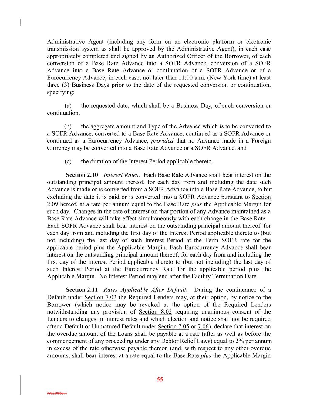 Administrative Agent (including any form on an electronic platform or electronic transmission system as shall be approved by the Administrative Agent), in each case appropriately completed and signed by an Authorized Officer of the Borrower, of each conversion of a Base Rate Advance into a SOFR Advance, conversion of a SOFR Advance into a Base Rate Advance or continuation of a SOFR Advance or of a Eurocurrency Advance, in each case, not later than 11:00 a.m. (New York time) at least three (3) Business Days prior to the date of the requested conversion or continuation, specifying: (a) the requested date, which shall be a Business Day, of such conversion or continuation, (b) the aggregate amount and Type of the Advance which is to be converted to a SOFR Advance, converted to a Base Rate Advance, continued as a SOFR Advance or continued as a Eurocurrency Advance; provided that no Advance made in a Foreign Currency may be converted into a Base Rate Advance or a SOFR Advance, and (c) the duration of the Interest Period applicable thereto. Section 2.10 Interest Rates. Each Base Rate Advance shall bear interest on the outstanding principal amount thereof, for each day from and including the date such Advance is made or is converted from a SOFR Advance into a Base Rate Advance, to but excluding the date it is paid or is converted into a SOFR Advance pursuant to Section 2.09 hereof, at a rate per annum equal to the Base Rate plus the Applicable Margin for such day. Changes in the rate of interest on that portion of any Advance maintained as a Base Rate Advance will take effect simultaneously with each change in the Base Rate. Each SOFR Advance shall bear interest on the outstanding principal amount thereof, for each day from and including the first day of the Interest Period applicable thereto to (but not including) the last day of such Interest Period at the Term SOFR rate for the applicable period plus the Applicable Margin. Each Eurocurrency Advance shall bear interest on the outstanding principal amount thereof, for each day from and including the first day of the Interest Period applicable thereto to (but not including) the last day of such Interest Period at the Eurocurrency Rate for the applicable period plus the Applicable Margin. No Interest Period may end after the Facility Termination Date. Section 2.11 Rates Applicable After Default. During the continuance of a Default under Section 7.02 the Required Lenders may, at their option, by notice to the Borrower (which notice may be revoked at the option of the Required Lenders notwithstanding any provision of Section 8.02 requiring unanimous consent of the Lenders to changes in interest rates and which election and notice shall not be required after a Default or Unmatured Default under Section 7.05 or 7.06), declare that interest on the overdue amount of the Loans shall be payable at a rate (after as well as before the commencement of any proceeding under any Debtor Relief Laws) equal to 2% per annum in excess of the rate otherwise payable thereon (and, with respect to any other overdue amounts, shall bear interest at a rate equal to the Base Rate plus the Applicable Margin 55 #98230960v1