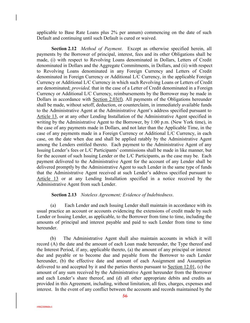 applicable to Base Rate Loans plus 2% per annum) commencing on the date of such Default and continuing until such Default is cured or waived. Section 2.12 Method of Payment. Except as otherwise specified herein, all payments by the Borrower of principal, interest, fees and its other Obligations shall be made, (i) with respect to Revolving Loans denominated in Dollars, Letters of Credit denominated in Dollars and the Aggregate Commitments, in Dollars, and (ii) with respect to Revolving Loans denominated in any Foreign Currency and Letters of Credit denominated in Foreign Currency or Additional L/C Currency, in the applicable Foreign Currency or Additional L/C Currency in which such Revolving Loans or Letters of Credit are denominated; provided, that in the case of a Letter of Credit denominated in a Foreign Currency or Additional L/C Currency, reimbursements by the Borrower may be made in Dollars in accordance with Section 2.03(f). All payments of the Obligations hereunder shall be made, without setoff, deduction, or counterclaim, in immediately available funds to the Administrative Agent at the Administrative Agent’s address specified pursuant to Article 13, or at any other Lending Installation of the Administrative Agent specified in writing by the Administrative Agent to the Borrower, by 1:00 p.m. (New York time), in the case of any payments made in Dollars, and not later than the Applicable Time, in the case of any payments made in a Foreign Currency or Additional L/C Currency, in each case, on the date when due and shall be applied ratably by the Administrative Agent among the Lenders entitled thereto. Each payment to the Administrative Agent of any Issuing Lender’s fees or L/C Participants’ commissions shall be made in like manner, but for the account of such Issuing Lender or the L/C Participants, as the case may be. Each payment delivered to the Administrative Agent for the account of any Lender shall be delivered promptly by the Administrative Agent to such Lender in the same type of funds that the Administrative Agent received at such Lender’s address specified pursuant to Article 13 or at any Lending Installation specified in a notice received by the Administrative Agent from such Lender. Section 2.13 Noteless Agreement; Evidence of Indebtedness. (a) Each Lender and each Issuing Lender shall maintain in accordance with its usual practice an account or accounts evidencing the extensions of credit made by such Lender or Issuing Lender, as applicable, to the Borrower from time to time, including the amounts of principal and interest payable and paid to such Lender from time to time hereunder. (b) The Administrative Agent shall also maintain accounts in which it will record (A) the date and the amount of each Loan made hereunder, the Type thereof and the Interest Period, if any, applicable thereto, (a) the amount of any principal or interest due and payable or to become due and payable from the Borrower to each Lender hereunder, (b) the effective date and amount of each Assignment and Assumption delivered to and accepted by it and the parties thereto pursuant to Section 12.01, (c) the amount of any sum received by the Administrative Agent hereunder from the Borrower and each Lender’s share thereof, and (d) all other appropriate debits and credits as provided in this Agreement, including, without limitation, all fees, charges, expenses and interest. In the event of any conflict between the accounts and records maintained by the 56 #98230960v1