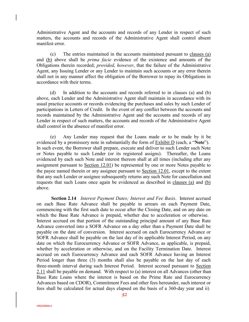 Administrative Agent and the accounts and records of any Lender in respect of such matters, the accounts and records of the Administrative Agent shall control absent manifest error. (c) The entries maintained in the accounts maintained pursuant to clauses (a) and (b) above shall be prima facie evidence of the existence and amounts of the Obligations therein recorded; provided, however, that the failure of the Administrative Agent, any Issuing Lender or any Lender to maintain such accounts or any error therein shall not in any manner affect the obligation of the Borrower to repay its Obligations in accordance with their terms. (d) In addition to the accounts and records referred to in clauses (a) and (b) above, each Lender and the Administrative Agent shall maintain in accordance with its usual practice accounts or records evidencing the purchases and sales by such Lender of participations in Letters of Credit. In the event of any conflict between the accounts and records maintained by the Administrative Agent and the accounts and records of any Lender in respect of such matters, the accounts and records of the Administrative Agent shall control in the absence of manifest error. (e) Any Lender may request that the Loans made or to be made by it be evidenced by a promissory note in substantially the form of Exhibit D (each, a “Note”). In such event, the Borrower shall prepare, execute and deliver to such Lender such Note or Notes payable to such Lender (or its registered assigns). Thereafter, the Loans evidenced by each such Note and interest thereon shall at all times (including after any assignment pursuant to Section 12.01) be represented by one or more Notes payable to the payee named therein or any assignee pursuant to Section 12.01, except to the extent that any such Lender or assignee subsequently returns any such Note for cancellation and requests that such Loans once again be evidenced as described in clauses (a) and (b) above. Section 2.14 Interest Payment Dates; Interest and Fee Basis. Interest accrued on each Base Rate Advance shall be payable in arrears on each Payment Date, commencing with the first such date to occur after the Closing Date, and on any date on which the Base Rate Advance is prepaid, whether due to acceleration or otherwise. Interest accrued on that portion of the outstanding principal amount of any Base Rate Advance converted into a SOFR Advance on a day other than a Payment Date shall be payable on the date of conversion. Interest accrued on each Eurocurrency Advance or SOFR Advance shall be payable on the last day of its applicable Interest Period, on any date on which the Eurocurrency Advance or SOFR Advance, as applicable, is prepaid, whether by acceleration or otherwise, and on the Facility Termination Date. Interest accrued on each Eurocurrency Advance and each SOFR Advance having an Interest Period longer than three (3) months shall also be payable on the last day of each three-month interval during such Interest Period. Interest accrued pursuant to Section 2.11 shall be payable on demand. With respect to (a) interest on all Advances (other than Base Rate Loans where the interest is based on the Prime Rate and Eurocurrency Advances based on CDOR), Commitment Fees and other fees hereunder, such interest or fees shall be calculated for actual days elapsed on the basis of a 360-day year and ii) 57 #98230960v1