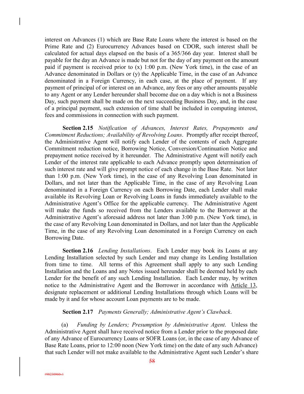 interest on Advances (1) which are Base Rate Loans where the interest is based on the Prime Rate and (2) Eurocurrency Advances based on CDOR, such interest shall be calculated for actual days elapsed on the basis of a 365/366 day year. Interest shall be payable for the day an Advance is made but not for the day of any payment on the amount paid if payment is received prior to (x) 1:00 p.m. (New York time), in the case of an Advance denominated in Dollars or (y) the Applicable Time, in the case of an Advance denominated in a Foreign Currency, in each case, at the place of payment. If any payment of principal of or interest on an Advance, any fees or any other amounts payable to any Agent or any Lender hereunder shall become due on a day which is not a Business Day, such payment shall be made on the next succeeding Business Day, and, in the case of a principal payment, such extension of time shall be included in computing interest, fees and commissions in connection with such payment. Section 2.15 Notification of Advances, Interest Rates, Prepayments and Commitment Reductions; Availability of Revolving Loans. Promptly after receipt thereof, the Administrative Agent will notify each Lender of the contents of each Aggregate Commitment reduction notice, Borrowing Notice, Conversion/Continuation Notice and prepayment notice received by it hereunder. The Administrative Agent will notify each Lender of the interest rate applicable to each Advance promptly upon determination of such interest rate and will give prompt notice of each change in the Base Rate. Not later than 1:00 p.m. (New York time), in the case of any Revolving Loan denominated in Dollars, and not later than the Applicable Time, in the case of any Revolving Loan denominated in a Foreign Currency on each Borrowing Date, each Lender shall make available its Revolving Loan or Revolving Loans in funds immediately available to the Administrative Agent’s Office for the applicable currency. The Administrative Agent will make the funds so received from the Lenders available to the Borrower at the Administrative Agent’s aforesaid address not later than 3:00 p.m. (New York time), in the case of any Revolving Loan denominated in Dollars, and not later than the Applicable Time, in the case of any Revolving Loan denominated in a Foreign Currency on each Borrowing Date. Section 2.16 Lending Installations. Each Lender may book its Loans at any Lending Installation selected by such Lender and may change its Lending Installation from time to time. All terms of this Agreement shall apply to any such Lending Installation and the Loans and any Notes issued hereunder shall be deemed held by each Lender for the benefit of any such Lending Installation. Each Lender may, by written notice to the Administrative Agent and the Borrower in accordance with Article 13, designate replacement or additional Lending Installations through which Loans will be made by it and for whose account Loan payments are to be made. Section 2.17 Payments Generally; Administrative Agent’s Clawback. (a) Funding by Lenders; Presumption by Administrative Agent. Unless the Administrative Agent shall have received notice from a Lender prior to the proposed date of any Advance of Eurocurrency Loans or SOFR Loans (or, in the case of any Advance of Base Rate Loans, prior to 12:00 noon (New York time) on the date of any such Advance) that such Lender will not make available to the Administrative Agent such Lender’s share 58 #98230960v1