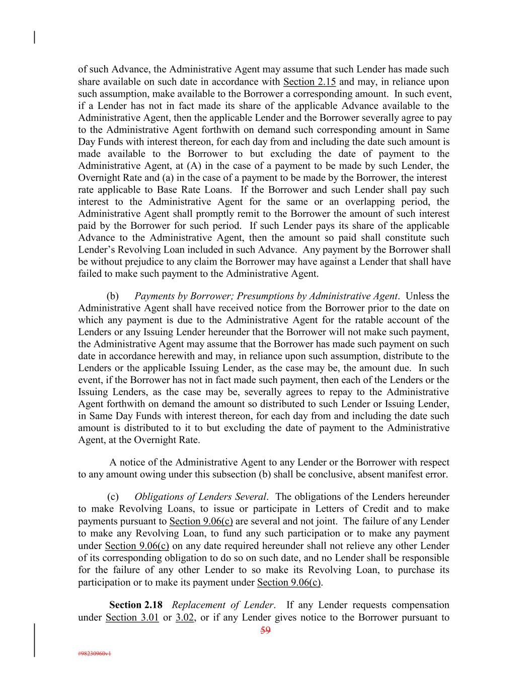 of such Advance, the Administrative Agent may assume that such Lender has made such share available on such date in accordance with Section 2.15 and may, in reliance upon such assumption, make available to the Borrower a corresponding amount. In such event, if a Lender has not in fact made its share of the applicable Advance available to the Administrative Agent, then the applicable Lender and the Borrower severally agree to pay to the Administrative Agent forthwith on demand such corresponding amount in Same Day Funds with interest thereon, for each day from and including the date such amount is made available to the Borrower to but excluding the date of payment to the Administrative Agent, at (A) in the case of a payment to be made by such Lender, the Overnight Rate and (a) in the case of a payment to be made by the Borrower, the interest rate applicable to Base Rate Loans. If the Borrower and such Lender shall pay such interest to the Administrative Agent for the same or an overlapping period, the Administrative Agent shall promptly remit to the Borrower the amount of such interest paid by the Borrower for such period. If such Lender pays its share of the applicable Advance to the Administrative Agent, then the amount so paid shall constitute such Lender’s Revolving Loan included in such Advance. Any payment by the Borrower shall be without prejudice to any claim the Borrower may have against a Lender that shall have failed to make such payment to the Administrative Agent. (b) Payments by Borrower; Presumptions by Administrative Agent. Unless the Administrative Agent shall have received notice from the Borrower prior to the date on which any payment is due to the Administrative Agent for the ratable account of the Lenders or any Issuing Lender hereunder that the Borrower will not make such payment, the Administrative Agent may assume that the Borrower has made such payment on such date in accordance herewith and may, in reliance upon such assumption, distribute to the Lenders or the applicable Issuing Lender, as the case may be, the amount due. In such event, if the Borrower has not in fact made such payment, then each of the Lenders or the Issuing Lenders, as the case may be, severally agrees to repay to the Administrative Agent forthwith on demand the amount so distributed to such Lender or Issuing Lender, in Same Day Funds with interest thereon, for each day from and including the date such amount is distributed to it to but excluding the date of payment to the Administrative Agent, at the Overnight Rate. A notice of the Administrative Agent to any Lender or the Borrower with respect to any amount owing under this subsection (b) shall be conclusive, absent manifest error. (c) Obligations of Lenders Several. The obligations of the Lenders hereunder to make Revolving Loans, to issue or participate in Letters of Credit and to make payments pursuant to Section 9.06(c) are several and not joint. The failure of any Lender to make any Revolving Loan, to fund any such participation or to make any payment under Section 9.06(c) on any date required hereunder shall not relieve any other Lender of its corresponding obligation to do so on such date, and no Lender shall be responsible for the failure of any other Lender to so make its Revolving Loan, to purchase its participation or to make its payment under Section 9.06(c). Section 2.18 Replacement of Lender. If any Lender requests compensation under Section 3.01 or 3.02, or if any Lender gives notice to the Borrower pursuant to 59 #98230960v1