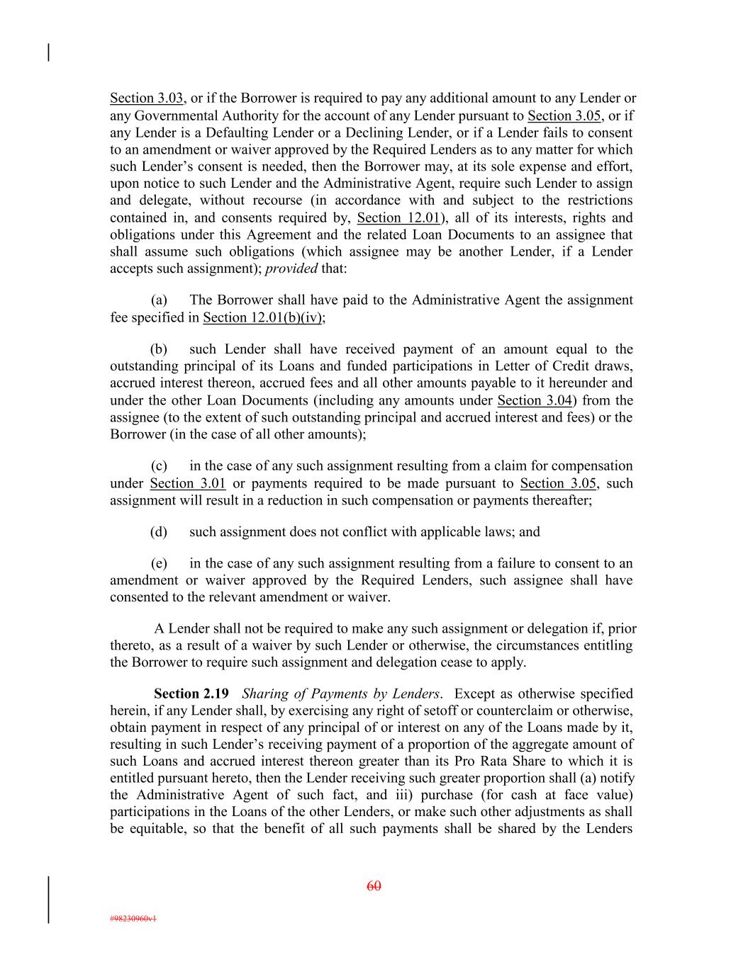 Section 3.03, or if the Borrower is required to pay any additional amount to any Lender or any Governmental Authority for the account of any Lender pursuant to Section 3.05, or if any Lender is a Defaulting Lender or a Declining Lender, or if a Lender fails to consent to an amendment or waiver approved by the Required Lenders as to any matter for which such Lender’s consent is needed, then the Borrower may, at its sole expense and effort, upon notice to such Lender and the Administrative Agent, require such Lender to assign and delegate, without recourse (in accordance with and subject to the restrictions contained in, and consents required by, Section 12.01), all of its interests, rights and obligations under this Agreement and the related Loan Documents to an assignee that shall assume such obligations (which assignee may be another Lender, if a Lender accepts such assignment); provided that: (a) The Borrower shall have paid to the Administrative Agent the assignment fee specified in Section 12.01(b)(iv); (b) such Lender shall have received payment of an amount equal to the outstanding principal of its Loans and funded participations in Letter of Credit draws, accrued interest thereon, accrued fees and all other amounts payable to it hereunder and under the other Loan Documents (including any amounts under Section 3.04) from the assignee (to the extent of such outstanding principal and accrued interest and fees) or the Borrower (in the case of all other amounts); (c) in the case of any such assignment resulting from a claim for compensation under Section 3.01 or payments required to be made pursuant to Section 3.05, such assignment will result in a reduction in such compensation or payments thereafter; (d) such assignment does not conflict with applicable laws; and (e) in the case of any such assignment resulting from a failure to consent to an amendment or waiver approved by the Required Lenders, such assignee shall have consented to the relevant amendment or waiver. A Lender shall not be required to make any such assignment or delegation if, prior thereto, as a result of a waiver by such Lender or otherwise, the circumstances entitling the Borrower to require such assignment and delegation cease to apply. Section 2.19 Sharing of Payments by Lenders. Except as otherwise specified herein, if any Lender shall, by exercising any right of setoff or counterclaim or otherwise, obtain payment in respect of any principal of or interest on any of the Loans made by it, resulting in such Lender’s receiving payment of a proportion of the aggregate amount of such Loans and accrued interest thereon greater than its Pro Rata Share to which it is entitled pursuant hereto, then the Lender receiving such greater proportion shall (a) notify the Administrative Agent of such fact, and iii) purchase (for cash at face value) participations in the Loans of the other Lenders, or make such other adjustments as shall be equitable, so that the benefit of all such payments shall be shared by the Lenders 60 #98230960v1