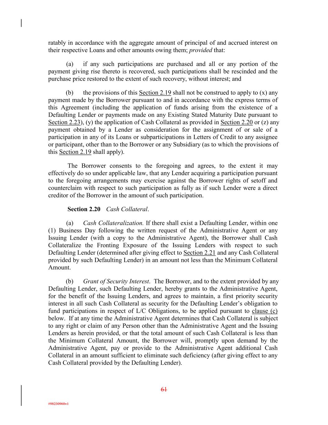 ratably in accordance with the aggregate amount of principal of and accrued interest on their respective Loans and other amounts owing them; provided that: (a) if any such participations are purchased and all or any portion of the payment giving rise thereto is recovered, such participations shall be rescinded and the purchase price restored to the extent of such recovery, without interest; and (b) the provisions of this Section 2.19 shall not be construed to apply to (x) any payment made by the Borrower pursuant to and in accordance with the express terms of this Agreement (including the application of funds arising from the existence of a Defaulting Lender or payments made on any Existing Stated Maturity Date pursuant to Section 2.23), (y) the application of Cash Collateral as provided in Section 2.20 or (z) any payment obtained by a Lender as consideration for the assignment of or sale of a participation in any of its Loans or subparticipations in Letters of Credit to any assignee or participant, other than to the Borrower or any Subsidiary (as to which the provisions of this Section 2.19 shall apply). The Borrower consents to the foregoing and agrees, to the extent it may effectively do so under applicable law, that any Lender acquiring a participation pursuant to the foregoing arrangements may exercise against the Borrower rights of setoff and counterclaim with respect to such participation as fully as if such Lender were a direct creditor of the Borrower in the amount of such participation. Section 2.20 Cash Collateral. (a) Cash Collateralization. If there shall exist a Defaulting Lender, within one (1) Business Day following the written request of the Administrative Agent or any Issuing Lender (with a copy to the Administrative Agent), the Borrower shall Cash Collateralize the Fronting Exposure of the Issuing Lenders with respect to such Defaulting Lender (determined after giving effect to Section 2.21 and any Cash Collateral provided by such Defaulting Lender) in an amount not less than the Minimum Collateral Amount. (b) Grant of Security Interest. The Borrower, and to the extent provided by any Defaulting Lender, such Defaulting Lender, hereby grants to the Administrative Agent, for the benefit of the Issuing Lenders, and agrees to maintain, a first priority security interest in all such Cash Collateral as security for the Defaulting Lender’s obligation to fund participations in respect of L/C Obligations, to be applied pursuant to clause (c) below. If at any time the Administrative Agent determines that Cash Collateral is subject to any right or claim of any Person other than the Administrative Agent and the Issuing Lenders as herein provided, or that the total amount of such Cash Collateral is less than the Minimum Collateral Amount, the Borrower will, promptly upon demand by the Administrative Agent, pay or provide to the Administrative Agent additional Cash Collateral in an amount sufficient to eliminate such deficiency (after giving effect to any Cash Collateral provided by the Defaulting Lender). 61 #98230960v1