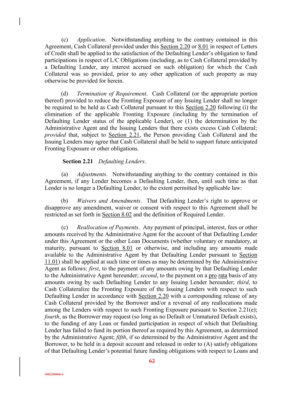 (c) Application. Notwithstanding anything to the contrary contained in this Agreement, Cash Collateral provided under this Section 2.20 or 8.01 in respect of Letters of Credit shall be applied to the satisfaction of the Defaulting Lender’s obligation to fund participations in respect of L/C Obligations (including, as to Cash Collateral provided by a Defaulting Lender, any interest accrued on such obligation) for which the Cash Collateral was so provided, prior to any other application of such property as may otherwise be provided for herein. (d) Termination of Requirement. Cash Collateral (or the appropriate portion thereof) provided to reduce the Fronting Exposure of any Issuing Lender shall no longer be required to be held as Cash Collateral pursuant to this Section 2.20 following (i) the elimination of the applicable Fronting Exposure (including by the termination of Defaulting Lender status of the applicable Lender), or (1) the determination by the Administrative Agent and the Issuing Lenders that there exists excess Cash Collateral; provided that, subject to Section 2.21, the Person providing Cash Collateral and the Issuing Lenders may agree that Cash Collateral shall be held to support future anticipated Fronting Exposure or other obligations. Section 2.21 Defaulting Lenders. (a) Adjustments. Notwithstanding anything to the contrary contained in this Agreement, if any Lender becomes a Defaulting Lender, then, until such time as that Lender is no longer a Defaulting Lender, to the extent permitted by applicable law: (b) Waivers and Amendments. That Defaulting Lender’s right to approve or disapprove any amendment, waiver or consent with respect to this Agreement shall be restricted as set forth in Section 8.02 and the definition of Required Lender. (c) Reallocation of Payments. Any payment of principal, interest, fees or other amounts received by the Administrative Agent for the account of that Defaulting Lender under this Agreement or the other Loan Documents (whether voluntary or mandatory, at maturity, pursuant to Section 8.01 or otherwise, and including any amounts made available to the Administrative Agent by that Defaulting Lender pursuant to Section 11.01) shall be applied at such time or times as may be determined by the Administrative Agent as follows: first, to the payment of any amounts owing by that Defaulting Lender to the Administrative Agent hereunder; second, to the payment on a pro rata basis of any amounts owing by such Defaulting Lender to any Issuing Lender hereunder; third, to Cash Collateralize the Fronting Exposure of the Issuing Lenders with respect to such Defaulting Lender in accordance with Section 2.20 with a corresponding release of any Cash Collateral provided by the Borrower and/or a reversal of any reallocations made among the Lenders with respect to such Fronting Exposure pursuant to Section 2.21(e); fourth, as the Borrower may request (so long as no Default or Unmatured Default exists), to the funding of any Loan or funded participation in respect of which that Defaulting Lender has failed to fund its portion thereof as required by this Agreement, as determined by the Administrative Agent; fifth, if so determined by the Administrative Agent and the Borrower, to be held in a deposit account and released in order to (A) satisfy obligations of that Defaulting Lender’s potential future funding obligations with respect to Loans and 62 #98230960v1