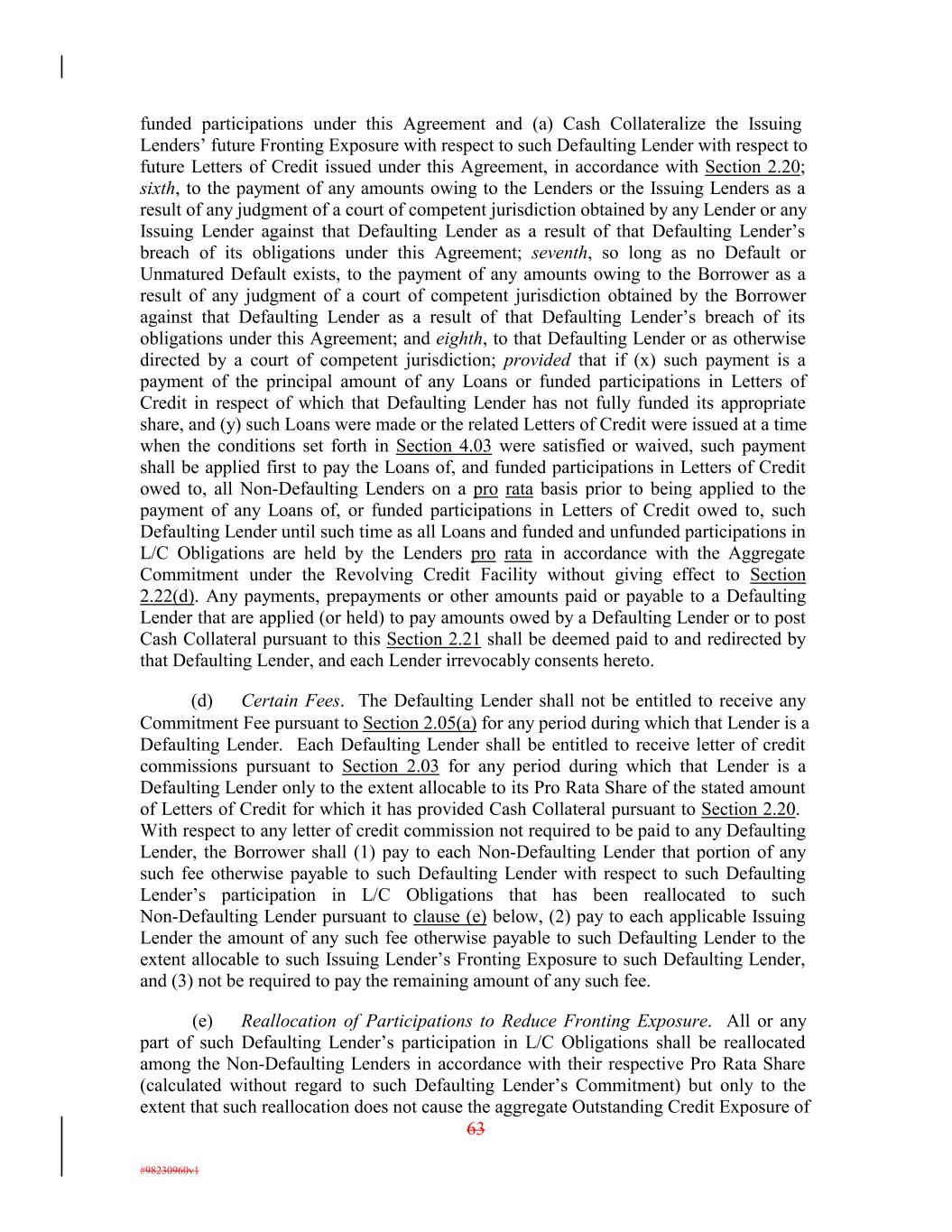 funded participations under this Agreement and (a) Cash Collateralize the Issuing Lenders’ future Fronting Exposure with respect to such Defaulting Lender with respect to future Letters of Credit issued under this Agreement, in accordance with Section 2.20; sixth, to the payment of any amounts owing to the Lenders or the Issuing Lenders as a result of any judgment of a court of competent jurisdiction obtained by any Lender or any Issuing Lender against that Defaulting Lender as a result of that Defaulting Lender’s breach of its obligations under this Agreement; seventh, so long as no Default or Unmatured Default exists, to the payment of any amounts owing to the Borrower as a result of any judgment of a court of competent jurisdiction obtained by the Borrower against that Defaulting Lender as a result of that Defaulting Lender’s breach of its obligations under this Agreement; and eighth, to that Defaulting Lender or as otherwise directed by a court of competent jurisdiction; provided that if (x) such payment is a payment of the principal amount of any Loans or funded participations in Letters of Credit in respect of which that Defaulting Lender has not fully funded its appropriate share, and (y) such Loans were made or the related Letters of Credit were issued at a time when the conditions set forth in Section 4.03 were satisfied or waived, such payment shall be applied first to pay the Loans of, and funded participations in Letters of Credit owed to, all Non-Defaulting Lenders on a pro rata basis prior to being applied to the payment of any Loans of, or funded participations in Letters of Credit owed to, such Defaulting Lender until such time as all Loans and funded and unfunded participations in L/C Obligations are held by the Lenders pro rata in accordance with the Aggregate Commitment under the Revolving Credit Facility without giving effect to Section 2.22(d). Any payments, prepayments or other amounts paid or payable to a Defaulting Lender that are applied (or held) to pay amounts owed by a Defaulting Lender or to post Cash Collateral pursuant to this Section 2.21 shall be deemed paid to and redirected by that Defaulting Lender, and each Lender irrevocably consents hereto. (d) Certain Fees. The Defaulting Lender shall not be entitled to receive any Commitment Fee pursuant to Section 2.05(a) for any period during which that Lender is a Defaulting Lender. Each Defaulting Lender shall be entitled to receive letter of credit commissions pursuant to Section 2.03 for any period during which that Lender is a Defaulting Lender only to the extent allocable to its Pro Rata Share of the stated amount of Letters of Credit for which it has provided Cash Collateral pursuant to Section 2.20. With respect to any letter of credit commission not required to be paid to any Defaulting Lender, the Borrower shall (1) pay to each Non-Defaulting Lender that portion of any such fee otherwise payable to such Defaulting Lender with respect to such Defaulting Lender’s participation in L/C Obligations that has been reallocated to such Non-Defaulting Lender pursuant to clause (e) below, (2) pay to each applicable Issuing Lender the amount of any such fee otherwise payable to such Defaulting Lender to the extent allocable to such Issuing Lender’s Fronting Exposure to such Defaulting Lender, and (3) not be required to pay the remaining amount of any such fee. (e) Reallocation of Participations to Reduce Fronting Exposure. All or any part of such Defaulting Lender’s participation in L/C Obligations shall be reallocated among the Non-Defaulting Lenders in accordance with their respective Pro Rata Share (calculated without regard to such Defaulting Lender’s Commitment) but only to the extent that such reallocation does not cause the aggregate Outstanding Credit Exposure of 63 #98230960v1