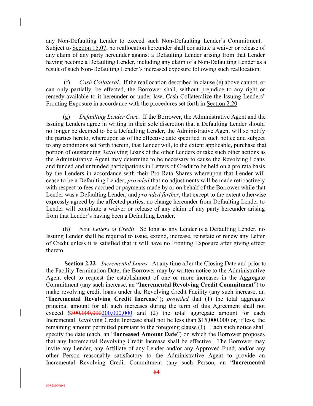 any Non-Defaulting Lender to exceed such Non-Defaulting Lender’s Commitment. Subject to Section 15.07, no reallocation hereunder shall constitute a waiver or release of any claim of any party hereunder against a Defaulting Lender arising from that Lender having become a Defaulting Lender, including any claim of a Non-Defaulting Lender as a result of such Non-Defaulting Lender’s increased exposure following such reallocation. (f) Cash Collateral. If the reallocation described in clause (e) above cannot, or can only partially, be effected, the Borrower shall, without prejudice to any right or remedy available to it hereunder or under law, Cash Collateralize the Issuing Lenders’ Fronting Exposure in accordance with the procedures set forth in Section 2.20. (g) Defaulting Lender Cure. If the Borrower, the Administrative Agent and the Issuing Lenders agree in writing in their sole discretion that a Defaulting Lender should no longer be deemed to be a Defaulting Lender, the Administrative Agent will so notify the parties hereto, whereupon as of the effective date specified in such notice and subject to any conditions set forth therein, that Lender will, to the extent applicable, purchase that portion of outstanding Revolving Loans of the other Lenders or take such other actions as the Administrative Agent may determine to be necessary to cause the Revolving Loans and funded and unfunded participations in Letters of Credit to be held on a pro rata basis by the Lenders in accordance with their Pro Rata Shares whereupon that Lender will cease to be a Defaulting Lender; provided that no adjustments will be made retroactively with respect to fees accrued or payments made by or on behalf of the Borrower while that Lender was a Defaulting Lender; and provided further, that except to the extent otherwise expressly agreed by the affected parties, no change hereunder from Defaulting Lender to Lender will constitute a waiver or release of any claim of any party hereunder arising from that Lender’s having been a Defaulting Lender. (h) New Letters of Credit. So long as any Lender is a Defaulting Lender, no Issuing Lender shall be required to issue, extend, increase, reinstate or renew any Letter of Credit unless it is satisfied that it will have no Fronting Exposure after giving effect thereto. Section 2.22 Incremental Loans. At any time after the Closing Date and prior to the Facility Termination Date, the Borrower may by written notice to the Administrative Agent elect to request the establishment of one or more increases in the Aggregate Commitment (any such increase, an “Incremental Revolving Credit Commitment”) to make revolving credit loans under the Revolving Credit Facility (any such increase, an “Incremental Revolving Credit Increase”); provided that (1) the total aggregate principal amount for all such increases during the term of this Agreement shall not exceed $300,000,000200,000,000 and (2) the total aggregate amount for each Incremental Revolving Credit Increase shall not be less than $15,000,000 or, if less, the remaining amount permitted pursuant to the foregoing clause (1). Each such notice shall specify the date (each, an “Increased Amount Date”) on which the Borrower proposes that any Incremental Revolving Credit Increase shall be effective. The Borrower may invite any Lender, any Affiliate of any Lender and/or any Approved Fund, and/or any other Person reasonably satisfactory to the Administrative Agent to provide an Incremental Revolving Credit Commitment (any such Person, an “Incremental 64 #98230960v1