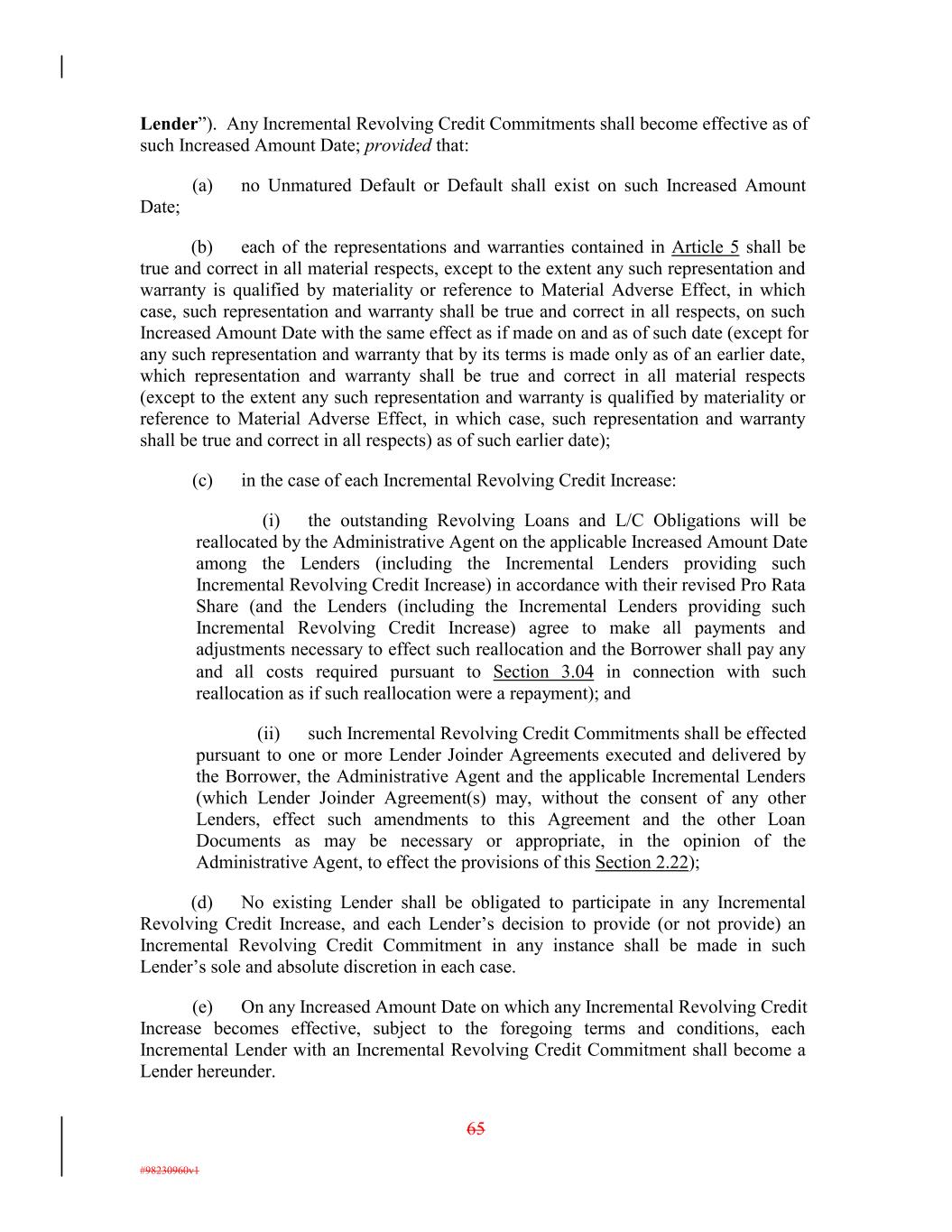 Lender”). Any Incremental Revolving Credit Commitments shall become effective as of such Increased Amount Date; provided that: (a) no Unmatured Default or Default shall exist on such Increased Amount Date; (b) each of the representations and warranties contained in Article 5 shall be true and correct in all material respects, except to the extent any such representation and warranty is qualified by materiality or reference to Material Adverse Effect, in which case, such representation and warranty shall be true and correct in all respects, on such Increased Amount Date with the same effect as if made on and as of such date (except for any such representation and warranty that by its terms is made only as of an earlier date, which representation and warranty shall be true and correct in all material respects (except to the extent any such representation and warranty is qualified by materiality or reference to Material Adverse Effect, in which case, such representation and warranty shall be true and correct in all respects) as of such earlier date); (c) in the case of each Incremental Revolving Credit Increase: (i) the outstanding Revolving Loans and L/C Obligations will be reallocated by the Administrative Agent on the applicable Increased Amount Date among the Lenders (including the Incremental Lenders providing such Incremental Revolving Credit Increase) in accordance with their revised Pro Rata Share (and the Lenders (including the Incremental Lenders providing such Incremental Revolving Credit Increase) agree to make all payments and adjustments necessary to effect such reallocation and the Borrower shall pay any and all costs required pursuant to Section 3.04 in connection with such reallocation as if such reallocation were a repayment); and (ii) such Incremental Revolving Credit Commitments shall be effected pursuant to one or more Lender Joinder Agreements executed and delivered by the Borrower, the Administrative Agent and the applicable Incremental Lenders (which Lender Joinder Agreement(s) may, without the consent of any other Lenders, effect such amendments to this Agreement and the other Loan Documents as may be necessary or appropriate, in the opinion of the Administrative Agent, to effect the provisions of this Section 2.22); (d) No existing Lender shall be obligated to participate in any Incremental Revolving Credit Increase, and each Lender’s decision to provide (or not provide) an Incremental Revolving Credit Commitment in any instance shall be made in such Lender’s sole and absolute discretion in each case. (e) On any Increased Amount Date on which any Incremental Revolving Credit Increase becomes effective, subject to the foregoing terms and conditions, each Incremental Lender with an Incremental Revolving Credit Commitment shall become a Lender hereunder. 65 #98230960v1