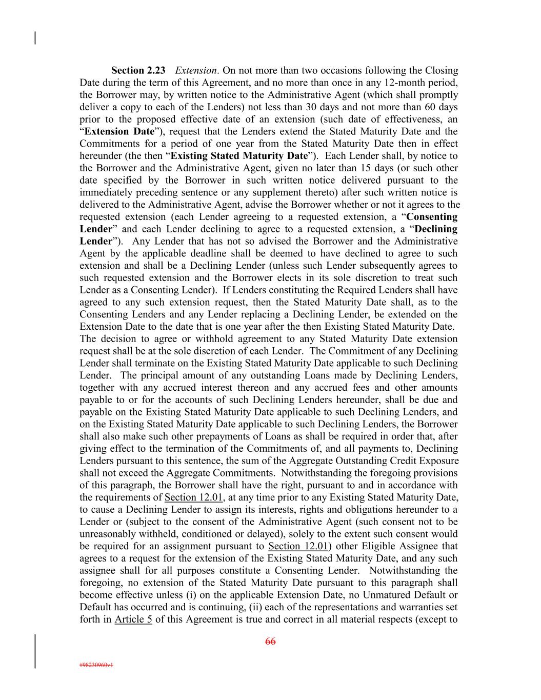 Section 2.23 Extension. On not more than two occasions following the Closing Date during the term of this Agreement, and no more than once in any 12-month period, the Borrower may, by written notice to the Administrative Agent (which shall promptly deliver a copy to each of the Lenders) not less than 30 days and not more than 60 days prior to the proposed effective date of an extension (such date of effectiveness, an “Extension Date”), request that the Lenders extend the Stated Maturity Date and the Commitments for a period of one year from the Stated Maturity Date then in effect hereunder (the then “Existing Stated Maturity Date”). Each Lender shall, by notice to the Borrower and the Administrative Agent, given no later than 15 days (or such other date specified by the Borrower in such written notice delivered pursuant to the immediately preceding sentence or any supplement thereto) after such written notice is delivered to the Administrative Agent, advise the Borrower whether or not it agrees to the requested extension (each Lender agreeing to a requested extension, a “Consenting Lender” and each Lender declining to agree to a requested extension, a “Declining Lender”). Any Lender that has not so advised the Borrower and the Administrative Agent by the applicable deadline shall be deemed to have declined to agree to such extension and shall be a Declining Lender (unless such Lender subsequently agrees to such requested extension and the Borrower elects in its sole discretion to treat such Lender as a Consenting Lender). If Lenders constituting the Required Lenders shall have agreed to any such extension request, then the Stated Maturity Date shall, as to the Consenting Lenders and any Lender replacing a Declining Lender, be extended on the Extension Date to the date that is one year after the then Existing Stated Maturity Date. The decision to agree or withhold agreement to any Stated Maturity Date extension request shall be at the sole discretion of each Lender. The Commitment of any Declining Lender shall terminate on the Existing Stated Maturity Date applicable to such Declining Lender. The principal amount of any outstanding Loans made by Declining Lenders, together with any accrued interest thereon and any accrued fees and other amounts payable to or for the accounts of such Declining Lenders hereunder, shall be due and payable on the Existing Stated Maturity Date applicable to such Declining Lenders, and on the Existing Stated Maturity Date applicable to such Declining Lenders, the Borrower shall also make such other prepayments of Loans as shall be required in order that, after giving effect to the termination of the Commitments of, and all payments to, Declining Lenders pursuant to this sentence, the sum of the Aggregate Outstanding Credit Exposure shall not exceed the Aggregate Commitments. Notwithstanding the foregoing provisions of this paragraph, the Borrower shall have the right, pursuant to and in accordance with the requirements of Section 12.01, at any time prior to any Existing Stated Maturity Date, to cause a Declining Lender to assign its interests, rights and obligations hereunder to a Lender or (subject to the consent of the Administrative Agent (such consent not to be unreasonably withheld, conditioned or delayed), solely to the extent such consent would be required for an assignment pursuant to Section 12.01) other Eligible Assignee that agrees to a request for the extension of the Existing Stated Maturity Date, and any such assignee shall for all purposes constitute a Consenting Lender. Notwithstanding the foregoing, no extension of the Stated Maturity Date pursuant to this paragraph shall become effective unless (i) on the applicable Extension Date, no Unmatured Default or Default has occurred and is continuing, (ii) each of the representations and warranties set forth in Article 5 of this Agreement is true and correct in all material respects (except to 66 #98230960v1