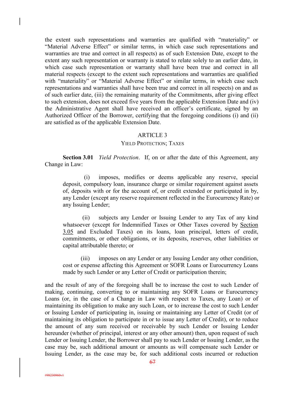 the extent such representations and warranties are qualified with “materiality” or “Material Adverse Effect” or similar terms, in which case such representations and warranties are true and correct in all respects) as of such Extension Date, except to the extent any such representation or warranty is stated to relate solely to an earlier date, in which case such representation or warranty shall have been true and correct in all material respects (except to the extent such representations and warranties are qualified with “materiality” or “Material Adverse Effect” or similar terms, in which case such representations and warranties shall have been true and correct in all respects) on and as of such earlier date, (iii) the remaining maturity of the Commitments, after giving effect to such extension, does not exceed five years from the applicable Extension Date and (iv) the Administrative Agent shall have received an officer’s certificate, signed by an Authorized Officer of the Borrower, certifying that the foregoing conditions (i) and (ii) are satisfied as of the applicable Extension Date. ARTICLE 3 YIELD PROTECTION; TAXES Section 3.01 Yield Protection. If, on or after the date of this Agreement, any Change in Law: (i) imposes, modifies or deems applicable any reserve, special deposit, compulsory loan, insurance charge or similar requirement against assets of, deposits with or for the account of, or credit extended or participated in by, any Lender (except any reserve requirement reflected in the Eurocurrency Rate) or any Issuing Lender; (ii) subjects any Lender or Issuing Lender to any Tax of any kind whatsoever (except for Indemnified Taxes or Other Taxes covered by Section 3.05 and Excluded Taxes) on its loans, loan principal, letters of credit, commitments, or other obligations, or its deposits, reserves, other liabilities or capital attributable thereto; or (iii) imposes on any Lender or any Issuing Lender any other condition, cost or expense affecting this Agreement or SOFR Loans or Eurocurrency Loans made by such Lender or any Letter of Credit or participation therein; and the result of any of the foregoing shall be to increase the cost to such Lender of making, continuing, converting to or maintaining any SOFR Loans or Eurocurrency Loans (or, in the case of a Change in Law with respect to Taxes, any Loan) or of maintaining its obligation to make any such Loan, or to increase the cost to such Lender or Issuing Lender of participating in, issuing or maintaining any Letter of Credit (or of maintaining its obligation to participate in or to issue any Letter of Credit), or to reduce the amount of any sum received or receivable by such Lender or Issuing Lender hereunder (whether of principal, interest or any other amount) then, upon request of such Lender or Issuing Lender, the Borrower shall pay to such Lender or Issuing Lender, as the case may be, such additional amount or amounts as will compensate such Lender or Issuing Lender, as the case may be, for such additional costs incurred or reduction 67 #98230960v1