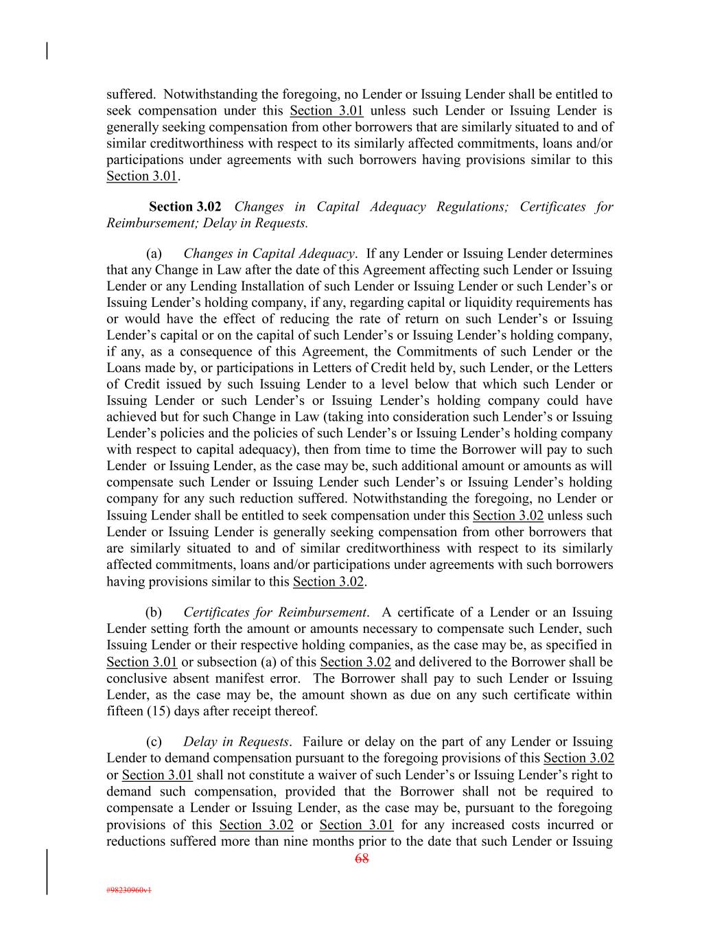 suffered. Notwithstanding the foregoing, no Lender or Issuing Lender shall be entitled to seek compensation under this Section 3.01 unless such Lender or Issuing Lender is generally seeking compensation from other borrowers that are similarly situated to and of similar creditworthiness with respect to its similarly affected commitments, loans and/or participations under agreements with such borrowers having provisions similar to this Section 3.01. Section 3.02 Changes in Capital Adequacy Regulations; Certificates for Reimbursement; Delay in Requests. (a) Changes in Capital Adequacy. If any Lender or Issuing Lender determines that any Change in Law after the date of this Agreement affecting such Lender or Issuing Lender or any Lending Installation of such Lender or Issuing Lender or such Lender’s or Issuing Lender’s holding company, if any, regarding capital or liquidity requirements has or would have the effect of reducing the rate of return on such Lender’s or Issuing Lender’s capital or on the capital of such Lender’s or Issuing Lender’s holding company, if any, as a consequence of this Agreement, the Commitments of such Lender or the Loans made by, or participations in Letters of Credit held by, such Lender, or the Letters of Credit issued by such Issuing Lender to a level below that which such Lender or Issuing Lender or such Lender’s or Issuing Lender’s holding company could have achieved but for such Change in Law (taking into consideration such Lender’s or Issuing Lender’s policies and the policies of such Lender’s or Issuing Lender’s holding company with respect to capital adequacy), then from time to time the Borrower will pay to such Lender or Issuing Lender, as the case may be, such additional amount or amounts as will compensate such Lender or Issuing Lender such Lender’s or Issuing Lender’s holding company for any such reduction suffered. Notwithstanding the foregoing, no Lender or Issuing Lender shall be entitled to seek compensation under this Section 3.02 unless such Lender or Issuing Lender is generally seeking compensation from other borrowers that are similarly situated to and of similar creditworthiness with respect to its similarly affected commitments, loans and/or participations under agreements with such borrowers having provisions similar to this Section 3.02. (b) Certificates for Reimbursement. A certificate of a Lender or an Issuing Lender setting forth the amount or amounts necessary to compensate such Lender, such Issuing Lender or their respective holding companies, as the case may be, as specified in Section 3.01 or subsection (a) of this Section 3.02 and delivered to the Borrower shall be conclusive absent manifest error. The Borrower shall pay to such Lender or Issuing Lender, as the case may be, the amount shown as due on any such certificate within fifteen (15) days after receipt thereof. (c) Delay in Requests. Failure or delay on the part of any Lender or Issuing Lender to demand compensation pursuant to the foregoing provisions of this Section 3.02 or Section 3.01 shall not constitute a waiver of such Lender’s or Issuing Lender’s right to demand such compensation, provided that the Borrower shall not be required to compensate a Lender or Issuing Lender, as the case may be, pursuant to the foregoing provisions of this Section 3.02 or Section 3.01 for any increased costs incurred or reductions suffered more than nine months prior to the date that such Lender or Issuing 68 #98230960v1