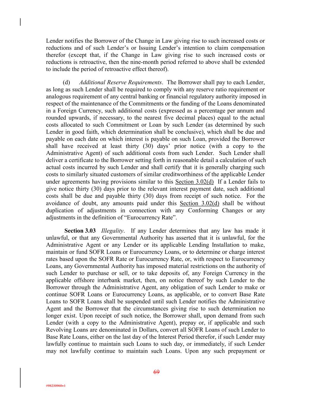 Lender notifies the Borrower of the Change in Law giving rise to such increased costs or reductions and of such Lender’s or Issuing Lender’s intention to claim compensation therefor (except that, if the Change in Law giving rise to such increased costs or reductions is retroactive, then the nine-month period referred to above shall be extended to include the period of retroactive effect thereof). (d) Additional Reserve Requirements. The Borrower shall pay to each Lender, as long as such Lender shall be required to comply with any reserve ratio requirement or analogous requirement of any central banking or financial regulatory authority imposed in respect of the maintenance of the Commitments or the funding of the Loans denominated in a Foreign Currency, such additional costs (expressed as a percentage per annum and rounded upwards, if necessary, to the nearest five decimal places) equal to the actual costs allocated to such Commitment or Loan by such Lender (as determined by such Lender in good faith, which determination shall be conclusive), which shall be due and payable on each date on which interest is payable on such Loan, provided the Borrower shall have received at least thirty (30) days’ prior notice (with a copy to the Administrative Agent) of such additional costs from such Lender. Such Lender shall deliver a certificate to the Borrower setting forth in reasonable detail a calculation of such actual costs incurred by such Lender and shall certify that it is generally charging such costs to similarly situated customers of similar creditworthiness of the applicable Lender under agreements having provisions similar to this Section 3.02(d) If a Lender fails to give notice thirty (30) days prior to the relevant interest payment date, such additional costs shall be due and payable thirty (30) days from receipt of such notice. For the avoidance of doubt, any amounts paid under this Section 3.02(d) shall be without duplication of adjustments in connection with any Conforming Changes or any adjustments in the definition of “Eurocurrency Rate”. Section 3.03 Illegality. If any Lender determines that any law has made it unlawful, or that any Governmental Authority has asserted that it is unlawful, for the Administrative Agent or any Lender or its applicable Lending Installation to make, maintain or fund SOFR Loans or Eurocurrency Loans, or to determine or charge interest rates based upon the SOFR Rate or Eurocurrency Rate, or, with respect to Eurocurrency Loans, any Governmental Authority has imposed material restrictions on the authority of such Lender to purchase or sell, or to take deposits of, any Foreign Currency in the applicable offshore interbank market, then, on notice thereof by such Lender to the Borrower through the Administrative Agent, any obligation of such Lender to make or continue SOFR Loans or Eurocurrency Loans, as applicable, or to convert Base Rate Loans to SOFR Loans shall be suspended until such Lender notifies the Administrative Agent and the Borrower that the circumstances giving rise to such determination no longer exist. Upon receipt of such notice, the Borrower shall, upon demand from such Lender (with a copy to the Administrative Agent), prepay or, if applicable and such Revolving Loans are denominated in Dollars, convert all SOFR Loans of such Lender to Base Rate Loans, either on the last day of the Interest Period therefor, if such Lender may lawfully continue to maintain such Loans to such day, or immediately, if such Lender may not lawfully continue to maintain such Loans. Upon any such prepayment or 69 #98230960v1