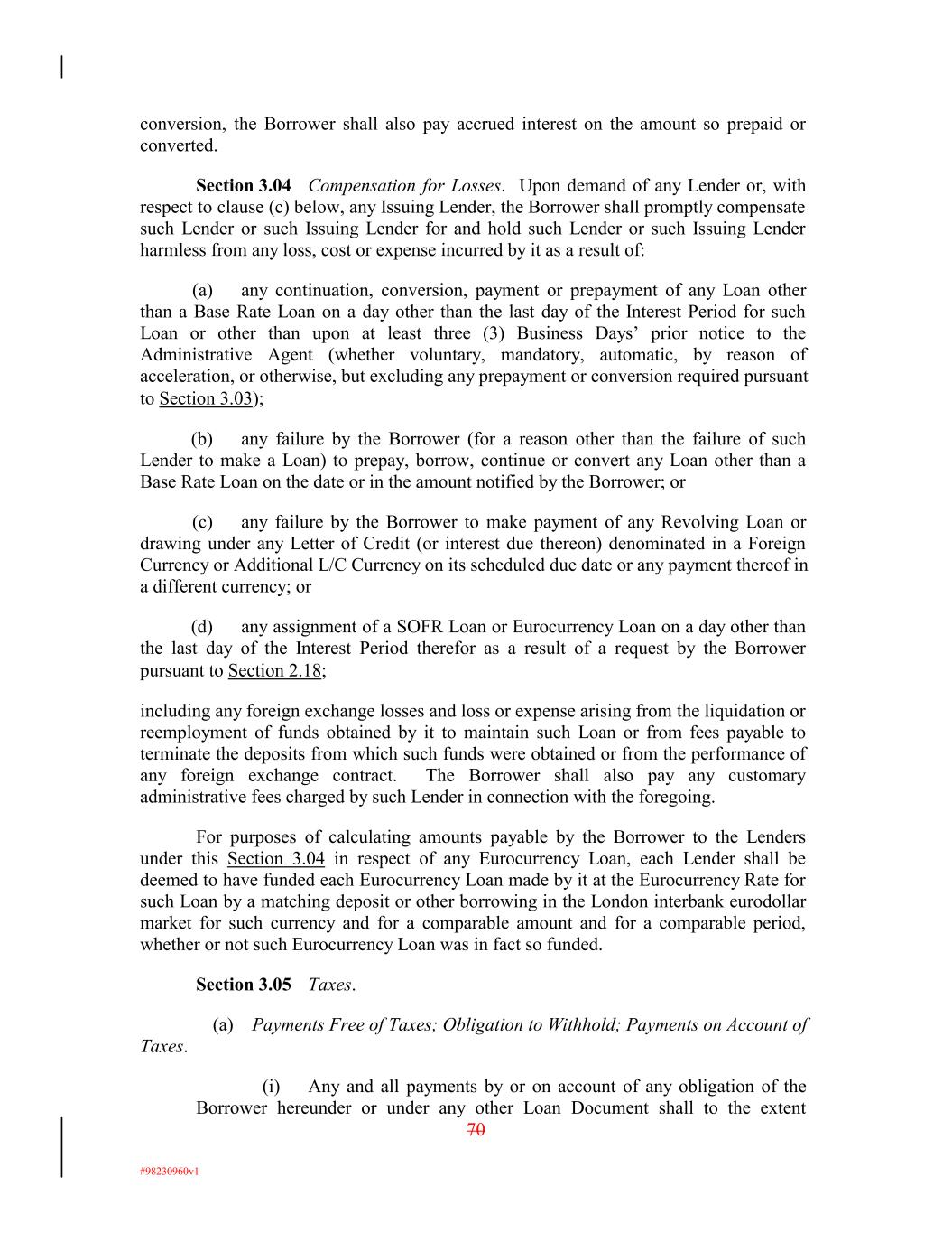 conversion, the Borrower shall also pay accrued interest on the amount so prepaid or converted. Section 3.04 Compensation for Losses. Upon demand of any Lender or, with respect to clause (c) below, any Issuing Lender, the Borrower shall promptly compensate such Lender or such Issuing Lender for and hold such Lender or such Issuing Lender harmless from any loss, cost or expense incurred by it as a result of: (a) any continuation, conversion, payment or prepayment of any Loan other than a Base Rate Loan on a day other than the last day of the Interest Period for such Loan or other than upon at least three (3) Business Days’ prior notice to the Administrative Agent (whether voluntary, mandatory, automatic, by reason of acceleration, or otherwise, but excluding any prepayment or conversion required pursuant to Section 3.03); (b) any failure by the Borrower (for a reason other than the failure of such Lender to make a Loan) to prepay, borrow, continue or convert any Loan other than a Base Rate Loan on the date or in the amount notified by the Borrower; or (c) any failure by the Borrower to make payment of any Revolving Loan or drawing under any Letter of Credit (or interest due thereon) denominated in a Foreign Currency or Additional L/C Currency on its scheduled due date or any payment thereof in a different currency; or (d) any assignment of a SOFR Loan or Eurocurrency Loan on a day other than the last day of the Interest Period therefor as a result of a request by the Borrower pursuant to Section 2.18; including any foreign exchange losses and loss or expense arising from the liquidation or reemployment of funds obtained by it to maintain such Loan or from fees payable to terminate the deposits from which such funds were obtained or from the performance of any foreign exchange contract. The Borrower shall also pay any customary administrative fees charged by such Lender in connection with the foregoing. For purposes of calculating amounts payable by the Borrower to the Lenders under this Section 3.04 in respect of any Eurocurrency Loan, each Lender shall be deemed to have funded each Eurocurrency Loan made by it at the Eurocurrency Rate for such Loan by a matching deposit or other borrowing in the London interbank eurodollar market for such currency and for a comparable amount and for a comparable period, whether or not such Eurocurrency Loan was in fact so funded. Section 3.05 Taxes. (a) Payments Free of Taxes; Obligation to Withhold; Payments on Account of Taxes. (i) Any and all payments by or on account of any obligation of the Borrower hereunder or under any other Loan Document shall to the extent 70 #98230960v1