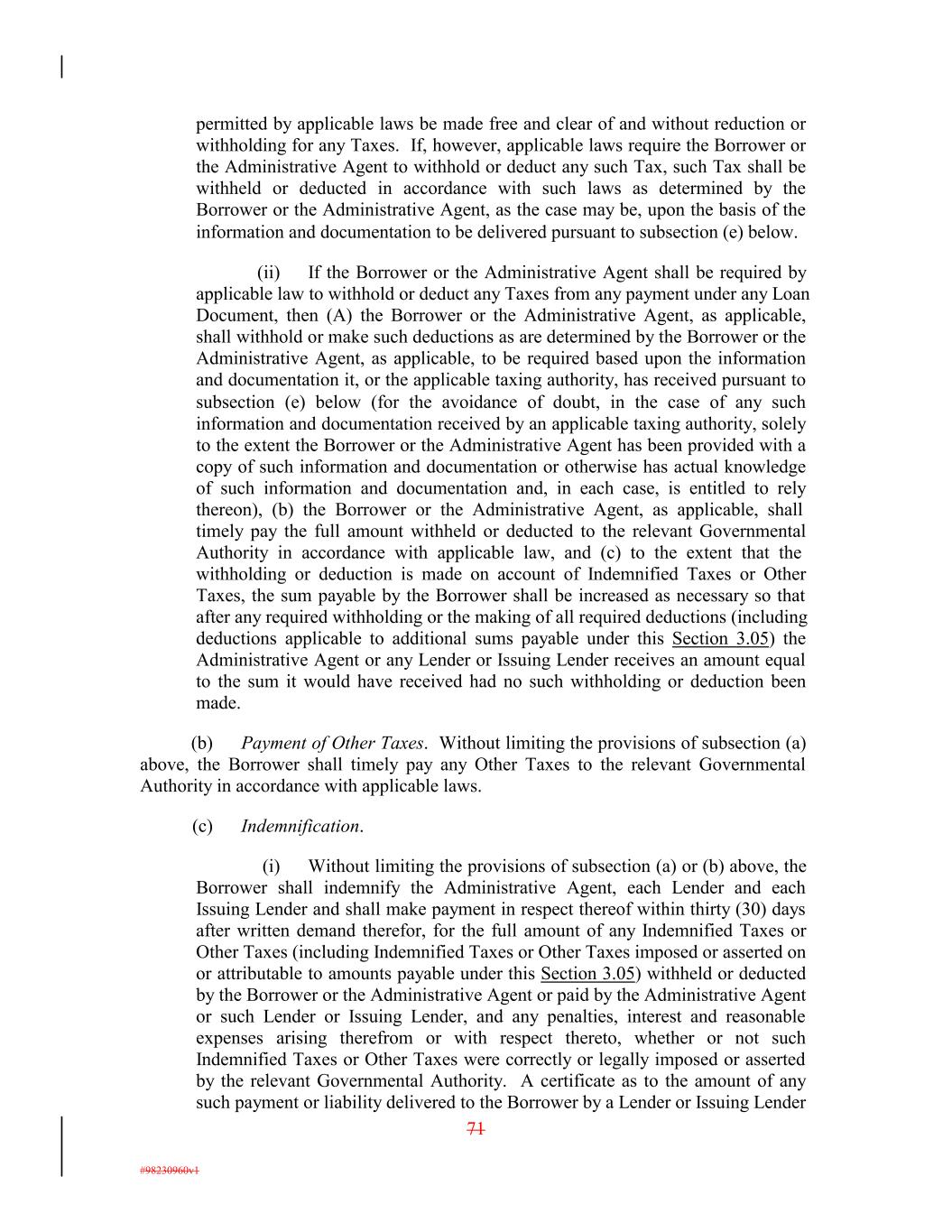 permitted by applicable laws be made free and clear of and without reduction or withholding for any Taxes. If, however, applicable laws require the Borrower or the Administrative Agent to withhold or deduct any such Tax, such Tax shall be withheld or deducted in accordance with such laws as determined by the Borrower or the Administrative Agent, as the case may be, upon the basis of the information and documentation to be delivered pursuant to subsection (e) below. (ii) If the Borrower or the Administrative Agent shall be required by applicable law to withhold or deduct any Taxes from any payment under any Loan Document, then (A) the Borrower or the Administrative Agent, as applicable, shall withhold or make such deductions as are determined by the Borrower or the Administrative Agent, as applicable, to be required based upon the information and documentation it, or the applicable taxing authority, has received pursuant to subsection (e) below (for the avoidance of doubt, in the case of any such information and documentation received by an applicable taxing authority, solely to the extent the Borrower or the Administrative Agent has been provided with a copy of such information and documentation or otherwise has actual knowledge of such information and documentation and, in each case, is entitled to rely thereon), (b) the Borrower or the Administrative Agent, as applicable, shall timely pay the full amount withheld or deducted to the relevant Governmental Authority in accordance with applicable law, and (c) to the extent that the withholding or deduction is made on account of Indemnified Taxes or Other Taxes, the sum payable by the Borrower shall be increased as necessary so that after any required withholding or the making of all required deductions (including deductions applicable to additional sums payable under this Section 3.05) the Administrative Agent or any Lender or Issuing Lender receives an amount equal to the sum it would have received had no such withholding or deduction been made. (b) Payment of Other Taxes. Without limiting the provisions of subsection (a) above, the Borrower shall timely pay any Other Taxes to the relevant Governmental Authority in accordance with applicable laws. (c) Indemnification. (i) Without limiting the provisions of subsection (a) or (b) above, the Borrower shall indemnify the Administrative Agent, each Lender and each Issuing Lender and shall make payment in respect thereof within thirty (30) days after written demand therefor, for the full amount of any Indemnified Taxes or Other Taxes (including Indemnified Taxes or Other Taxes imposed or asserted on or attributable to amounts payable under this Section 3.05) withheld or deducted by the Borrower or the Administrative Agent or paid by the Administrative Agent or such Lender or Issuing Lender, and any penalties, interest and reasonable expenses arising therefrom or with respect thereto, whether or not such Indemnified Taxes or Other Taxes were correctly or legally imposed or asserted by the relevant Governmental Authority. A certificate as to the amount of any such payment or liability delivered to the Borrower by a Lender or Issuing Lender 71 #98230960v1