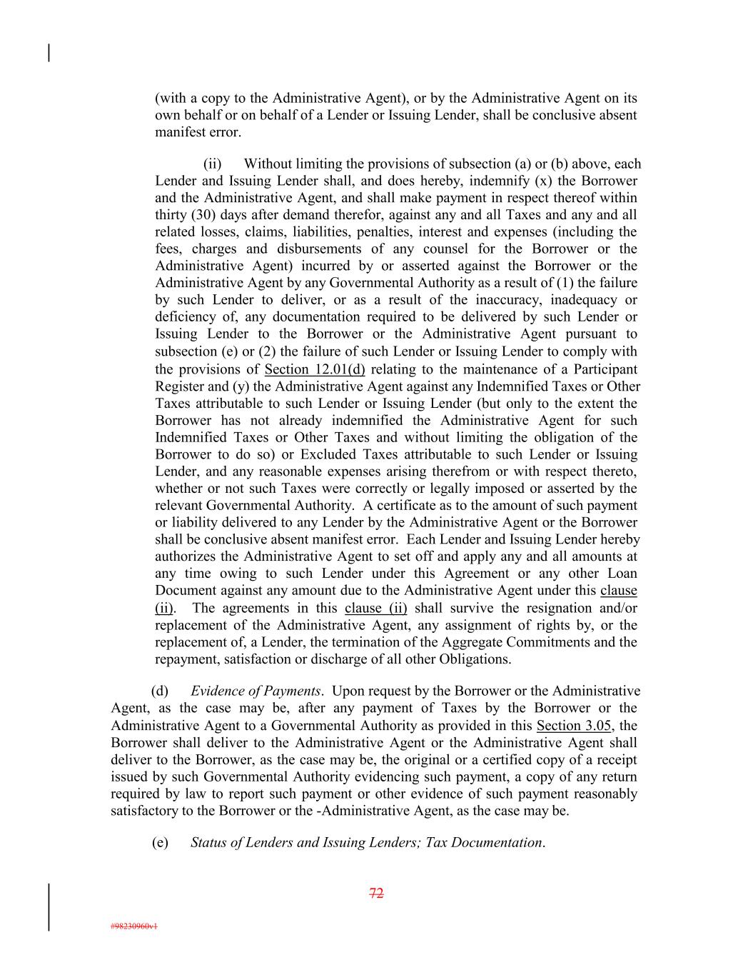 (with a copy to the Administrative Agent), or by the Administrative Agent on its own behalf or on behalf of a Lender or Issuing Lender, shall be conclusive absent manifest error. (ii) Without limiting the provisions of subsection (a) or (b) above, each Lender and Issuing Lender shall, and does hereby, indemnify (x) the Borrower and the Administrative Agent, and shall make payment in respect thereof within thirty (30) days after demand therefor, against any and all Taxes and any and all related losses, claims, liabilities, penalties, interest and expenses (including the fees, charges and disbursements of any counsel for the Borrower or the Administrative Agent) incurred by or asserted against the Borrower or the Administrative Agent by any Governmental Authority as a result of (1) the failure by such Lender to deliver, or as a result of the inaccuracy, inadequacy or deficiency of, any documentation required to be delivered by such Lender or Issuing Lender to the Borrower or the Administrative Agent pursuant to subsection (e) or (2) the failure of such Lender or Issuing Lender to comply with the provisions of Section 12.01(d) relating to the maintenance of a Participant Register and (y) the Administrative Agent against any Indemnified Taxes or Other Taxes attributable to such Lender or Issuing Lender (but only to the extent the Borrower has not already indemnified the Administrative Agent for such Indemnified Taxes or Other Taxes and without limiting the obligation of the Borrower to do so) or Excluded Taxes attributable to such Lender or Issuing Lender, and any reasonable expenses arising therefrom or with respect thereto, whether or not such Taxes were correctly or legally imposed or asserted by the relevant Governmental Authority. A certificate as to the amount of such payment or liability delivered to any Lender by the Administrative Agent or the Borrower shall be conclusive absent manifest error. Each Lender and Issuing Lender hereby authorizes the Administrative Agent to set off and apply any and all amounts at any time owing to such Lender under this Agreement or any other Loan Document against any amount due to the Administrative Agent under this clause (ii). The agreements in this clause (ii) shall survive the resignation and/or replacement of the Administrative Agent, any assignment of rights by, or the replacement of, a Lender, the termination of the Aggregate Commitments and the repayment, satisfaction or discharge of all other Obligations. (d) Evidence of Payments. Upon request by the Borrower or the Administrative Agent, as the case may be, after any payment of Taxes by the Borrower or the Administrative Agent to a Governmental Authority as provided in this Section 3.05, the Borrower shall deliver to the Administrative Agent or the Administrative Agent shall deliver to the Borrower, as the case may be, the original or a certified copy of a receipt issued by such Governmental Authority evidencing such payment, a copy of any return required by law to report such payment or other evidence of such payment reasonably satisfactory to the Borrower or the -Administrative Agent, as the case may be. (e) Status of Lenders and Issuing Lenders; Tax Documentation. 72 #98230960v1