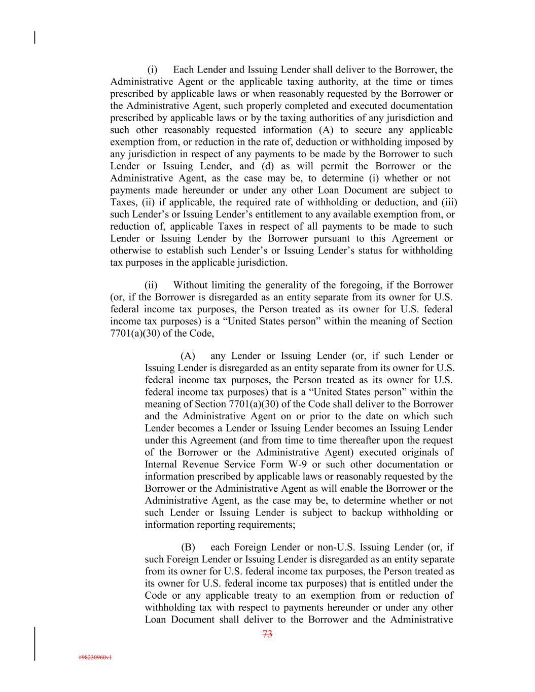 (i) Each Lender and Issuing Lender shall deliver to the Borrower, the Administrative Agent or the applicable taxing authority, at the time or times prescribed by applicable laws or when reasonably requested by the Borrower or the Administrative Agent, such properly completed and executed documentation prescribed by applicable laws or by the taxing authorities of any jurisdiction and such other reasonably requested information (A) to secure any applicable exemption from, or reduction in the rate of, deduction or withholding imposed by any jurisdiction in respect of any payments to be made by the Borrower to such Lender or Issuing Lender, and (d) as will permit the Borrower or the Administrative Agent, as the case may be, to determine (i) whether or not payments made hereunder or under any other Loan Document are subject to Taxes, (ii) if applicable, the required rate of withholding or deduction, and (iii) such Lender’s or Issuing Lender’s entitlement to any available exemption from, or reduction of, applicable Taxes in respect of all payments to be made to such Lender or Issuing Lender by the Borrower pursuant to this Agreement or otherwise to establish such Lender’s or Issuing Lender’s status for withholding tax purposes in the applicable jurisdiction. (ii) Without limiting the generality of the foregoing, if the Borrower (or, if the Borrower is disregarded as an entity separate from its owner for U.S. federal income tax purposes, the Person treated as its owner for U.S. federal income tax purposes) is a “United States person” within the meaning of Section 7701(a)(30) of the Code, (A) any Lender or Issuing Lender (or, if such Lender or Issuing Lender is disregarded as an entity separate from its owner for U.S. federal income tax purposes, the Person treated as its owner for U.S. federal income tax purposes) that is a “United States person” within the meaning of Section 7701(a)(30) of the Code shall deliver to the Borrower and the Administrative Agent on or prior to the date on which such Lender becomes a Lender or Issuing Lender becomes an Issuing Lender under this Agreement (and from time to time thereafter upon the request of the Borrower or the Administrative Agent) executed originals of Internal Revenue Service Form W-9 or such other documentation or information prescribed by applicable laws or reasonably requested by the Borrower or the Administrative Agent as will enable the Borrower or the Administrative Agent, as the case may be, to determine whether or not such Lender or Issuing Lender is subject to backup withholding or information reporting requirements; (B) each Foreign Lender or non-U.S. Issuing Lender (or, if such Foreign Lender or Issuing Lender is disregarded as an entity separate from its owner for U.S. federal income tax purposes, the Person treated as its owner for U.S. federal income tax purposes) that is entitled under the Code or any applicable treaty to an exemption from or reduction of withholding tax with respect to payments hereunder or under any other Loan Document shall deliver to the Borrower and the Administrative 73 #98230960v1