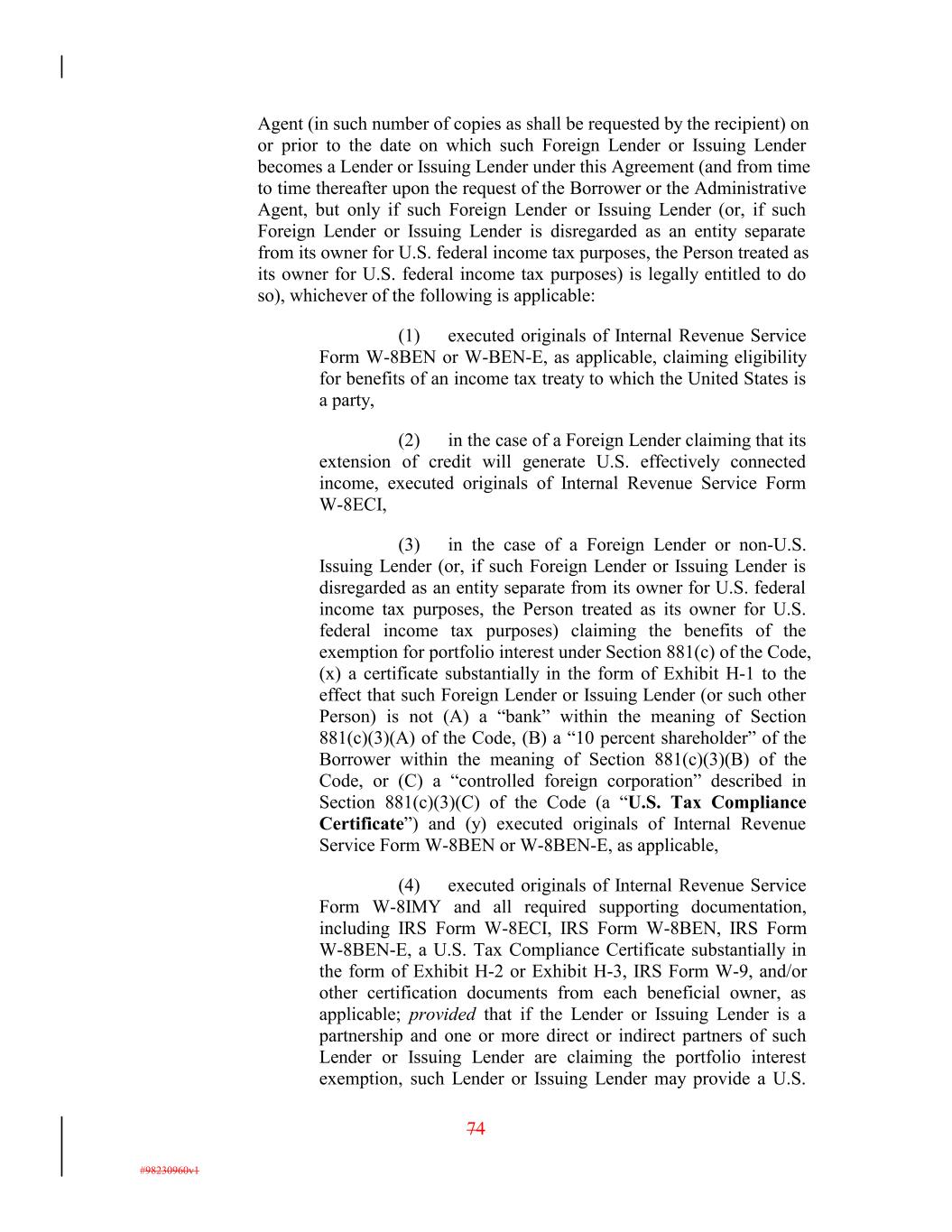 Agent (in such number of copies as shall be requested by the recipient) on or prior to the date on which such Foreign Lender or Issuing Lender becomes a Lender or Issuing Lender under this Agreement (and from time to time thereafter upon the request of the Borrower or the Administrative Agent, but only if such Foreign Lender or Issuing Lender (or, if such Foreign Lender or Issuing Lender is disregarded as an entity separate from its owner for U.S. federal income tax purposes, the Person treated as its owner for U.S. federal income tax purposes) is legally entitled to do so), whichever of the following is applicable: (1) executed originals of Internal Revenue Service Form W-8BEN or W-BEN-E, as applicable, claiming eligibility for benefits of an income tax treaty to which the United States is a party, (2) in the case of a Foreign Lender claiming that its extension of credit will generate U.S. effectively connected income, executed originals of Internal Revenue Service Form W-8ECI, (3) in the case of a Foreign Lender or non-U.S. Issuing Lender (or, if such Foreign Lender or Issuing Lender is disregarded as an entity separate from its owner for U.S. federal income tax purposes, the Person treated as its owner for U.S. federal income tax purposes) claiming the benefits of the exemption for portfolio interest under Section 881(c) of the Code, (x) a certificate substantially in the form of Exhibit H-1 to the effect that such Foreign Lender or Issuing Lender (or such other Person) is not (A) a “bank” within the meaning of Section 881(c)(3)(A) of the Code, (B) a “10 percent shareholder” of the Borrower within the meaning of Section 881(c)(3)(B) of the Code, or (C) a “controlled foreign corporation” described in Section 881(c)(3)(C) of the Code (a “U.S. Tax Compliance Certificate”) and (y) executed originals of Internal Revenue Service Form W-8BEN or W-8BEN-E, as applicable, (4) executed originals of Internal Revenue Service Form W-8IMY and all required supporting documentation, including IRS Form W-8ECI, IRS Form W-8BEN, IRS Form W-8BEN-E, a U.S. Tax Compliance Certificate substantially in the form of Exhibit H-2 or Exhibit H-3, IRS Form W-9, and/or other certification documents from each beneficial owner, as applicable; provided that if the Lender or Issuing Lender is a partnership and one or more direct or indirect partners of such Lender or Issuing Lender are claiming the portfolio interest exemption, such Lender or Issuing Lender may provide a U.S. 74 #98230960v1