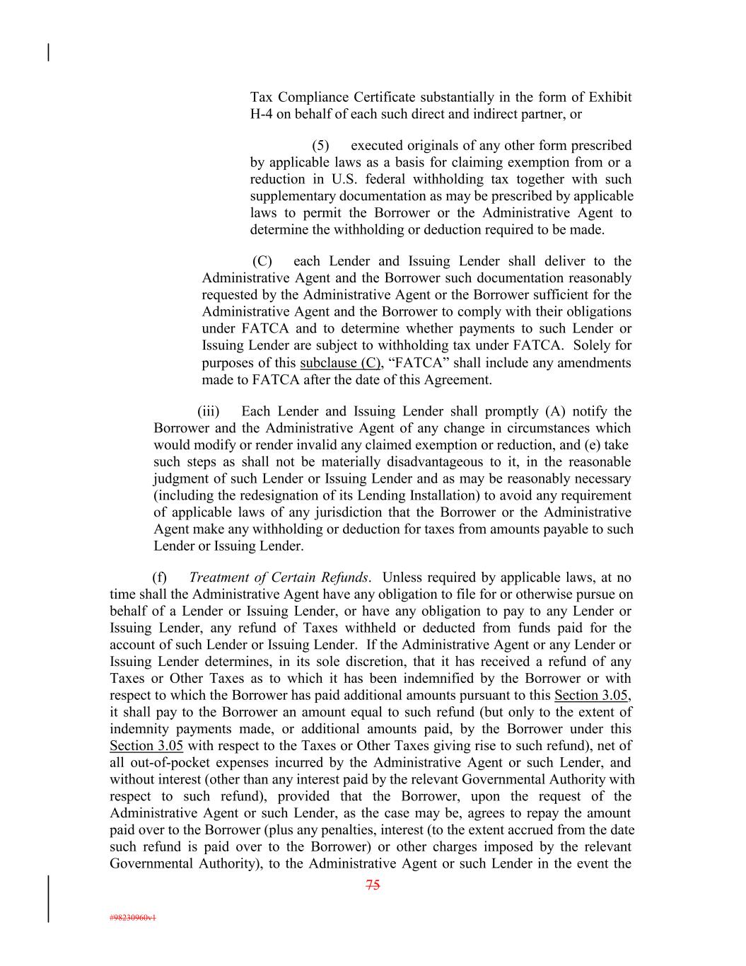 Tax Compliance Certificate substantially in the form of Exhibit H-4 on behalf of each such direct and indirect partner, or (5) executed originals of any other form prescribed by applicable laws as a basis for claiming exemption from or a reduction in U.S. federal withholding tax together with such supplementary documentation as may be prescribed by applicable laws to permit the Borrower or the Administrative Agent to determine the withholding or deduction required to be made. (C) each Lender and Issuing Lender shall deliver to the Administrative Agent and the Borrower such documentation reasonably requested by the Administrative Agent or the Borrower sufficient for the Administrative Agent and the Borrower to comply with their obligations under FATCA and to determine whether payments to such Lender or Issuing Lender are subject to withholding tax under FATCA. Solely for purposes of this subclause (C), “FATCA” shall include any amendments made to FATCA after the date of this Agreement. (iii) Each Lender and Issuing Lender shall promptly (A) notify the Borrower and the Administrative Agent of any change in circumstances which would modify or render invalid any claimed exemption or reduction, and (e) take such steps as shall not be materially disadvantageous to it, in the reasonable judgment of such Lender or Issuing Lender and as may be reasonably necessary (including the redesignation of its Lending Installation) to avoid any requirement of applicable laws of any jurisdiction that the Borrower or the Administrative Agent make any withholding or deduction for taxes from amounts payable to such Lender or Issuing Lender. (f) Treatment of Certain Refunds. Unless required by applicable laws, at no time shall the Administrative Agent have any obligation to file for or otherwise pursue on behalf of a Lender or Issuing Lender, or have any obligation to pay to any Lender or Issuing Lender, any refund of Taxes withheld or deducted from funds paid for the account of such Lender or Issuing Lender. If the Administrative Agent or any Lender or Issuing Lender determines, in its sole discretion, that it has received a refund of any Taxes or Other Taxes as to which it has been indemnified by the Borrower or with respect to which the Borrower has paid additional amounts pursuant to this Section 3.05, it shall pay to the Borrower an amount equal to such refund (but only to the extent of indemnity payments made, or additional amounts paid, by the Borrower under this Section 3.05 with respect to the Taxes or Other Taxes giving rise to such refund), net of all out-of-pocket expenses incurred by the Administrative Agent or such Lender, and without interest (other than any interest paid by the relevant Governmental Authority with respect to such refund), provided that the Borrower, upon the request of the Administrative Agent or such Lender, as the case may be, agrees to repay the amount paid over to the Borrower (plus any penalties, interest (to the extent accrued from the date such refund is paid over to the Borrower) or other charges imposed by the relevant Governmental Authority), to the Administrative Agent or such Lender in the event the 75 #98230960v1