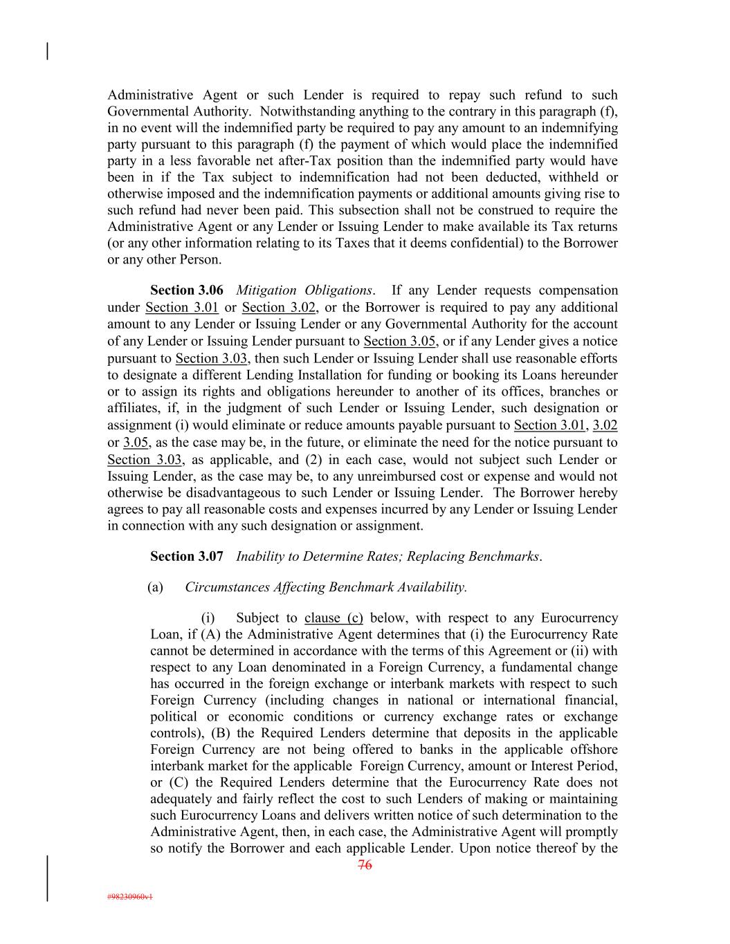 Administrative Agent or such Lender is required to repay such refund to such Governmental Authority. Notwithstanding anything to the contrary in this paragraph (f), in no event will the indemnified party be required to pay any amount to an indemnifying party pursuant to this paragraph (f) the payment of which would place the indemnified party in a less favorable net after-Tax position than the indemnified party would have been in if the Tax subject to indemnification had not been deducted, withheld or otherwise imposed and the indemnification payments or additional amounts giving rise to such refund had never been paid. This subsection shall not be construed to require the Administrative Agent or any Lender or Issuing Lender to make available its Tax returns (or any other information relating to its Taxes that it deems confidential) to the Borrower or any other Person. Section 3.06 Mitigation Obligations. If any Lender requests compensation under Section 3.01 or Section 3.02, or the Borrower is required to pay any additional amount to any Lender or Issuing Lender or any Governmental Authority for the account of any Lender or Issuing Lender pursuant to Section 3.05, or if any Lender gives a notice pursuant to Section 3.03, then such Lender or Issuing Lender shall use reasonable efforts to designate a different Lending Installation for funding or booking its Loans hereunder or to assign its rights and obligations hereunder to another of its offices, branches or affiliates, if, in the judgment of such Lender or Issuing Lender, such designation or assignment (i) would eliminate or reduce amounts payable pursuant to Section 3.01, 3.02 or 3.05, as the case may be, in the future, or eliminate the need for the notice pursuant to Section 3.03, as applicable, and (2) in each case, would not subject such Lender or Issuing Lender, as the case may be, to any unreimbursed cost or expense and would not otherwise be disadvantageous to such Lender or Issuing Lender. The Borrower hereby agrees to pay all reasonable costs and expenses incurred by any Lender or Issuing Lender in connection with any such designation or assignment. Section 3.07 Inability to Determine Rates; Replacing Benchmarks. (a) Circumstances Affecting Benchmark Availability. (i) Subject to clause (c) below, with respect to any Eurocurrency Loan, if (A) the Administrative Agent determines that (i) the Eurocurrency Rate cannot be determined in accordance with the terms of this Agreement or (ii) with respect to any Loan denominated in a Foreign Currency, a fundamental change has occurred in the foreign exchange or interbank markets with respect to such Foreign Currency (including changes in national or international financial, political or economic conditions or currency exchange rates or exchange controls), (B) the Required Lenders determine that deposits in the applicable Foreign Currency are not being offered to banks in the applicable offshore interbank market for the applicable Foreign Currency, amount or Interest Period, or (C) the Required Lenders determine that the Eurocurrency Rate does not adequately and fairly reflect the cost to such Lenders of making or maintaining such Eurocurrency Loans and delivers written notice of such determination to the Administrative Agent, then, in each case, the Administrative Agent will promptly so notify the Borrower and each applicable Lender. Upon notice thereof by the 76 #98230960v1