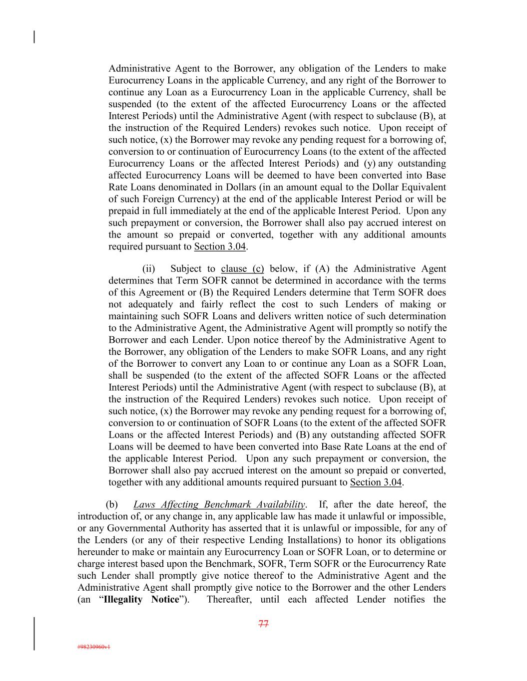 Administrative Agent to the Borrower, any obligation of the Lenders to make Eurocurrency Loans in the applicable Currency, and any right of the Borrower to continue any Loan as a Eurocurrency Loan in the applicable Currency, shall be suspended (to the extent of the affected Eurocurrency Loans or the affected Interest Periods) until the Administrative Agent (with respect to subclause (B), at the instruction of the Required Lenders) revokes such notice. Upon receipt of such notice, (x) the Borrower may revoke any pending request for a borrowing of, conversion to or continuation of Eurocurrency Loans (to the extent of the affected Eurocurrency Loans or the affected Interest Periods) and (y) any outstanding affected Eurocurrency Loans will be deemed to have been converted into Base Rate Loans denominated in Dollars (in an amount equal to the Dollar Equivalent of such Foreign Currency) at the end of the applicable Interest Period or will be prepaid in full immediately at the end of the applicable Interest Period. Upon any such prepayment or conversion, the Borrower shall also pay accrued interest on the amount so prepaid or converted, together with any additional amounts required pursuant to Section 3.04. (ii) Subject to clause (c) below, if (A) the Administrative Agent determines that Term SOFR cannot be determined in accordance with the terms of this Agreement or (B) the Required Lenders determine that Term SOFR does not adequately and fairly reflect the cost to such Lenders of making or maintaining such SOFR Loans and delivers written notice of such determination to the Administrative Agent, the Administrative Agent will promptly so notify the Borrower and each Lender. Upon notice thereof by the Administrative Agent to the Borrower, any obligation of the Lenders to make SOFR Loans, and any right of the Borrower to convert any Loan to or continue any Loan as a SOFR Loan, shall be suspended (to the extent of the affected SOFR Loans or the affected Interest Periods) until the Administrative Agent (with respect to subclause (B), at the instruction of the Required Lenders) revokes such notice. Upon receipt of such notice, (x) the Borrower may revoke any pending request for a borrowing of, conversion to or continuation of SOFR Loans (to the extent of the affected SOFR Loans or the affected Interest Periods) and (B) any outstanding affected SOFR Loans will be deemed to have been converted into Base Rate Loans at the end of the applicable Interest Period. Upon any such prepayment or conversion, the Borrower shall also pay accrued interest on the amount so prepaid or converted, together with any additional amounts required pursuant to Section 3.04. (b) Laws Affecting Benchmark Availability. If, after the date hereof, the introduction of, or any change in, any applicable law has made it unlawful or impossible, or any Governmental Authority has asserted that it is unlawful or impossible, for any of the Lenders (or any of their respective Lending Installations) to honor its obligations hereunder to make or maintain any Eurocurrency Loan or SOFR Loan, or to determine or charge interest based upon the Benchmark, SOFR, Term SOFR or the Eurocurrency Rate such Lender shall promptly give notice thereof to the Administrative Agent and the Administrative Agent shall promptly give notice to the Borrower and the other Lenders (an “Illegality Notice”). Thereafter, until each affected Lender notifies the 77 #98230960v1