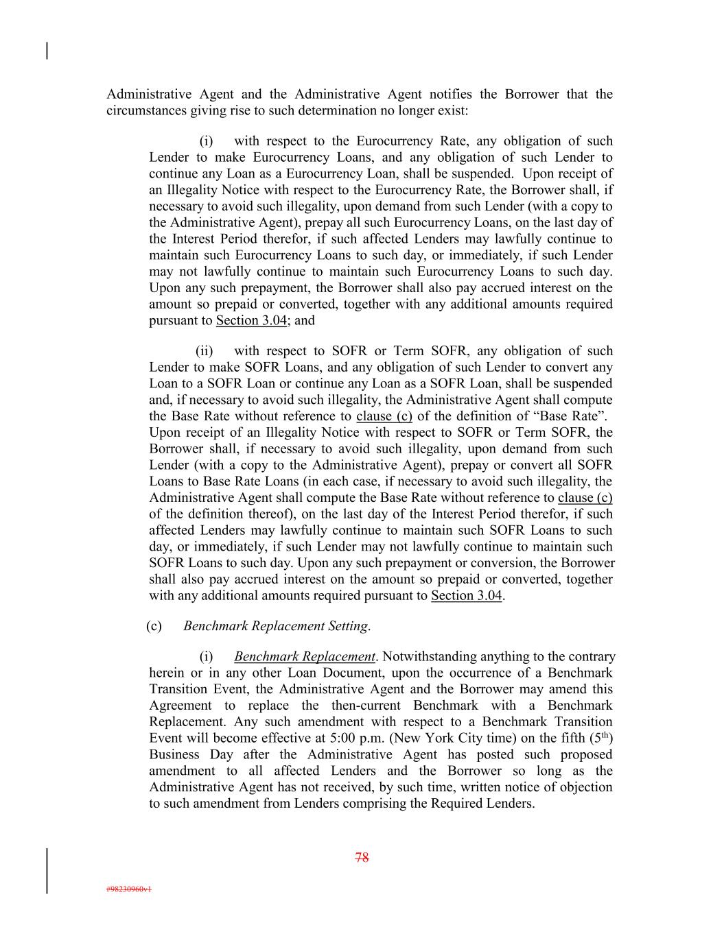 Administrative Agent and the Administrative Agent notifies the Borrower that the circumstances giving rise to such determination no longer exist: (i) with respect to the Eurocurrency Rate, any obligation of such Lender to make Eurocurrency Loans, and any obligation of such Lender to continue any Loan as a Eurocurrency Loan, shall be suspended. Upon receipt of an Illegality Notice with respect to the Eurocurrency Rate, the Borrower shall, if necessary to avoid such illegality, upon demand from such Lender (with a copy to the Administrative Agent), prepay all such Eurocurrency Loans, on the last day of the Interest Period therefor, if such affected Lenders may lawfully continue to maintain such Eurocurrency Loans to such day, or immediately, if such Lender may not lawfully continue to maintain such Eurocurrency Loans to such day. Upon any such prepayment, the Borrower shall also pay accrued interest on the amount so prepaid or converted, together with any additional amounts required pursuant to Section 3.04; and (ii) with respect to SOFR or Term SOFR, any obligation of such Lender to make SOFR Loans, and any obligation of such Lender to convert any Loan to a SOFR Loan or continue any Loan as a SOFR Loan, shall be suspended and, if necessary to avoid such illegality, the Administrative Agent shall compute the Base Rate without reference to clause (c) of the definition of “Base Rate”. Upon receipt of an Illegality Notice with respect to SOFR or Term SOFR, the Borrower shall, if necessary to avoid such illegality, upon demand from such Lender (with a copy to the Administrative Agent), prepay or convert all SOFR Loans to Base Rate Loans (in each case, if necessary to avoid such illegality, the Administrative Agent shall compute the Base Rate without reference to clause (c) of the definition thereof), on the last day of the Interest Period therefor, if such affected Lenders may lawfully continue to maintain such SOFR Loans to such day, or immediately, if such Lender may not lawfully continue to maintain such SOFR Loans to such day. Upon any such prepayment or conversion, the Borrower shall also pay accrued interest on the amount so prepaid or converted, together with any additional amounts required pursuant to Section 3.04. (c) Benchmark Replacement Setting. (i) Benchmark Replacement. Notwithstanding anything to the contrary herein or in any other Loan Document, upon the occurrence of a Benchmark Transition Event, the Administrative Agent and the Borrower may amend this Agreement to replace the then-current Benchmark with a Benchmark Replacement. Any such amendment with respect to a Benchmark Transition Event will become effective at 5:00 p.m. (New York City time) on the fifth (5th) Business Day after the Administrative Agent has posted such proposed amendment to all affected Lenders and the Borrower so long as the Administrative Agent has not received, by such time, written notice of objection to such amendment from Lenders comprising the Required Lenders. 78 #98230960v1