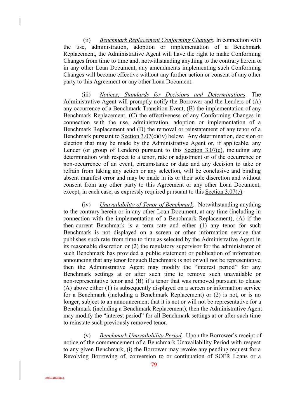 (ii) Benchmark Replacement Conforming Changes. In connection with the use, administration, adoption or implementation of a Benchmark Replacement, the Administrative Agent will have the right to make Conforming Changes from time to time and, notwithstanding anything to the contrary herein or in any other Loan Document, any amendments implementing such Conforming Changes will become effective without any further action or consent of any other party to this Agreement or any other Loan Document. (iii) Notices; Standards for Decisions and Determinations. The Administrative Agent will promptly notify the Borrower and the Lenders of (A) any occurrence of a Benchmark Transition Event, (B) the implementation of any Benchmark Replacement, (C) the effectiveness of any Conforming Changes in connection with the use, administration, adoption or implementation of a Benchmark Replacement and (D) the removal or reinstatement of any tenor of a Benchmark pursuant to Section 3.07(c)(iv) below. Any determination, decision or election that may be made by the Administrative Agent or, if applicable, any Lender (or group of Lenders) pursuant to this Section 3.07(c), including any determination with respect to a tenor, rate or adjustment or of the occurrence or non-occurrence of an event, circumstance or date and any decision to take or refrain from taking any action or any selection, will be conclusive and binding absent manifest error and may be made in its or their sole discretion and without consent from any other party to this Agreement or any other Loan Document, except, in each case, as expressly required pursuant to this Section 3.07(c). (iv) Unavailability of Tenor of Benchmark. Notwithstanding anything to the contrary herein or in any other Loan Document, at any time (including in connection with the implementation of a Benchmark Replacement), (A) if the then-current Benchmark is a term rate and either (1) any tenor for such Benchmark is not displayed on a screen or other information service that publishes such rate from time to time as selected by the Administrative Agent in its reasonable discretion or (2) the regulatory supervisor for the administrator of such Benchmark has provided a public statement or publication of information announcing that any tenor for such Benchmark is not or will not be representative, then the Administrative Agent may modify the “interest period” for any Benchmark settings at or after such time to remove such unavailable or non-representative tenor and (B) if a tenor that was removed pursuant to clause (A) above either (1) is subsequently displayed on a screen or information service for a Benchmark (including a Benchmark Replacement) or (2) is not, or is no longer, subject to an announcement that it is not or will not be representative for a Benchmark (including a Benchmark Replacement), then the Administrative Agent may modify the “interest period” for all Benchmark settings at or after such time to reinstate such previously removed tenor. (v) Benchmark Unavailability Period. Upon the Borrower’s receipt of notice of the commencement of a Benchmark Unavailability Period with respect to any given Benchmark, (i) the Borrower may revoke any pending request for a Revolving Borrowing of, conversion to or continuation of SOFR Loans or a 79 #98230960v1