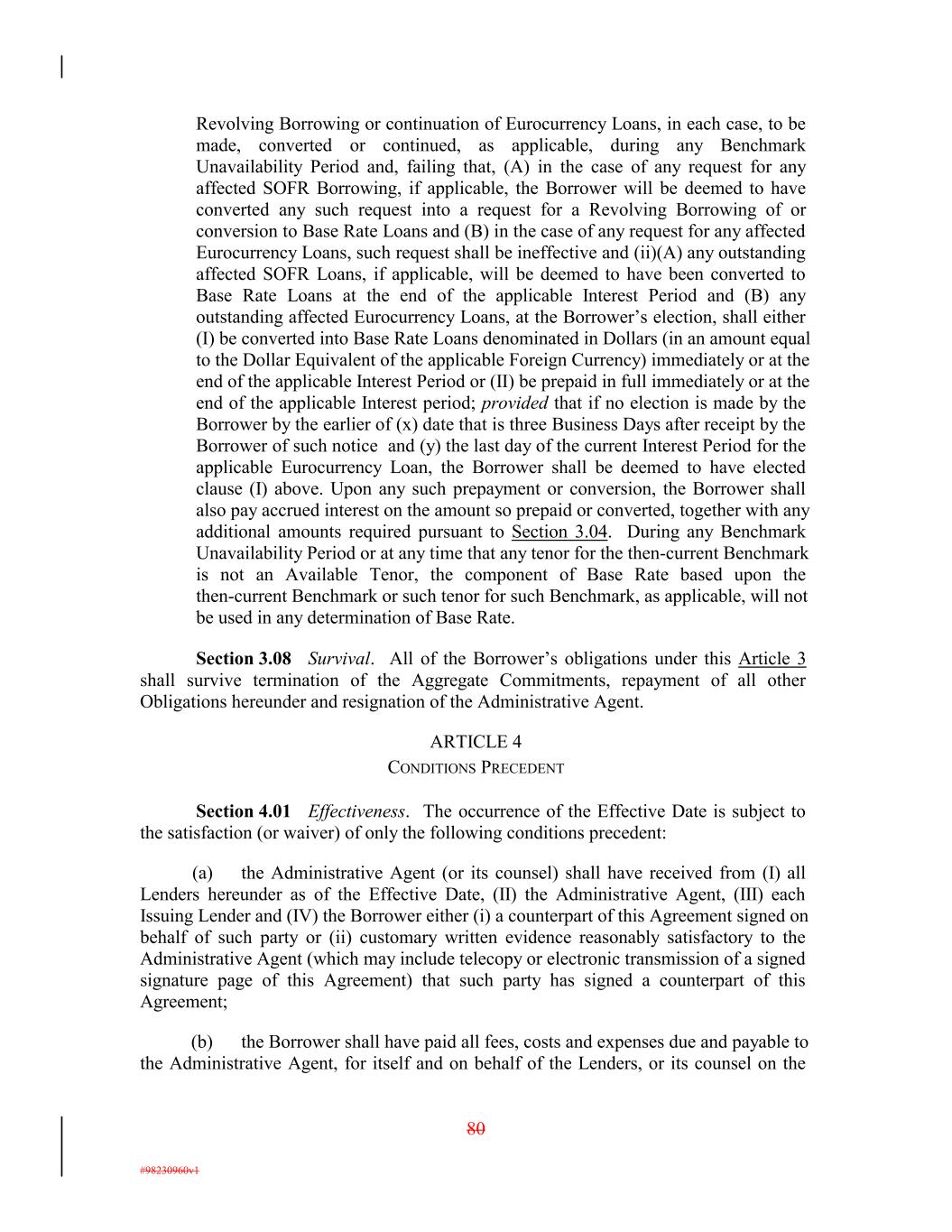 Revolving Borrowing or continuation of Eurocurrency Loans, in each case, to be made, converted or continued, as applicable, during any Benchmark Unavailability Period and, failing that, (A) in the case of any request for any affected SOFR Borrowing, if applicable, the Borrower will be deemed to have converted any such request into a request for a Revolving Borrowing of or conversion to Base Rate Loans and (B) in the case of any request for any affected Eurocurrency Loans, such request shall be ineffective and (ii)(A) any outstanding affected SOFR Loans, if applicable, will be deemed to have been converted to Base Rate Loans at the end of the applicable Interest Period and (B) any outstanding affected Eurocurrency Loans, at the Borrower’s election, shall either (I) be converted into Base Rate Loans denominated in Dollars (in an amount equal to the Dollar Equivalent of the applicable Foreign Currency) immediately or at the end of the applicable Interest Period or (II) be prepaid in full immediately or at the end of the applicable Interest period; provided that if no election is made by the Borrower by the earlier of (x) date that is three Business Days after receipt by the Borrower of such notice and (y) the last day of the current Interest Period for the applicable Eurocurrency Loan, the Borrower shall be deemed to have elected clause (I) above. Upon any such prepayment or conversion, the Borrower shall also pay accrued interest on the amount so prepaid or converted, together with any additional amounts required pursuant to Section 3.04. During any Benchmark Unavailability Period or at any time that any tenor for the then-current Benchmark is not an Available Tenor, the component of Base Rate based upon the then-current Benchmark or such tenor for such Benchmark, as applicable, will not be used in any determination of Base Rate. Section 3.08 Survival. All of the Borrower’s obligations under this Article 3 shall survive termination of the Aggregate Commitments, repayment of all other Obligations hereunder and resignation of the Administrative Agent. ARTICLE 4 CONDITIONS PRECEDENT Section 4.01 Effectiveness. The occurrence of the Effective Date is subject to the satisfaction (or waiver) of only the following conditions precedent: (a) the Administrative Agent (or its counsel) shall have received from (I) all Lenders hereunder as of the Effective Date, (II) the Administrative Agent, (III) each Issuing Lender and (IV) the Borrower either (i) a counterpart of this Agreement signed on behalf of such party or (ii) customary written evidence reasonably satisfactory to the Administrative Agent (which may include telecopy or electronic transmission of a signed signature page of this Agreement) that such party has signed a counterpart of this Agreement; (b) the Borrower shall have paid all fees, costs and expenses due and payable to the Administrative Agent, for itself and on behalf of the Lenders, or its counsel on the 80 #98230960v1