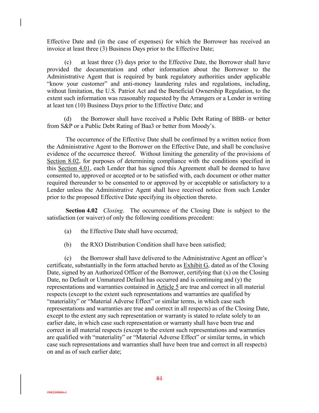 Effective Date and (in the case of expenses) for which the Borrower has received an invoice at least three (3) Business Days prior to the Effective Date; (c) at least three (3) days prior to the Effective Date, the Borrower shall have provided the documentation and other information about the Borrower to the Administrative Agent that is required by bank regulatory authorities under applicable “know your customer” and anti-money laundering rules and regulations, including, without limitation, the U.S. Patriot Act and the Beneficial Ownership Regulation, to the extent such information was reasonably requested by the Arrangers or a Lender in writing at least ten (10) Business Days prior to the Effective Date; and (d) the Borrower shall have received a Public Debt Rating of BBB- or better from S&P or a Public Debt Rating of Baa3 or better from Moody’s. The occurrence of the Effective Date shall be confirmed by a written notice from the Administrative Agent to the Borrower on the Effective Date, and shall be conclusive evidence of the occurrence thereof. Without limiting the generality of the provisions of Section 8.02, for purposes of determining compliance with the conditions specified in this Section 4.01, each Lender that has signed this Agreement shall be deemed to have consented to, approved or accepted or to be satisfied with, each document or other matter required thereunder to be consented to or approved by or acceptable or satisfactory to a Lender unless the Administrative Agent shall have received notice from such Lender prior to the proposed Effective Date specifying its objection thereto. Section 4.02 Closing. The occurrence of the Closing Date is subject to the satisfaction (or waiver) of only the following conditions precedent: (a) the Effective Date shall have occurred; (b) the RXO Distribution Condition shall have been satisfied; (c) the Borrower shall have delivered to the Administrative Agent an officer’s certificate, substantially in the form attached hereto as Exhibit G, dated as of the Closing Date, signed by an Authorized Officer of the Borrower, certifying that (x) on the Closing Date, no Default or Unmatured Default has occurred and is continuing and (y) the representations and warranties contained in Article 5 are true and correct in all material respects (except to the extent such representations and warranties are qualified by “materiality” or “Material Adverse Effect” or similar terms, in which case such representations and warranties are true and correct in all respects) as of the Closing Date, except to the extent any such representation or warranty is stated to relate solely to an earlier date, in which case such representation or warranty shall have been true and correct in all material respects (except to the extent such representations and warranties are qualified with “materiality” or “Material Adverse Effect” or similar terms, in which case such representations and warranties shall have been true and correct in all respects) on and as of such earlier date; 81 #98230960v1