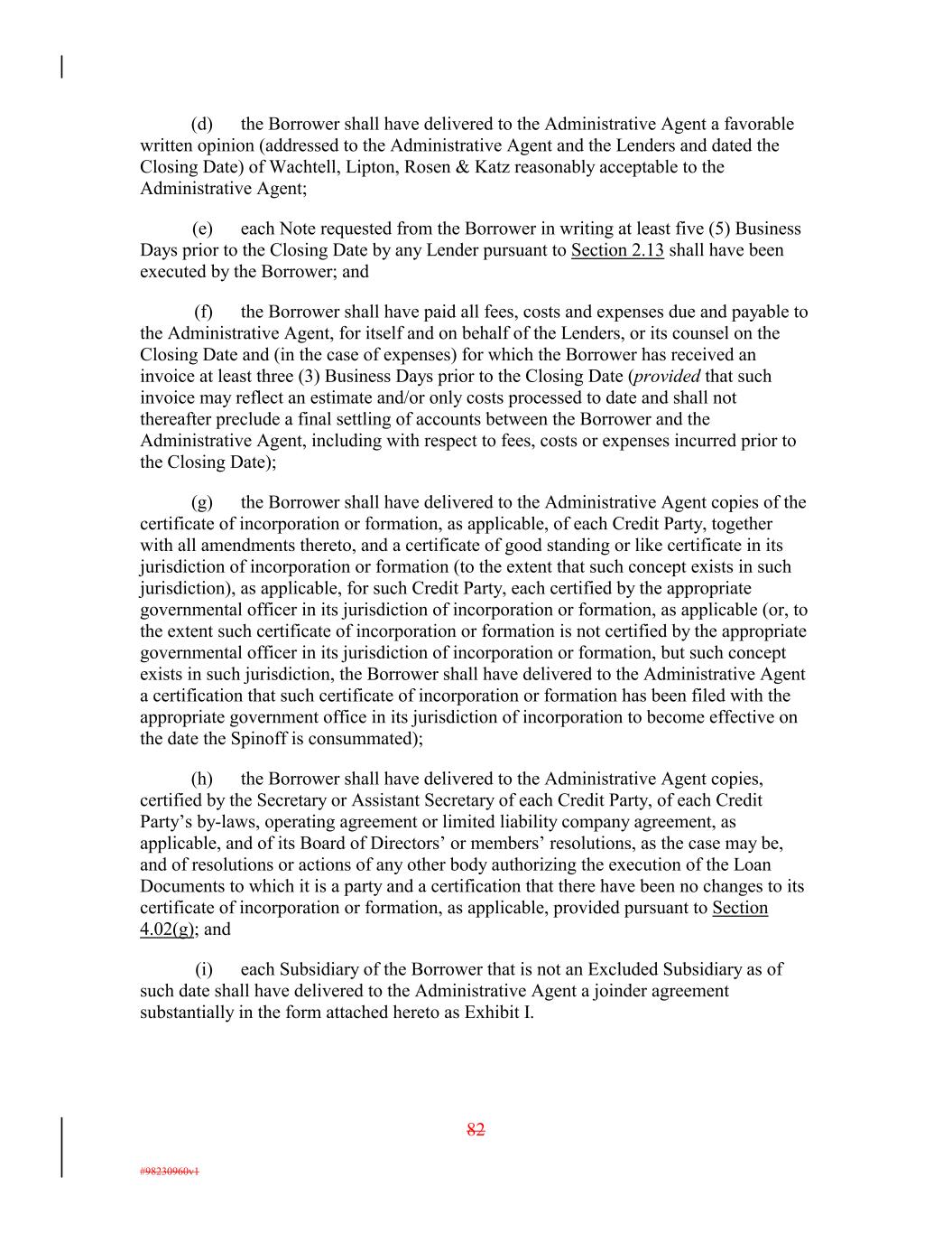 (d) the Borrower shall have delivered to the Administrative Agent a favorable written opinion (addressed to the Administrative Agent and the Lenders and dated the Closing Date) of Wachtell, Lipton, Rosen & Katz reasonably acceptable to the Administrative Agent; (e) each Note requested from the Borrower in writing at least five (5) Business Days prior to the Closing Date by any Lender pursuant to Section 2.13 shall have been executed by the Borrower; and (f) the Borrower shall have paid all fees, costs and expenses due and payable to the Administrative Agent, for itself and on behalf of the Lenders, or its counsel on the Closing Date and (in the case of expenses) for which the Borrower has received an invoice at least three (3) Business Days prior to the Closing Date (provided that such invoice may reflect an estimate and/or only costs processed to date and shall not thereafter preclude a final settling of accounts between the Borrower and the Administrative Agent, including with respect to fees, costs or expenses incurred prior to the Closing Date); (g) the Borrower shall have delivered to the Administrative Agent copies of the certificate of incorporation or formation, as applicable, of each Credit Party, together with all amendments thereto, and a certificate of good standing or like certificate in its jurisdiction of incorporation or formation (to the extent that such concept exists in such jurisdiction), as applicable, for such Credit Party, each certified by the appropriate governmental officer in its jurisdiction of incorporation or formation, as applicable (or, to the extent such certificate of incorporation or formation is not certified by the appropriate governmental officer in its jurisdiction of incorporation or formation, but such concept exists in such jurisdiction, the Borrower shall have delivered to the Administrative Agent a certification that such certificate of incorporation or formation has been filed with the appropriate government office in its jurisdiction of incorporation to become effective on the date the Spinoff is consummated); (h) the Borrower shall have delivered to the Administrative Agent copies, certified by the Secretary or Assistant Secretary of each Credit Party, of each Credit Party’s by-laws, operating agreement or limited liability company agreement, as applicable, and of its Board of Directors’ or members’ resolutions, as the case may be, and of resolutions or actions of any other body authorizing the execution of the Loan Documents to which it is a party and a certification that there have been no changes to its certificate of incorporation or formation, as applicable, provided pursuant to Section 4.02(g); and (i) each Subsidiary of the Borrower that is not an Excluded Subsidiary as of such date shall have delivered to the Administrative Agent a joinder agreement substantially in the form attached hereto as Exhibit I. 82 #98230960v1