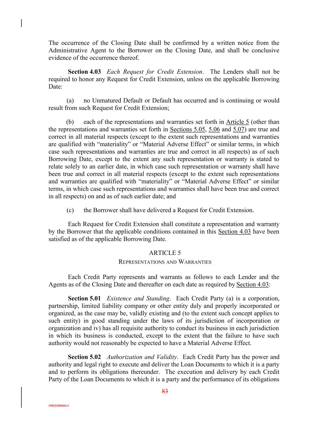 The occurrence of the Closing Date shall be confirmed by a written notice from the Administrative Agent to the Borrower on the Closing Date, and shall be conclusive evidence of the occurrence thereof. Section 4.03 Each Request for Credit Extension. The Lenders shall not be required to honor any Request for Credit Extension, unless on the applicable Borrowing Date: (a) no Unmatured Default or Default has occurred and is continuing or would result from such Request for Credit Extension; (b) each of the representations and warranties set forth in Article 5 (other than the representations and warranties set forth in Sections 5.05, 5.06 and 5.07) are true and correct in all material respects (except to the extent such representations and warranties are qualified with “materiality” or “Material Adverse Effect” or similar terms, in which case such representations and warranties are true and correct in all respects) as of such Borrowing Date, except to the extent any such representation or warranty is stated to relate solely to an earlier date, in which case such representation or warranty shall have been true and correct in all material respects (except to the extent such representations and warranties are qualified with “materiality” or “Material Adverse Effect” or similar terms, in which case such representations and warranties shall have been true and correct in all respects) on and as of such earlier date; and (c) the Borrower shall have delivered a Request for Credit Extension. Each Request for Credit Extension shall constitute a representation and warranty by the Borrower that the applicable conditions contained in this Section 4.03 have been satisfied as of the applicable Borrowing Date. ARTICLE 5 REPRESENTATIONS AND WARRANTIES Each Credit Party represents and warrants as follows to each Lender and the Agents as of the Closing Date and thereafter on each date as required by Section 4.03: Section 5.01 Existence and Standing. Each Credit Party (a) is a corporation, partnership, limited liability company or other entity duly and properly incorporated or organized, as the case may be, validly existing and (to the extent such concept applies to such entity) in good standing under the laws of its jurisdiction of incorporation or organization and iv) has all requisite authority to conduct its business in each jurisdiction in which its business is conducted, except to the extent that the failure to have such authority would not reasonably be expected to have a Material Adverse Effect. Section 5.02 Authorization and Validity. Each Credit Party has the power and authority and legal right to execute and deliver the Loan Documents to which it is a party and to perform its obligations thereunder. The execution and delivery by each Credit Party of the Loan Documents to which it is a party and the performance of its obligations 83 #98230960v1