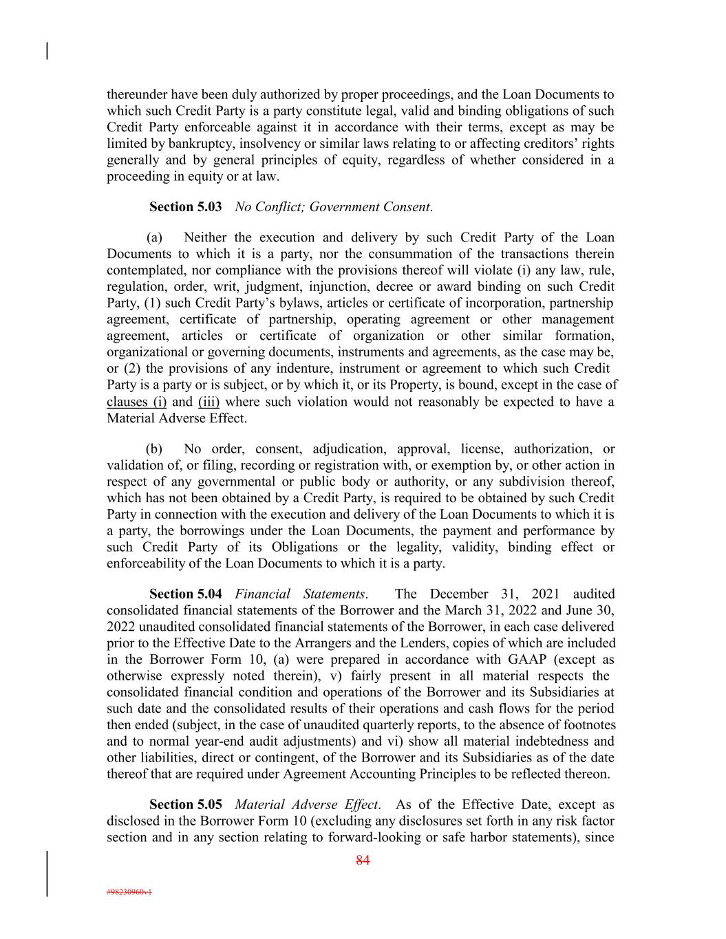 thereunder have been duly authorized by proper proceedings, and the Loan Documents to which such Credit Party is a party constitute legal, valid and binding obligations of such Credit Party enforceable against it in accordance with their terms, except as may be limited by bankruptcy, insolvency or similar laws relating to or affecting creditors’ rights generally and by general principles of equity, regardless of whether considered in a proceeding in equity or at law. Section 5.03 No Conflict; Government Consent. (a) Neither the execution and delivery by such Credit Party of the Loan Documents to which it is a party, nor the consummation of the transactions therein contemplated, nor compliance with the provisions thereof will violate (i) any law, rule, regulation, order, writ, judgment, injunction, decree or award binding on such Credit Party, (1) such Credit Party’s bylaws, articles or certificate of incorporation, partnership agreement, certificate of partnership, operating agreement or other management agreement, articles or certificate of organization or other similar formation, organizational or governing documents, instruments and agreements, as the case may be, or (2) the provisions of any indenture, instrument or agreement to which such Credit Party is a party or is subject, or by which it, or its Property, is bound, except in the case of clauses (i) and (iii) where such violation would not reasonably be expected to have a Material Adverse Effect. (b) No order, consent, adjudication, approval, license, authorization, or validation of, or filing, recording or registration with, or exemption by, or other action in respect of any governmental or public body or authority, or any subdivision thereof, which has not been obtained by a Credit Party, is required to be obtained by such Credit Party in connection with the execution and delivery of the Loan Documents to which it is a party, the borrowings under the Loan Documents, the payment and performance by such Credit Party of its Obligations or the legality, validity, binding effect or enforceability of the Loan Documents to which it is a party. Section 5.04 Financial Statements. The December 31, 2021 audited consolidated financial statements of the Borrower and the March 31, 2022 and June 30, 2022 unaudited consolidated financial statements of the Borrower, in each case delivered prior to the Effective Date to the Arrangers and the Lenders, copies of which are included in the Borrower Form 10, (a) were prepared in accordance with GAAP (except as otherwise expressly noted therein), v) fairly present in all material respects the consolidated financial condition and operations of the Borrower and its Subsidiaries at such date and the consolidated results of their operations and cash flows for the period then ended (subject, in the case of unaudited quarterly reports, to the absence of footnotes and to normal year-end audit adjustments) and vi) show all material indebtedness and other liabilities, direct or contingent, of the Borrower and its Subsidiaries as of the date thereof that are required under Agreement Accounting Principles to be reflected thereon. Section 5.05 Material Adverse Effect. As of the Effective Date, except as disclosed in the Borrower Form 10 (excluding any disclosures set forth in any risk factor section and in any section relating to forward-looking or safe harbor statements), since 84 #98230960v1