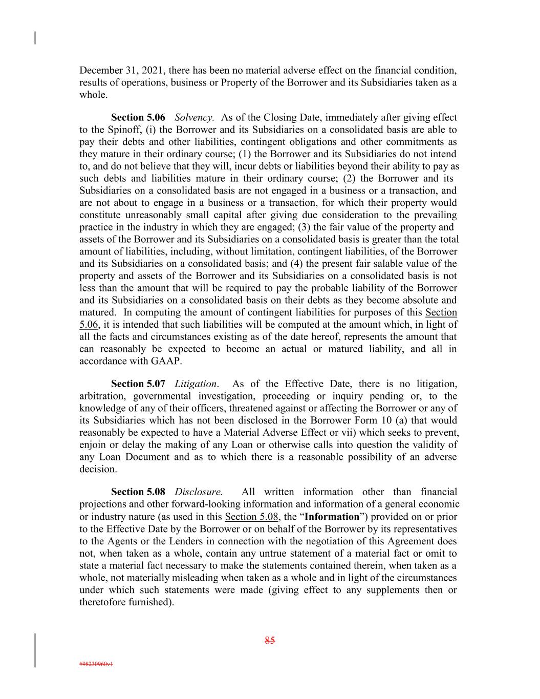 December 31, 2021, there has been no material adverse effect on the financial condition, results of operations, business or Property of the Borrower and its Subsidiaries taken as a whole. Section 5.06 Solvency. As of the Closing Date, immediately after giving effect to the Spinoff, (i) the Borrower and its Subsidiaries on a consolidated basis are able to pay their debts and other liabilities, contingent obligations and other commitments as they mature in their ordinary course; (1) the Borrower and its Subsidiaries do not intend to, and do not believe that they will, incur debts or liabilities beyond their ability to pay as such debts and liabilities mature in their ordinary course; (2) the Borrower and its Subsidiaries on a consolidated basis are not engaged in a business or a transaction, and are not about to engage in a business or a transaction, for which their property would constitute unreasonably small capital after giving due consideration to the prevailing practice in the industry in which they are engaged; (3) the fair value of the property and assets of the Borrower and its Subsidiaries on a consolidated basis is greater than the total amount of liabilities, including, without limitation, contingent liabilities, of the Borrower and its Subsidiaries on a consolidated basis; and (4) the present fair salable value of the property and assets of the Borrower and its Subsidiaries on a consolidated basis is not less than the amount that will be required to pay the probable liability of the Borrower and its Subsidiaries on a consolidated basis on their debts as they become absolute and matured. In computing the amount of contingent liabilities for purposes of this Section 5.06, it is intended that such liabilities will be computed at the amount which, in light of all the facts and circumstances existing as of the date hereof, represents the amount that can reasonably be expected to become an actual or matured liability, and all in accordance with GAAP. Section 5.07 Litigation. As of the Effective Date, there is no litigation, arbitration, governmental investigation, proceeding or inquiry pending or, to the knowledge of any of their officers, threatened against or affecting the Borrower or any of its Subsidiaries which has not been disclosed in the Borrower Form 10 (a) that would reasonably be expected to have a Material Adverse Effect or vii) which seeks to prevent, enjoin or delay the making of any Loan or otherwise calls into question the validity of any Loan Document and as to which there is a reasonable possibility of an adverse decision. Section 5.08 Disclosure. All written information other than financial projections and other forward-looking information and information of a general economic or industry nature (as used in this Section 5.08, the “Information”) provided on or prior to the Effective Date by the Borrower or on behalf of the Borrower by its representatives to the Agents or the Lenders in connection with the negotiation of this Agreement does not, when taken as a whole, contain any untrue statement of a material fact or omit to state a material fact necessary to make the statements contained therein, when taken as a whole, not materially misleading when taken as a whole and in light of the circumstances under which such statements were made (giving effect to any supplements then or theretofore furnished). 85 #98230960v1