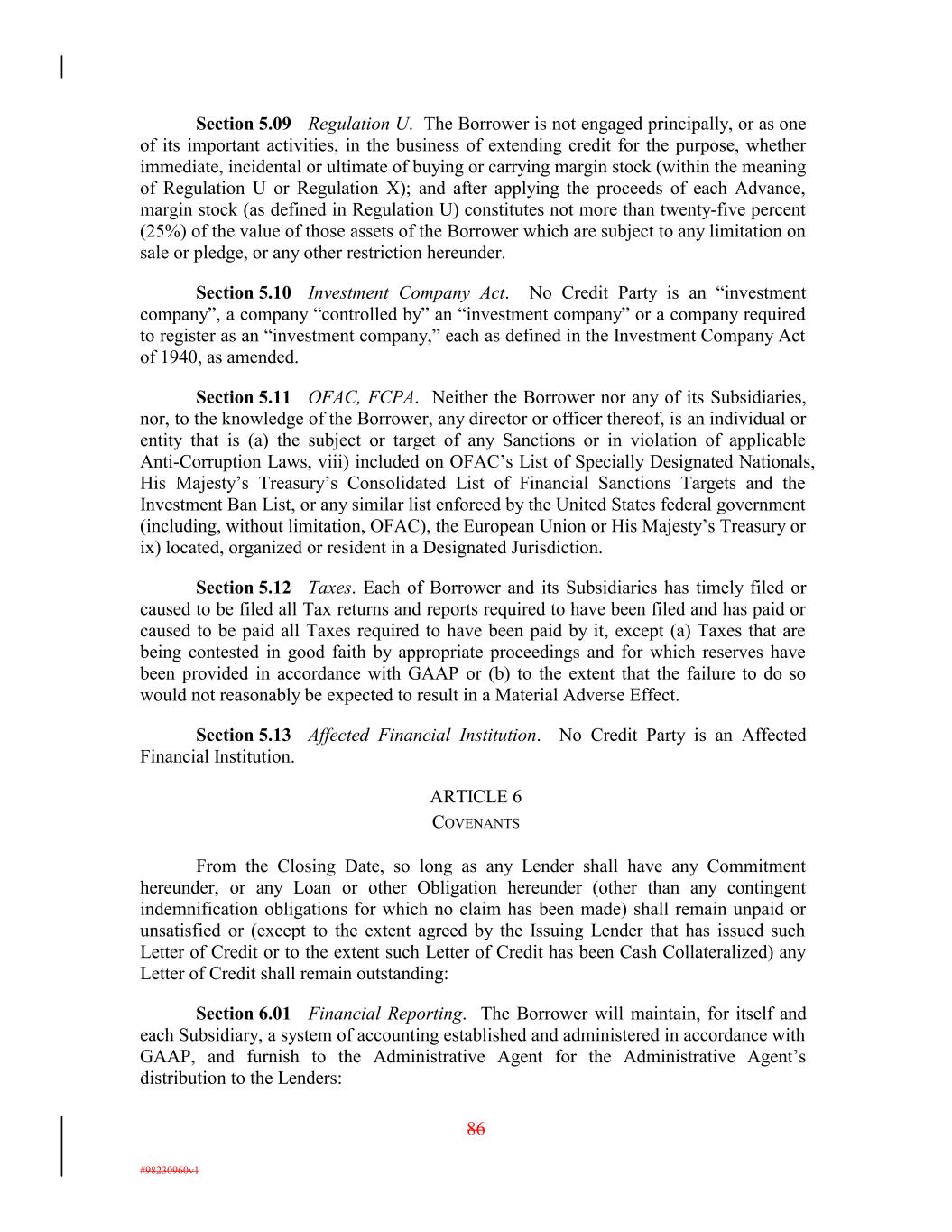 Section 5.09 Regulation U. The Borrower is not engaged principally, or as one of its important activities, in the business of extending credit for the purpose, whether immediate, incidental or ultimate of buying or carrying margin stock (within the meaning of Regulation U or Regulation X); and after applying the proceeds of each Advance, margin stock (as defined in Regulation U) constitutes not more than twenty-five percent (25%) of the value of those assets of the Borrower which are subject to any limitation on sale or pledge, or any other restriction hereunder. Section 5.10 Investment Company Act. No Credit Party is an “investment company”, a company “controlled by” an “investment company” or a company required to register as an “investment company,” each as defined in the Investment Company Act of 1940, as amended. Section 5.11 OFAC, FCPA. Neither the Borrower nor any of its Subsidiaries, nor, to the knowledge of the Borrower, any director or officer thereof, is an individual or entity that is (a) the subject or target of any Sanctions or in violation of applicable Anti-Corruption Laws, viii) included on OFAC’s List of Specially Designated Nationals, His Majesty’s Treasury’s Consolidated List of Financial Sanctions Targets and the Investment Ban List, or any similar list enforced by the United States federal government (including, without limitation, OFAC), the European Union or His Majesty’s Treasury or ix) located, organized or resident in a Designated Jurisdiction. Section 5.12 Taxes. Each of Borrower and its Subsidiaries has timely filed or caused to be filed all Tax returns and reports required to have been filed and has paid or caused to be paid all Taxes required to have been paid by it, except (a) Taxes that are being contested in good faith by appropriate proceedings and for which reserves have been provided in accordance with GAAP or (b) to the extent that the failure to do so would not reasonably be expected to result in a Material Adverse Effect. Section 5.13 Affected Financial Institution. No Credit Party is an Affected Financial Institution. ARTICLE 6 COVENANTS From the Closing Date, so long as any Lender shall have any Commitment hereunder, or any Loan or other Obligation hereunder (other than any contingent indemnification obligations for which no claim has been made) shall remain unpaid or unsatisfied or (except to the extent agreed by the Issuing Lender that has issued such Letter of Credit or to the extent such Letter of Credit has been Cash Collateralized) any Letter of Credit shall remain outstanding: Section 6.01 Financial Reporting. The Borrower will maintain, for itself and each Subsidiary, a system of accounting established and administered in accordance with GAAP, and furnish to the Administrative Agent for the Administrative Agent’s distribution to the Lenders: 86 #98230960v1
