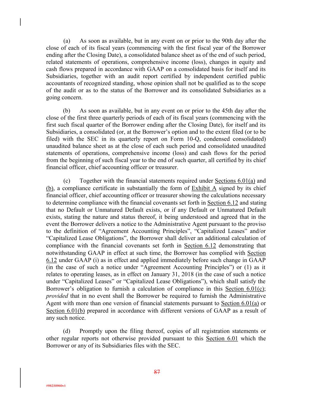 (a) As soon as available, but in any event on or prior to the 90th day after the close of each of its fiscal years (commencing with the first fiscal year of the Borrower ending after the Closing Date), a consolidated balance sheet as of the end of such period, related statements of operations, comprehensive income (loss), changes in equity and cash flows prepared in accordance with GAAP on a consolidated basis for itself and its Subsidiaries, together with an audit report certified by independent certified public accountants of recognized standing, whose opinion shall not be qualified as to the scope of the audit or as to the status of the Borrower and its consolidated Subsidiaries as a going concern. (b) As soon as available, but in any event on or prior to the 45th day after the close of the first three quarterly periods of each of its fiscal years (commencing with the first such fiscal quarter of the Borrower ending after the Closing Date), for itself and its Subsidiaries, a consolidated (or, at the Borrower’s option and to the extent filed (or to be filed) with the SEC in its quarterly report on Form 10-Q, condensed consolidated) unaudited balance sheet as at the close of each such period and consolidated unaudited statements of operations, comprehensive income (loss) and cash flows for the period from the beginning of such fiscal year to the end of such quarter, all certified by its chief financial officer, chief accounting officer or treasurer. (c) Together with the financial statements required under Sections 6.01(a) and (b), a compliance certificate in substantially the form of Exhibit A signed by its chief financial officer, chief accounting officer or treasurer showing the calculations necessary to determine compliance with the financial covenants set forth in Section 6.12 and stating that no Default or Unmatured Default exists, or if any Default or Unmatured Default exists, stating the nature and status thereof, it being understood and agreed that in the event the Borrower delivers a notice to the Administrative Agent pursuant to the proviso to the definition of “Agreement Accounting Principles”, “Capitalized Leases” and/or “Capitalized Lease Obligations”, the Borrower shall deliver an additional calculation of compliance with the financial covenants set forth in Section 6.12 demonstrating that notwithstanding GAAP in effect at such time, the Borrower has complied with Section 6.12 under GAAP (i) as in effect and applied immediately before such change in GAAP (in the case of such a notice under “Agreement Accounting Principles”) or (1) as it relates to operating leases, as in effect on January 31, 2018 (in the case of such a notice under “Capitalized Leases” or “Capitalized Lease Obligations”), which shall satisfy the Borrower’s obligation to furnish a calculation of compliance in this Section 6.01(c); provided that in no event shall the Borrower be required to furnish the Administrative Agent with more than one version of financial statements pursuant to Section 6.01(a) or Section 6.01(b) prepared in accordance with different versions of GAAP as a result of any such notice. (d) Promptly upon the filing thereof, copies of all registration statements or other regular reports not otherwise provided pursuant to this Section 6.01 which the Borrower or any of its Subsidiaries files with the SEC. 87 #98230960v1