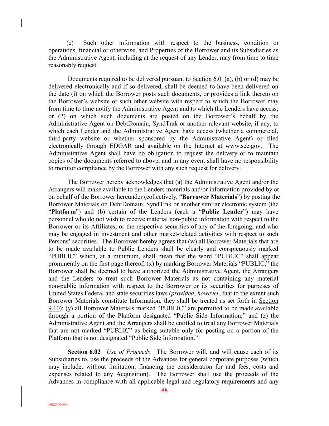 (e) Such other information with respect to the business, condition or operations, financial or otherwise, and Properties of the Borrower and its Subsidiaries as the Administrative Agent, including at the request of any Lender, may from time to time reasonably request. Documents required to be delivered pursuant to Section 6.01(a), (b) or (d) may be delivered electronically and if so delivered, shall be deemed to have been delivered on the date (i) on which the Borrower posts such documents, or provides a link thereto on the Borrower’s website or such other website with respect to which the Borrower may from time to time notify the Administrative Agent and to which the Lenders have access; or (2) on which such documents are posted on the Borrower’s behalf by the Administrative Agent on DebtDomain, SyndTrak or another relevant website, if any, to which each Lender and the Administrative Agent have access (whether a commercial, third-party website or whether sponsored by the Administrative Agent) or filed electronically through EDGAR and available on the Internet at www.sec.gov. The Administrative Agent shall have no obligation to request the delivery or to maintain copies of the documents referred to above, and in any event shall have no responsibility to monitor compliance by the Borrower with any such request for delivery. The Borrower hereby acknowledges that (a) the Administrative Agent and/or the Arrangers will make available to the Lenders materials and/or information provided by or on behalf of the Borrower hereunder (collectively, “Borrower Materials”) by posting the Borrower Materials on DebtDomain, SyndTrak or another similar electronic system (the “Platform”) and (b) certain of the Lenders (each a “Public Lender”) may have personnel who do not wish to receive material non-public information with respect to the Borrower or its Affiliates, or the respective securities of any of the foregoing, and who may be engaged in investment and other market-related activities with respect to such Persons’ securities. The Borrower hereby agrees that (w) all Borrower Materials that are to be made available to Public Lenders shall be clearly and conspicuously marked “PUBLIC” which, at a minimum, shall mean that the word “PUBLIC” shall appear prominently on the first page thereof; (x) by marking Borrower Materials “PUBLIC,” the Borrower shall be deemed to have authorized the Administrative Agent, the Arrangers and the Lenders to treat such Borrower Materials as not containing any material non-public information with respect to the Borrower or its securities for purposes of United States Federal and state securities laws (provided, however, that to the extent such Borrower Materials constitute Information, they shall be treated as set forth in Section 9.10); (y) all Borrower Materials marked “PUBLIC” are permitted to be made available through a portion of the Platform designated “Public Side Information;” and (z) the Administrative Agent and the Arrangers shall be entitled to treat any Borrower Materials that are not marked “PUBLIC” as being suitable only for posting on a portion of the Platform that is not designated “Public Side Information.” Section 6.02 Use of Proceeds. The Borrower will, and will cause each of its Subsidiaries to, use the proceeds of the Advances for general corporate purposes (which may include, without limitation, financing the consideration for and fees, costs and expenses related to any Acquisition). The Borrower shall use the proceeds of the Advances in compliance with all applicable legal and regulatory requirements and any 88 #98230960v1