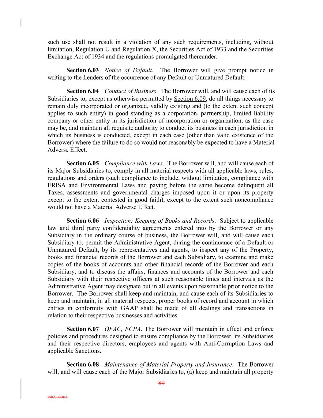 such use shall not result in a violation of any such requirements, including, without limitation, Regulation U and Regulation X, the Securities Act of 1933 and the Securities Exchange Act of 1934 and the regulations promulgated thereunder. Section 6.03 Notice of Default. The Borrower will give prompt notice in writing to the Lenders of the occurrence of any Default or Unmatured Default. Section 6.04 Conduct of Business. The Borrower will, and will cause each of its Subsidiaries to, except as otherwise permitted by Section 6.09, do all things necessary to remain duly incorporated or organized, validly existing and (to the extent such concept applies to such entity) in good standing as a corporation, partnership, limited liability company or other entity in its jurisdiction of incorporation or organization, as the case may be, and maintain all requisite authority to conduct its business in each jurisdiction in which its business is conducted, except in each case (other than valid existence of the Borrower) where the failure to do so would not reasonably be expected to have a Material Adverse Effect. Section 6.05 Compliance with Laws. The Borrower will, and will cause each of its Major Subsidiaries to, comply in all material respects with all applicable laws, rules, regulations and orders (such compliance to include, without limitation, compliance with ERISA and Environmental Laws and paying before the same become delinquent all Taxes, assessments and governmental charges imposed upon it or upon its property except to the extent contested in good faith), except to the extent such noncompliance would not have a Material Adverse Effect. Section 6.06 Inspection; Keeping of Books and Records. Subject to applicable law and third party confidentiality agreements entered into by the Borrower or any Subsidiary in the ordinary course of business, the Borrower will, and will cause each Subsidiary to, permit the Administrative Agent, during the continuance of a Default or Unmatured Default, by its representatives and agents, to inspect any of the Property, books and financial records of the Borrower and each Subsidiary, to examine and make copies of the books of accounts and other financial records of the Borrower and each Subsidiary, and to discuss the affairs, finances and accounts of the Borrower and each Subsidiary with their respective officers at such reasonable times and intervals as the Administrative Agent may designate but in all events upon reasonable prior notice to the Borrower. The Borrower shall keep and maintain, and cause each of its Subsidiaries to keep and maintain, in all material respects, proper books of record and account in which entries in conformity with GAAP shall be made of all dealings and transactions in relation to their respective businesses and activities. Section 6.07 OFAC, FCPA. The Borrower will maintain in effect and enforce policies and procedures designed to ensure compliance by the Borrower, its Subsidiaries and their respective directors, employees and agents with Anti-Corruption Laws and applicable Sanctions. Section 6.08 Maintenance of Material Property and Insurance. The Borrower will, and will cause each of the Major Subsidiaries to, (a) keep and maintain all property 89 #98230960v1