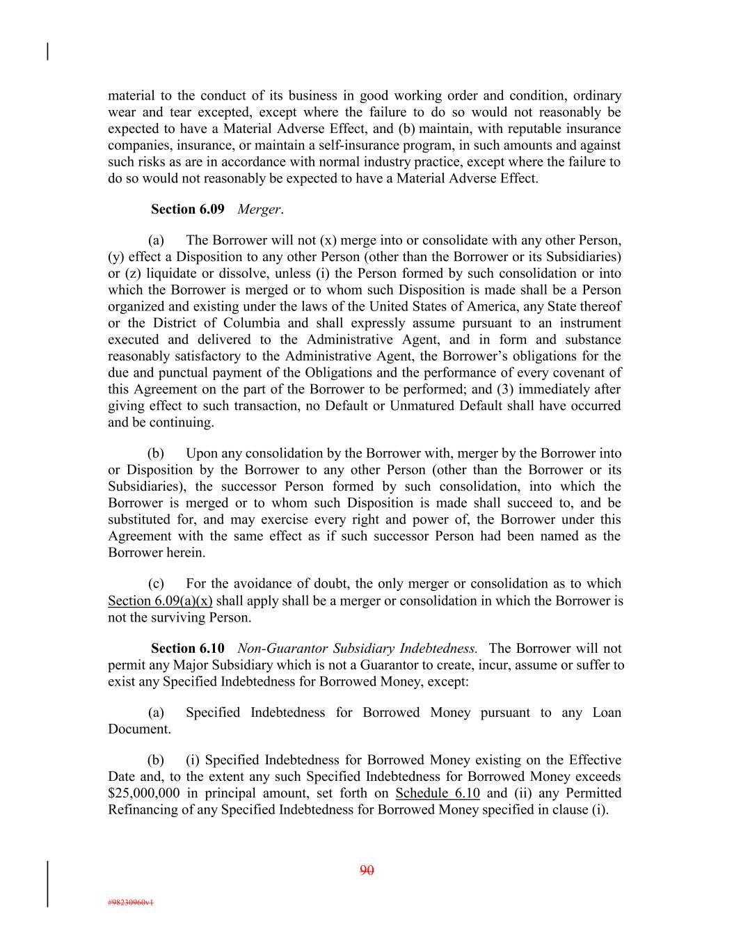material to the conduct of its business in good working order and condition, ordinary wear and tear excepted, except where the failure to do so would not reasonably be expected to have a Material Adverse Effect, and (b) maintain, with reputable insurance companies, insurance, or maintain a self-insurance program, in such amounts and against such risks as are in accordance with normal industry practice, except where the failure to do so would not reasonably be expected to have a Material Adverse Effect. Section 6.09 Merger. (a) The Borrower will not (x) merge into or consolidate with any other Person, (y) effect a Disposition to any other Person (other than the Borrower or its Subsidiaries) or (z) liquidate or dissolve, unless (i) the Person formed by such consolidation or into which the Borrower is merged or to whom such Disposition is made shall be a Person organized and existing under the laws of the United States of America, any State thereof or the District of Columbia and shall expressly assume pursuant to an instrument executed and delivered to the Administrative Agent, and in form and substance reasonably satisfactory to the Administrative Agent, the Borrower’s obligations for the due and punctual payment of the Obligations and the performance of every covenant of this Agreement on the part of the Borrower to be performed; and (3) immediately after giving effect to such transaction, no Default or Unmatured Default shall have occurred and be continuing. (b) Upon any consolidation by the Borrower with, merger by the Borrower into or Disposition by the Borrower to any other Person (other than the Borrower or its Subsidiaries), the successor Person formed by such consolidation, into which the Borrower is merged or to whom such Disposition is made shall succeed to, and be substituted for, and may exercise every right and power of, the Borrower under this Agreement with the same effect as if such successor Person had been named as the Borrower herein. (c) For the avoidance of doubt, the only merger or consolidation as to which Section 6.09(a)(x) shall apply shall be a merger or consolidation in which the Borrower is not the surviving Person. Section 6.10 Non-Guarantor Subsidiary Indebtedness. The Borrower will not permit any Major Subsidiary which is not a Guarantor to create, incur, assume or suffer to exist any Specified Indebtedness for Borrowed Money, except: (a) Specified Indebtedness for Borrowed Money pursuant to any Loan Document. (b) (i) Specified Indebtedness for Borrowed Money existing on the Effective Date and, to the extent any such Specified Indebtedness for Borrowed Money exceeds $25,000,000 in principal amount, set forth on Schedule 6.10 and (ii) any Permitted Refinancing of any Specified Indebtedness for Borrowed Money specified in clause (i). 90 #98230960v1