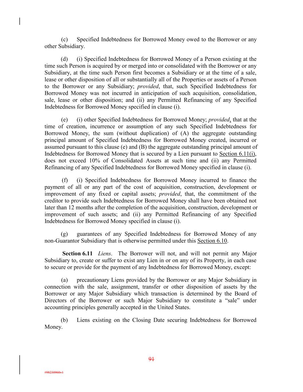 (c) Specified Indebtedness for Borrowed Money owed to the Borrower or any other Subsidiary. (d) (i) Specified Indebtedness for Borrowed Money of a Person existing at the time such Person is acquired by or merged into or consolidated with the Borrower or any Subsidiary, at the time such Person first becomes a Subsidiary or at the time of a sale, lease or other disposition of all or substantially all of the Properties or assets of a Person to the Borrower or any Subsidiary; provided, that, such Specified Indebtedness for Borrowed Money was not incurred in anticipation of such acquisition, consolidation, sale, lease or other disposition; and (ii) any Permitted Refinancing of any Specified Indebtedness for Borrowed Money specified in clause (i). (e) (i) other Specified Indebtedness for Borrowed Money; provided, that at the time of creation, incurrence or assumption of any such Specified Indebtedness for Borrowed Money, the sum (without duplication) of (A) the aggregate outstanding principal amount of Specified Indebtedness for Borrowed Money created, incurred or assumed pursuant to this clause (e) and (B) the aggregate outstanding principal amount of Indebtedness for Borrowed Money that is secured by a Lien pursuant to Section 6.11(i), does not exceed 10% of Consolidated Assets at such time and (ii) any Permitted Refinancing of any Specified Indebtedness for Borrowed Money specified in clause (i). (f) (i) Specified Indebtedness for Borrowed Money incurred to finance the payment of all or any part of the cost of acquisition, construction, development or improvement of any fixed or capital assets; provided, that, the commitment of the creditor to provide such Indebtedness for Borrowed Money shall have been obtained not later than 12 months after the completion of the acquisition, construction, development or improvement of such assets; and (ii) any Permitted Refinancing of any Specified Indebtedness for Borrowed Money specified in clause (i). (g) guarantees of any Specified Indebtedness for Borrowed Money of any non-Guarantor Subsidiary that is otherwise permitted under this Section 6.10. Section 6.11 Liens. The Borrower will not, and will not permit any Major Subsidiary to, create or suffer to exist any Lien in or on any of its Property, in each case to secure or provide for the payment of any Indebtedness for Borrowed Money, except: (a) precautionary Liens provided by the Borrower or any Major Subsidiary in connection with the sale, assignment, transfer or other disposition of assets by the Borrower or any Major Subsidiary which transaction is determined by the Board of Directors of the Borrower or such Major Subsidiary to constitute a “sale” under accounting principles generally accepted in the United States. (b) Liens existing on the Closing Date securing Indebtedness for Borrowed Money. 91 #98230960v1