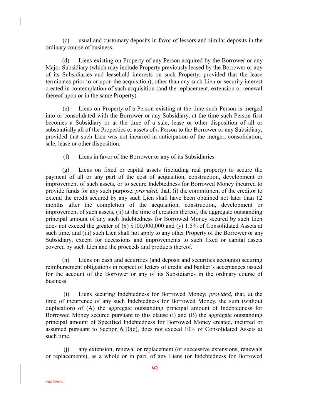 (c) usual and customary deposits in favor of lessors and similar deposits in the ordinary course of business. (d) Liens existing on Property of any Person acquired by the Borrower or any Major Subsidiary (which may include Property previously leased by the Borrower or any of its Subsidiaries and leasehold interests on such Property, provided that the lease terminates prior to or upon the acquisition), other than any such Lien or security interest created in contemplation of such acquisition (and the replacement, extension or renewal thereof upon or in the same Property). (e) Liens on Property of a Person existing at the time such Person is merged into or consolidated with the Borrower or any Subsidiary, at the time such Person first becomes a Subsidiary or at the time of a sale, lease or other disposition of all or substantially all of the Properties or assets of a Person to the Borrower or any Subsidiary, provided that such Lien was not incurred in anticipation of the merger, consolidation, sale, lease or other disposition. (f) Liens in favor of the Borrower or any of its Subsidiaries. (g) Liens on fixed or capital assets (including real property) to secure the payment of all or any part of the cost of acquisition, construction, development or improvement of such assets, or to secure Indebtedness for Borrowed Money incurred to provide funds for any such purpose; provided, that, (i) the commitment of the creditor to extend the credit secured by any such Lien shall have been obtained not later than 12 months after the completion of the acquisition, construction, development or improvement of such assets, (ii) at the time of creation thereof, the aggregate outstanding principal amount of any such Indebtedness for Borrowed Money secured by such Lien does not exceed the greater of (x) $100,000,000 and (y) 1.5% of Consolidated Assets at such time, and (iii) such Lien shall not apply to any other Property of the Borrower or any Subsidiary, except for accessions and improvements to such fixed or capital assets covered by such Lien and the proceeds and products thereof. (h) Liens on cash and securities (and deposit and securities accounts) securing reimbursement obligations in respect of letters of credit and banker’s acceptances issued for the account of the Borrower or any of its Subsidiaries in the ordinary course of business. (i) Liens securing Indebtedness for Borrowed Money; provided, that, at the time of incurrence of any such Indebtedness for Borrowed Money, the sum (without duplication) of (A) the aggregate outstanding principal amount of Indebtedness for Borrowed Money secured pursuant to this clause (i) and (B) the aggregate outstanding principal amount of Specified Indebtedness for Borrowed Money created, incurred or assumed pursuant to Section 6.10(e), does not exceed 10% of Consolidated Assets at such time. (j) any extension, renewal or replacement (or successive extensions, renewals or replacements), as a whole or in part, of any Liens (or Indebtedness for Borrowed 92 #98230960v1
