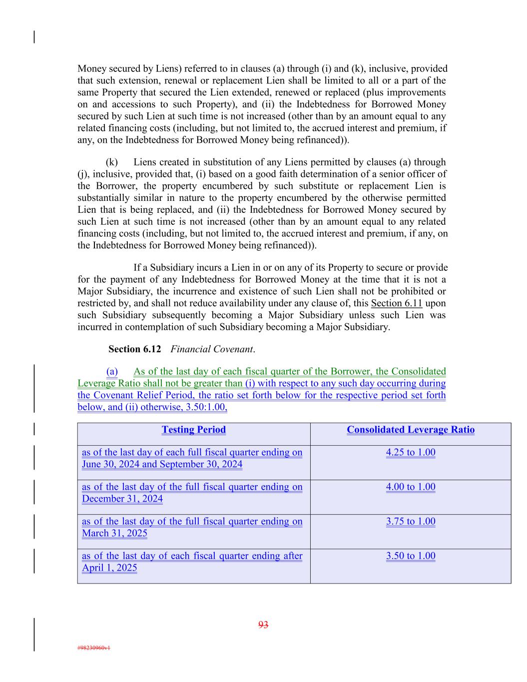 93 #98230960v1 as of the last day of the full fiscal quarter ending on December 31, 2024 Consolidated Leverage Ratio 4.00 to 1.00 Money secured by Liens) referred to in clauses (a) through (i) and (k), inclusive, provided that such extension, renewal or replacement Lien shall be limited to all or a part of the same Property that secured the Lien extended, renewed or replaced (plus improvements on and accessions to such Property), and (ii) the Indebtedness for Borrowed Money secured by such Lien at such time is not increased (other than by an amount equal to any related financing costs (including, but not limited to, the accrued interest and premium, if any, on the Indebtedness for Borrowed Money being refinanced)). (k) Liens created in substitution of any Liens permitted by clauses (a) through (j), inclusive, provided that, (i) based on a good faith determination of a senior officer of the Borrower, the property encumbered by such substitute or replacement Lien is substantially similar in nature to the property encumbered by the otherwise permitted Lien that is being replaced, and (ii) the Indebtedness for Borrowed Money secured by such Lien at such time is not increased (other than by an amount equal to any related financing costs (including, but not limited to, the accrued interest and premium, if any, on the Indebtedness for Borrowed Money being refinanced)). If a Subsidiary incurs a Lien in or on any of its Property to secure or provide for the payment of any Indebtedness for Borrowed Money at the time that it is not a Major Subsidiary, the incurrence and existence of such Lien shall not be prohibited or restricted by, and shall not reduce availability under any clause of, this Section 6.11 upon such Subsidiary subsequently becoming a Major Subsidiary unless such Lien was incurred in contemplation of such Subsidiary becoming a Major Subsidiary. Section 6.12 Financial Covenant. (a) As of the last day of each fiscal quarter of the Borrower, the Consolidated Leverage Ratio shall not be greater than (i) with respect to any such day occurring during the Covenant Relief Period, the ratio set forth below for the respective period set forth below, and (ii) otherwise, 3.50:1.00, as of the last day of the full fiscal quarter ending on March 31, 2025 3.75 to 1.00 as of the last day of each full fiscal quarter ending on June 30, 2024 and September 30, 2024 as of the last day of each fiscal quarter ending after April 1, 2025 4.25 to 1.00 3.50 to 1.00 Testing Period